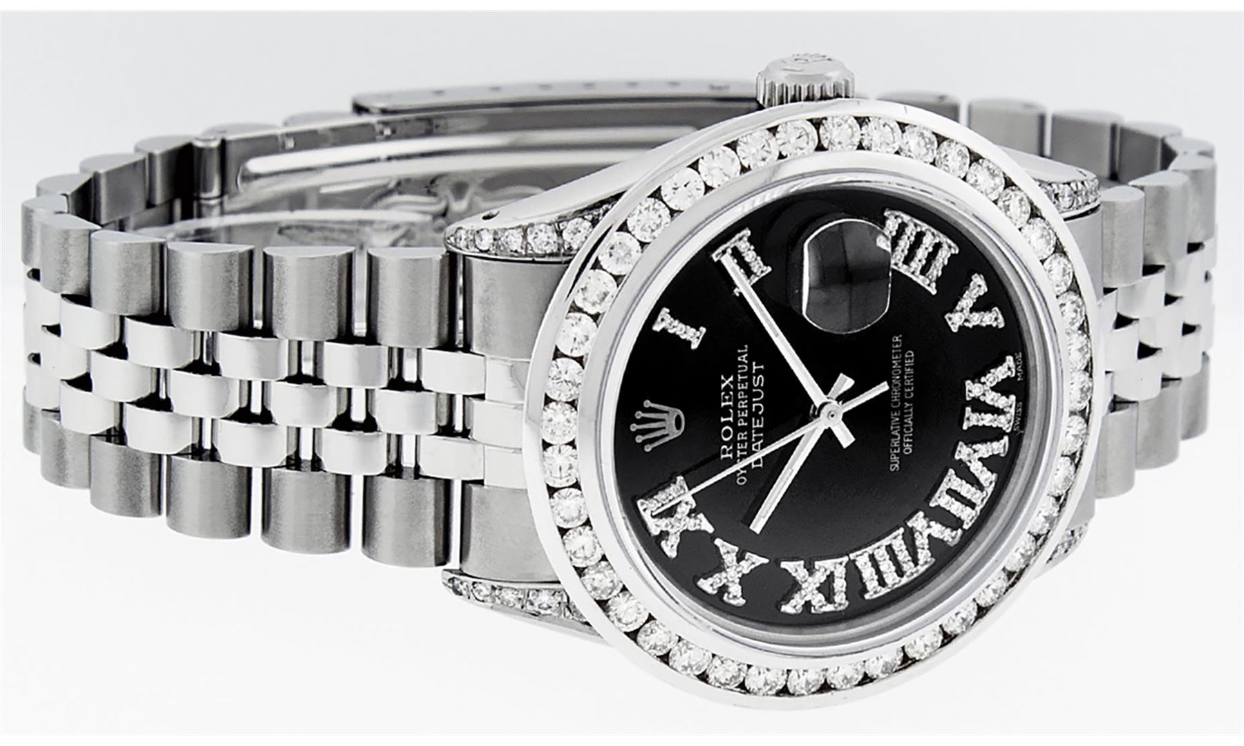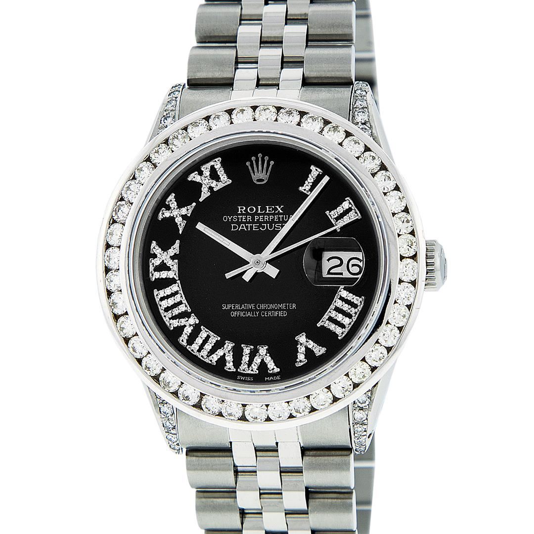 One Mens Stainless Steel Rolex Datejust Polished Bright with Satin Finish, Serviced & Electronically Tested, Stainless Steel Case: 36mm, Diamond Lugs: 24 Diamonds On Lugs, Color: G to H, Clarity: SI-VS. Stainless Steel Crown, New Custom Bezel: 18K White Gold 3.00 Ctw Diamond Bezel, Diamond Count: 40 Diamonds, Total Weight 3.0 Carat, Clarity: SI-VS, Color: G to H. Custom Crystal: New Scratch Resistant Synthetic Sapphire Cyclops Lens. Movement: Automatic Winding Movement. Custom Dial: Black Roman Diamond Dial, Diamond Color: G To H In Color, Clarity: SI-VS. Date Window: 3 O'Clock Position Date Display, Quickset, Model: Quickset Datejust, Condition: G-6 Extra Fine. Bracelet: Stainless Steel Jubilee Band. Bright Polish & Satin Finish. 7.0 Inch Length, Adjustable. Standard Clasp, With Rolex Logo. This Watch Has Been Serviced Time Tested And Is In Excellent Condition It Is Free Of All Scratches And Dents. This Watch Also Comes With A Brand New Wooden Watch Winder.