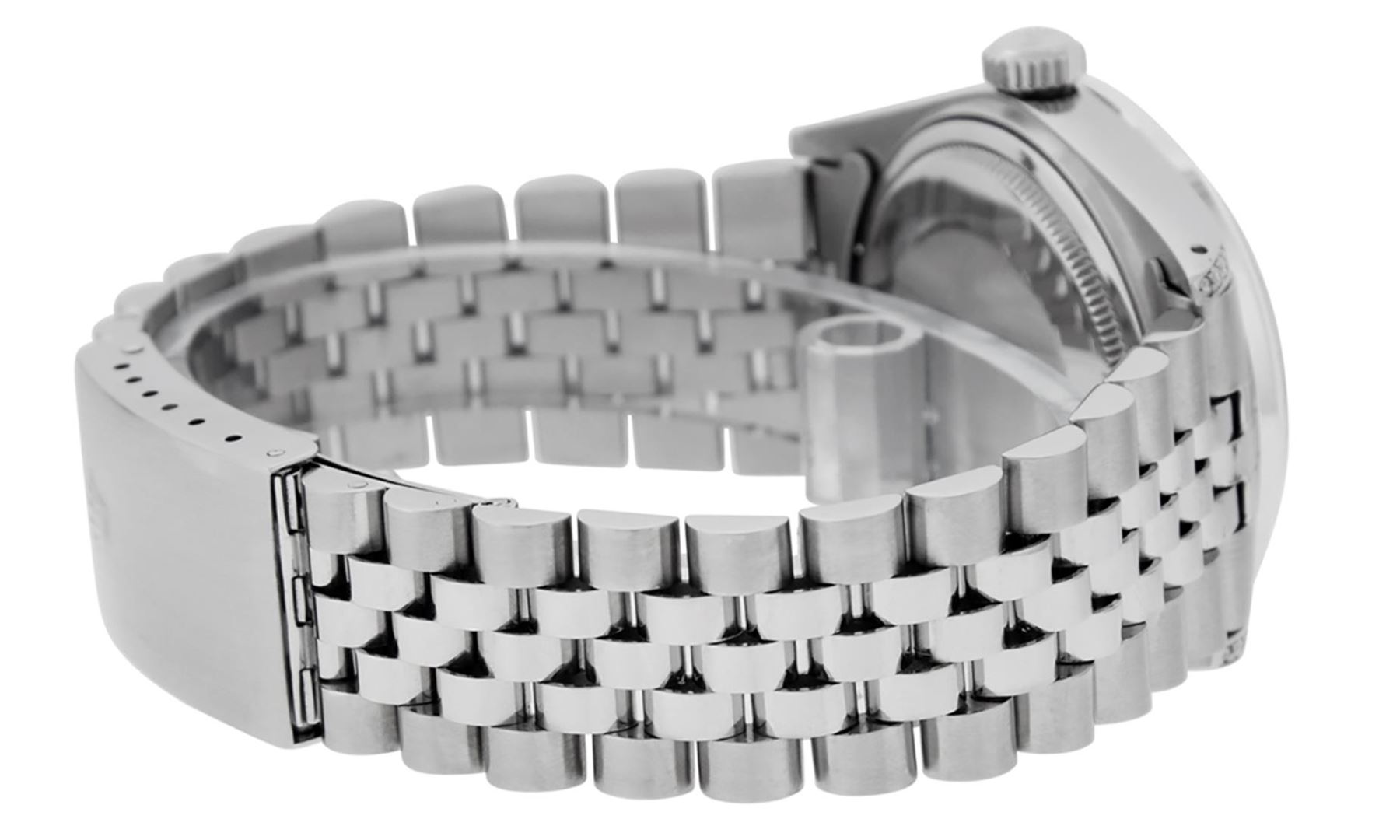One Mens Pre Owned Stainless Steel Rolex Quickset Datejust Polished Bright with Satin Finish, Serviced And Electronically Tested, Stainless Steel Case: 36mm, Custom Diamond Lugs: 24 Diamonds On Lugs. Stainless Steel Crown, New Custom Bezel: 18K White Gold Beadset + Sapphire Diamond Bezel, Diamond Count: 36 Diamonds + 4 Sapphires On Bezel. Custom Crystal: New Sapphire With Date Window. Rolex Movement: Automatic Winding Movement 3035. Custom Dial: Custom Black Dial With Added Roman Diamond Hour Markers. Date Window: 3 O'Clock Position Date Display, Quickset, Model: Quickset Datejust, Condition: G-6 Extra Fine. Rolex Bracelet: Stainless Steel Jubilee Band. Bright Polish And Satin Finish. 7.0 Inch Length, Adjustable. Standard Clasp, With Rolex Logo. This Watch Has Been Serviced Time Tested And Is In Excellent Condition It Is Free Of All Scratches And Dents.