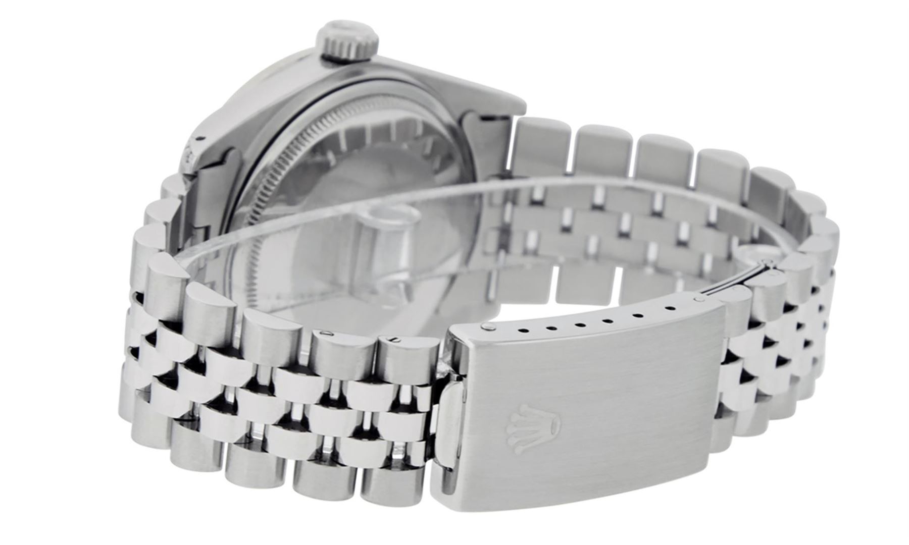 One Mens Pre Owned Stainless Steel Rolex Datejust Polished Bright with Satin Finish, Serviced & Electronically Tested, Rolex Stainless Steel Case: 36mm, Custom Added Diamond Lugs: 24 Diamonds On Lugs, Color: G to H, Clarity: SI-VS. Rolex Stainless Steel Crown, New Custom Bezel: 18K White Gold Bead set Diamond Bezel, Diamond Count: 44 Diamonds On Bezel, Clarity: SI-VS, Color: G to H. Custom Crystal: New Sapphire With Magnified Date Window. Rolex Movement: Automatic Winding Movement. Custom Dial: Refinished To Black With Custom Added Roman Diamonds, Diamond Color: G To H In Color, Clarity: SI-VS. Date Window: 3 O'clock Position Date Display, Quickset, Model: Quickset Datejust, Condition: G-6 Extra Fine. Rolex Bracelet: Stainless Steel Jubilee Band. Bright Polish & Satin Finish. 7.0 Inch Length, Adjustable. Standard Clasp, With Rolex Logo. This Watch Has Been Serviced Time Tested And Is In Excellent Condition It Is Free Of All Scratches And Dents.