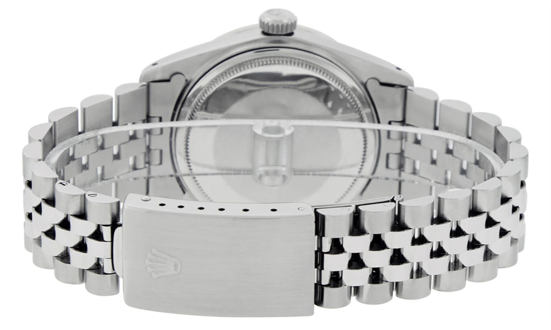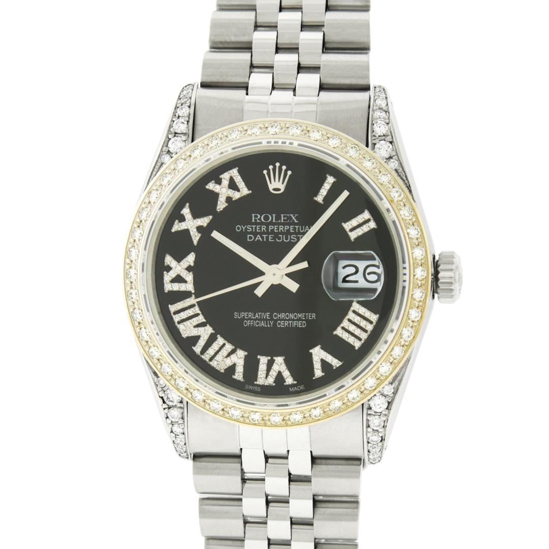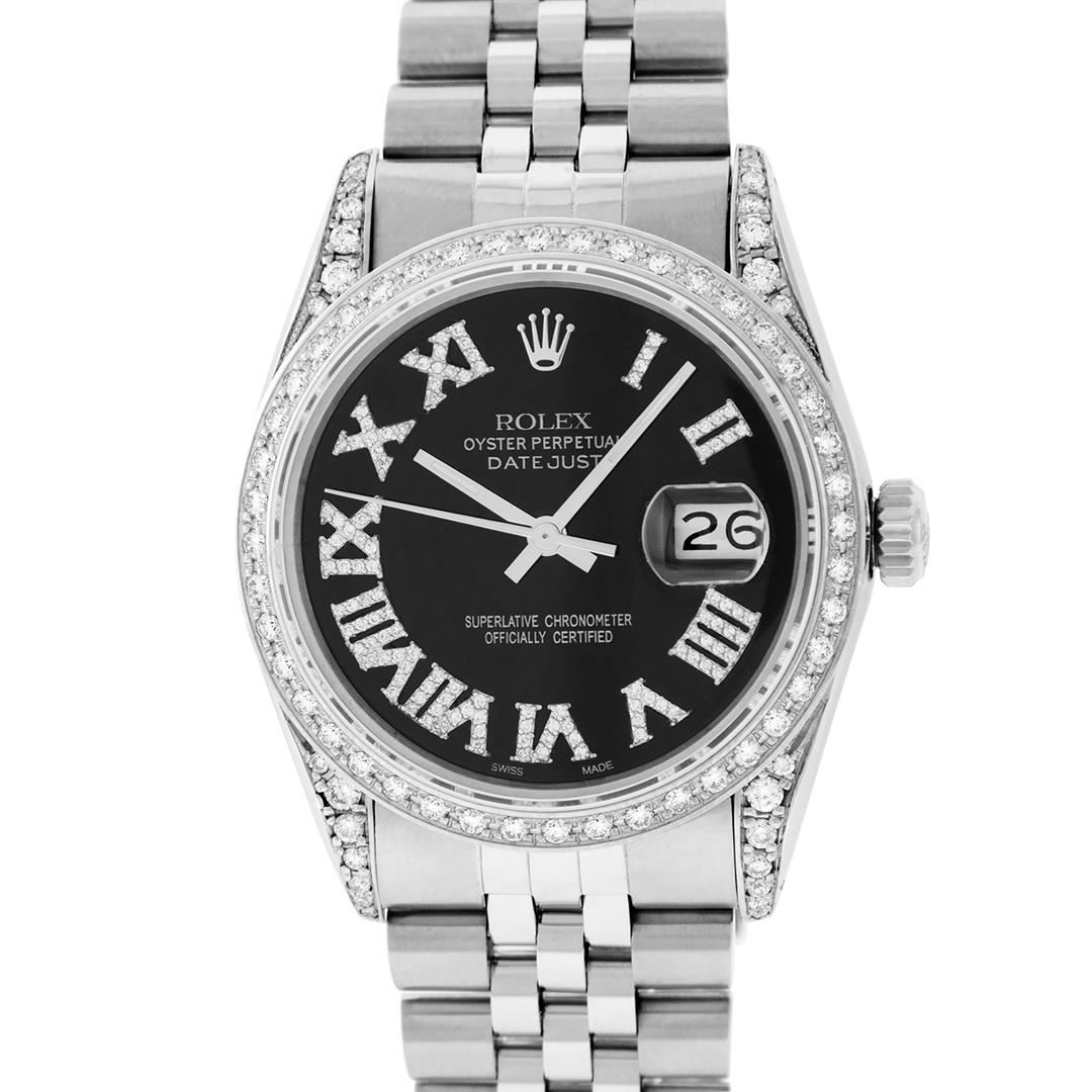 One Mens Pre Owned Stainless Steel Rolex Datejust Polished Bright with Satin Finish, Serviced & Electronically Tested, Rolex Stainless Steel Case: 36mm, Custom Added Diamond Lugs: 24 Diamonds On Lugs, Color: G to H, Clarity: SI-VS. Rolex Stainless Steel Crown, New Custom Bezel: 18K White Gold Bead set Diamond Bezel, Diamond Count: 44 Diamonds On Bezel, Clarity: SI-VS, Color: G to H. Custom Crystal: New Sapphire With Magnified Date Window. Rolex Movement: Automatic Winding Movement. Custom Dial: Refinished To Black With Custom Added Roman Diamonds, Diamond Color: G To H In Color, Clarity: SI-VS. Date Window: 3 O'clock Position Date Display, Quickset, Model: Quickset Datejust, Condition: G-6 Extra Fine. Rolex Bracelet: Stainless Steel Jubilee Band. Bright Polish & Satin Finish. 7.0 Inch Length, Adjustable. Standard Clasp, With Rolex Logo. This Watch Has Been Serviced Time Tested And Is In Excellent Condition It Is Free Of All Scratches And Dents.