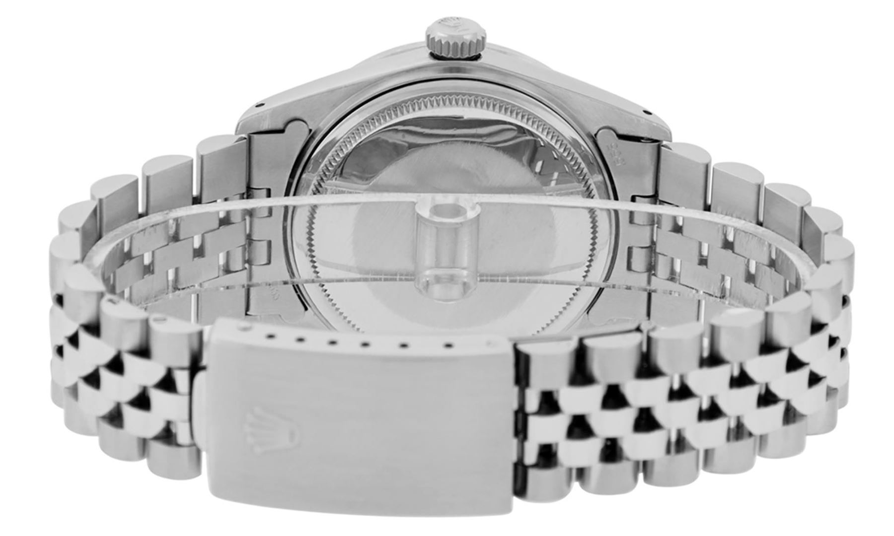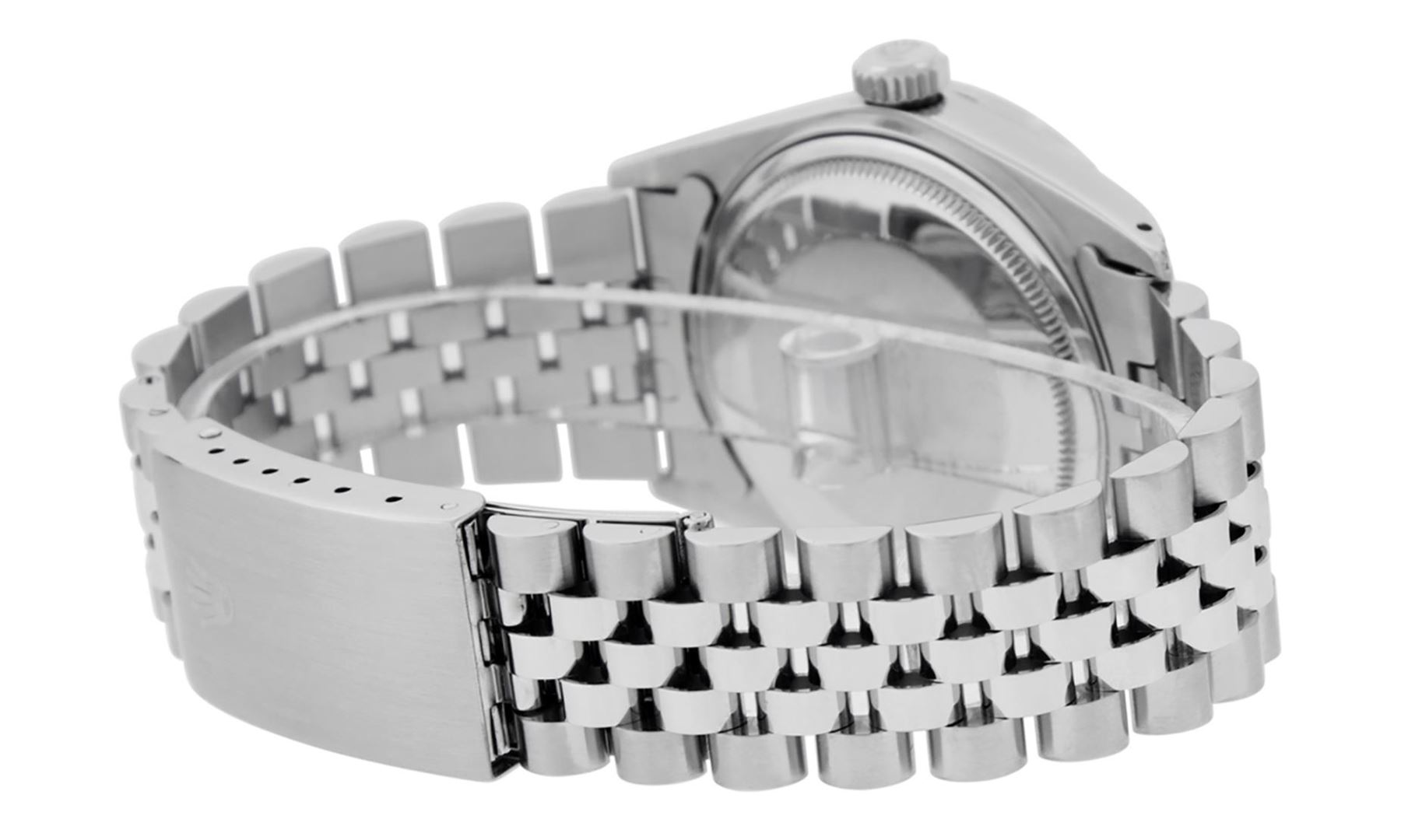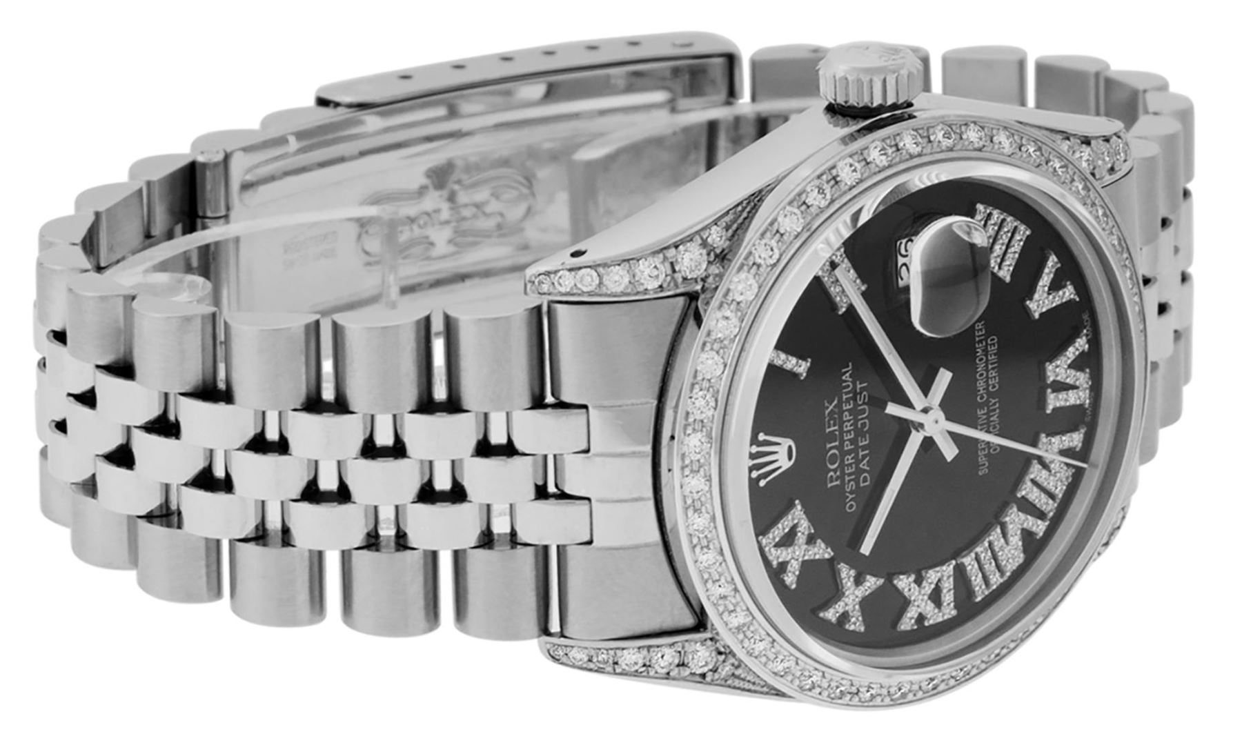One Mens Pre Owned Stainless Steel Rolex Datejust Polished Bright with Satin Finish, Serviced And Electronically Tested, Rolex Stainless Steel Case: 36mm, Custom Diamond Lugs: 24 Added Diamonds On Lugs. Rolex Stainless Steel Crown, New Custom Bezel: 18K White Gold Beadset Diamond Bezel, Diamond Count: 44 Diamonds On Bezel. Custom Crystal: New Sapphire With Magnified Date Window. Rolex Movement: Automatic Winding Movement 3035. Custom Dial: Custom Black Dial With Added Roman Diamonds. Date Window: 3 O'Clock Position Date Display, Quickset, Model: Quickset Datejust, Condition: G-6 Extra Fine. Rolex Bracelet: Stainless Steel Jubilee Band. Bright Polish And Satin Finish. 7.0 Inch Length, Adjustable. Standard Clasp, With Rolex Logo. This Watch Has Been Serviced Time Tested And Is In Excellent Condition It Is Free Of All Scratches And Dents.