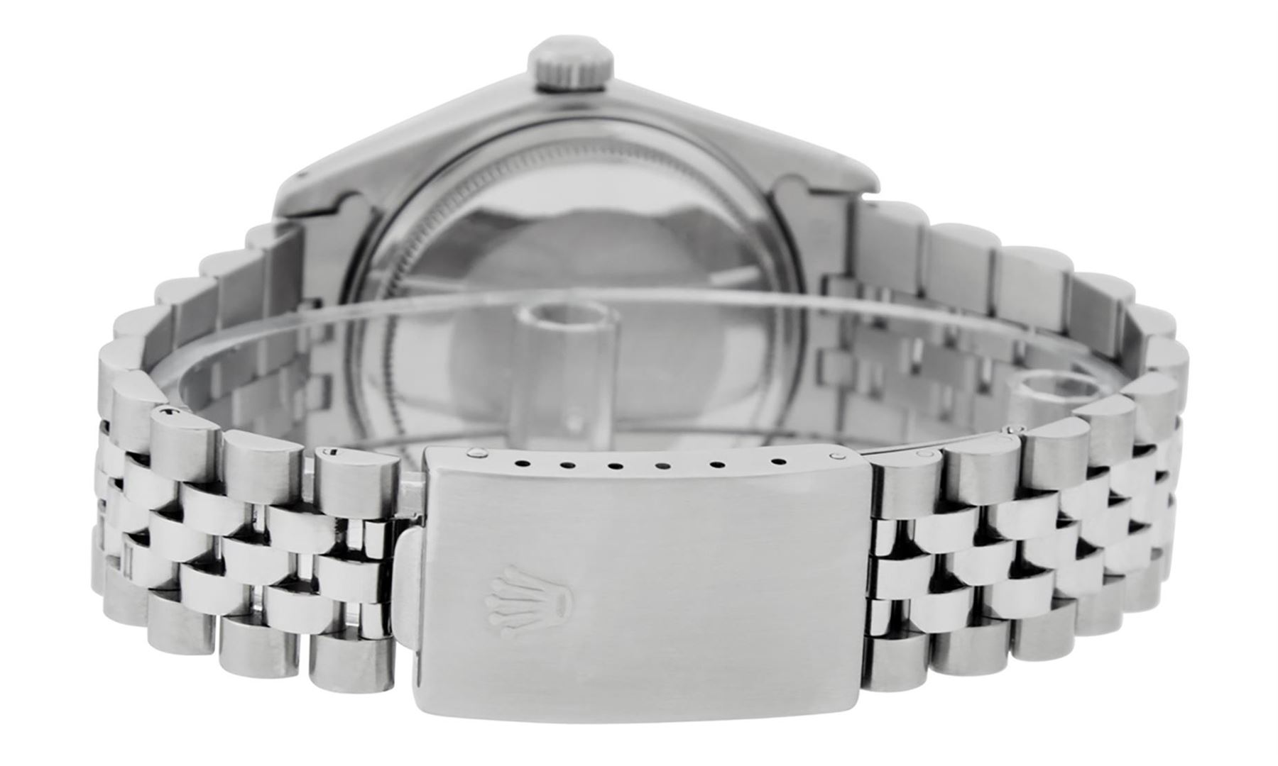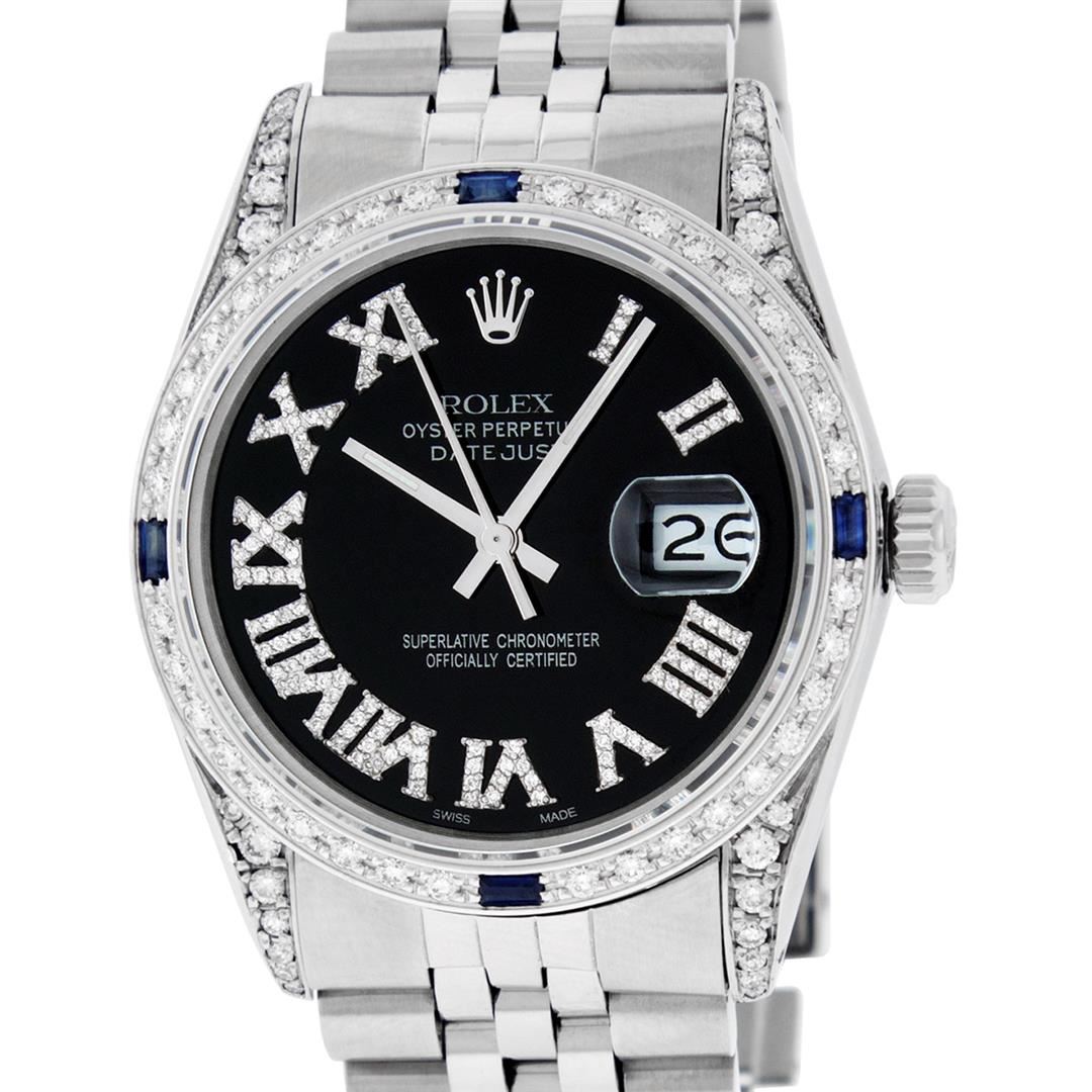 One Mens Stainless Steel Rolex Quickset Datejust Polished Bright with Satin Finish, Serviced & Electronically Tested, Stainless Steel Case: 36mm, Custom Diamond Lugs: 24 Diamonds On Lugs, Color: G to H, Clarity: SI-VS. Stainless Steel Crown, New Custom Bezel: 18K White Gold Beadset + Sapphire Diamond Bezel, Diamond Count: 36 Diamonds + 4 Sapphires On Bezel, Total Bezel Weight 1.00 Carat, Clarity: SI-VS, Color: G to H. Custom Crystal: New Scratch Resistant Synthetic Sapphire Cyclops Lens. Movement: Automatic Winding Movement. Custom Dial: Black Roman Diamond Dial, Diamond Color: G To H In Color, Clarity: SI-VS. Date Window: 3 O'Clock Position Date Display, Quickset, Model: Quickset Datejust, Condition: G-6 Extra Fine. Bracelet: Stainless Steel Jubilee Band. Bright Polish & Satin Finish. 7.0 Inch Length, Adjustable. Standard Clasp, With Rolex Logo. This Watch Has Been Serviced Time Tested And Is In Excellent Condition It Is Free Of All Scratches And Dents.