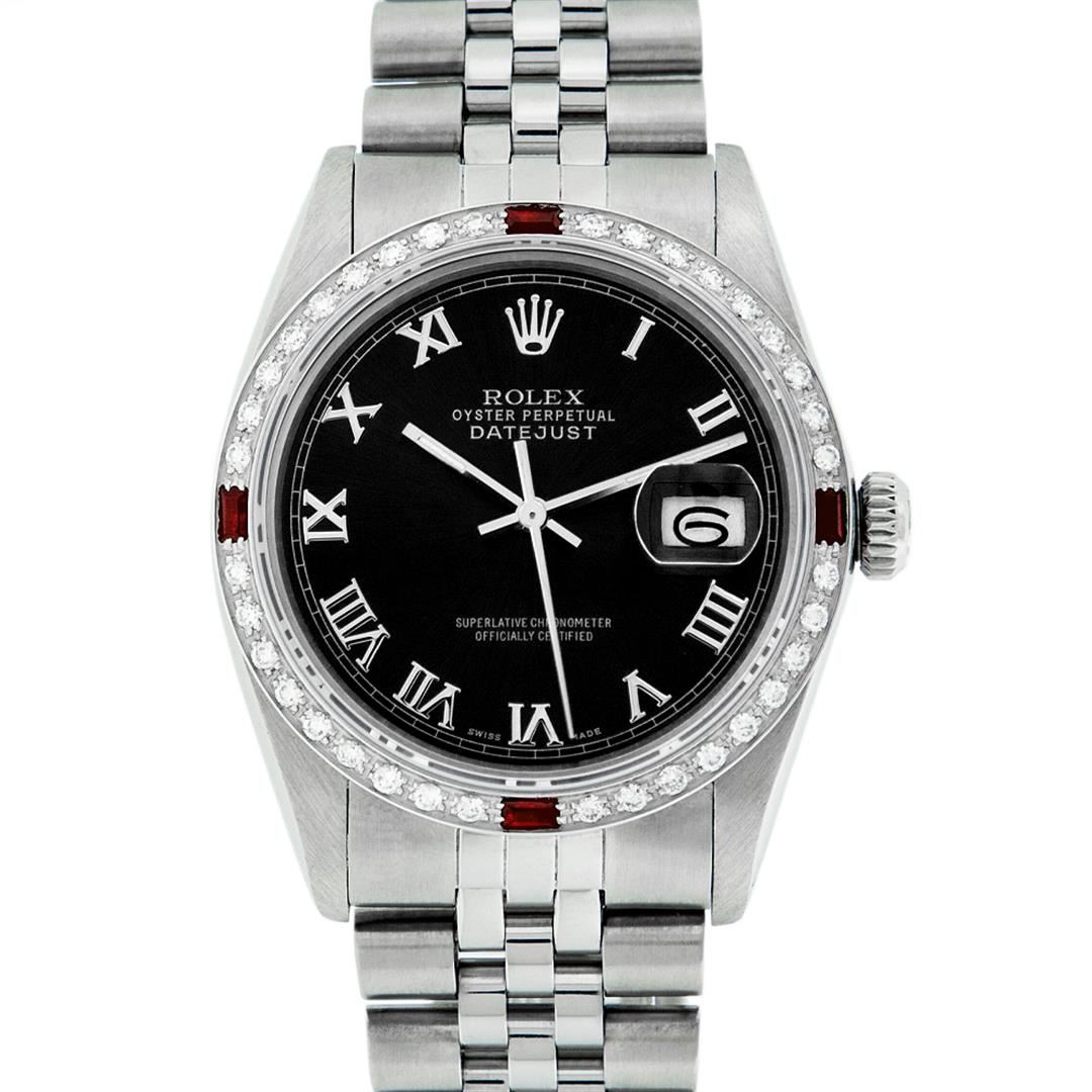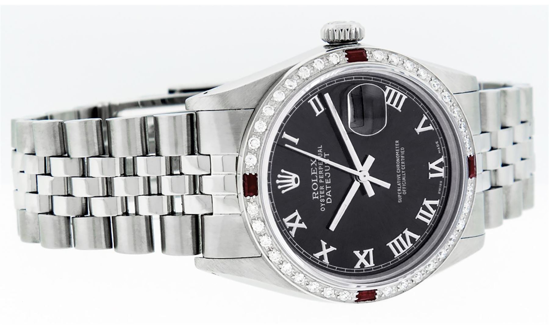 One Mens Pre Owned Stainless Steel Rolex Datejust Polished Bright with Satin Finish, Rolex Stainless Steel Case: 36mm, Rolex Stainless Steel Crown, Custom Bezel: New 18K White Gold Ruby Beadset Diamond Bezel With Added Diamonds And Rubies, Diamond + Gem Count: 36 Diamonds + 4 Rubies, Total Weight 1.00 Carat, Clarity: SI-VS, Color: G to H. Custom Crystal: New Scratch Resistant Synthetic Sapphire Cyclops Lens. Custom Hands: New Luminescent Hands. Rolex Movement: Automatic Winding Movement. Rolex Dial: Black With Roman Track. Date Window: 3 O'Clock Position Date Display, Quickset, Model: Datejust, Condition: G-6 Extra Fine. Rolex Bracelet: Stainless Steel Jubilee Band. Bracelet: 7.0 Inch Length, Adjustable. Standard Clasp, With Rolex Logo. This Watch Has Been Serviced Time Tested And Is In Excellent Condition It Is Free Of All Scratches And Dents.