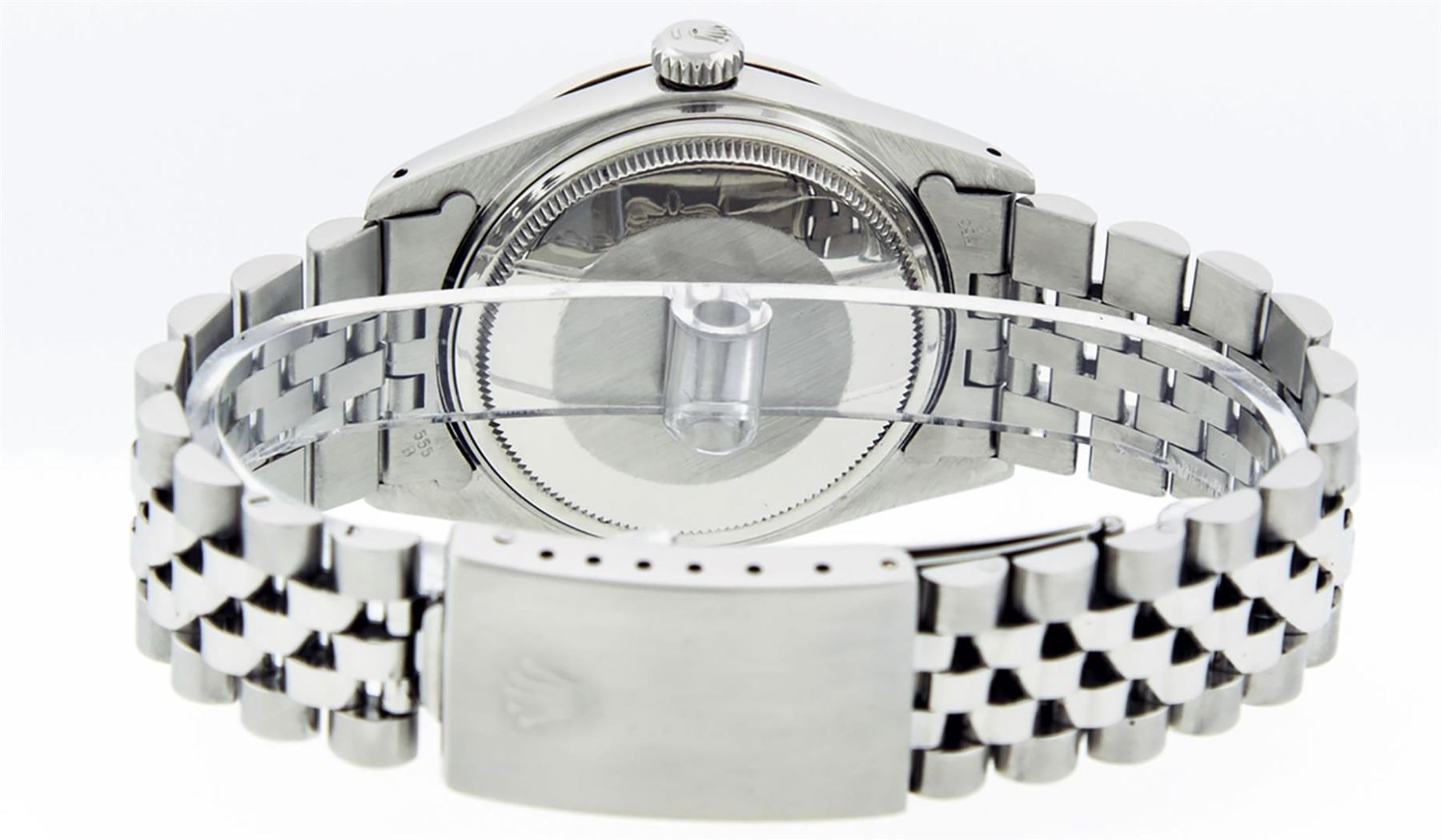 One Mens Pre Owned Stainless Steel Rolex Datejust Polished Bright with Satin Finish, Rolex Stainless Steel Case: 36mm, Rolex Stainless Steel Crown, Custom Bezel: New 18K White Gold Ruby Beadset Diamond Bezel With Added Diamonds And Rubies, Diamond + Gem Count: 36 Diamonds + 4 Rubies, Total Weight 1.00 Carat, Clarity: SI-VS, Color: G to H. Custom Crystal: New Sapphire With Magnified Date Window. Custom Hands: New Luminescent Hands. Rolex Movement: Automatic Winding Movement 3035. Custom Dial: Refinished To Black With Roman Hour Markers With Square Track. Date Window: 3 O'Clock Position Date Display, Quickset, Model: Datejust, Condition: G-6 Extra Fine. Rolex Bracelet: Stainless Steel Jubilee Band. Bracelet: 7.0 Inch Length, Adjustable. Standard Clasp, With Rolex Logo. This Watch Has Been Serviced Time Tested And Is In Excellent Condition It Is Free Of All Scratches And Dents.