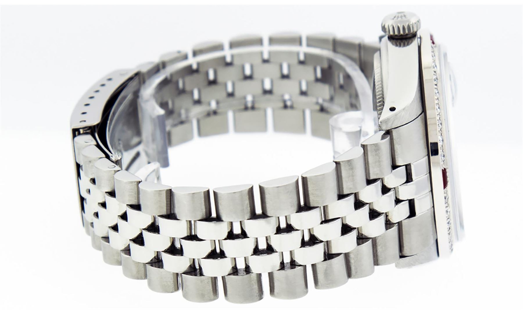 One Mens Pre Owned Stainless Steel Rolex Datejust Polished Bright with Satin Finish, Rolex Stainless Steel Case: 36mm, Rolex Stainless Steel Crown, Custom Bezel: New 18K White Gold Ruby Beadset Diamond Bezel With Added Diamonds And Rubies, Diamond + Gem Count: 36 Diamonds + 4 Rubies, Total Weight 1.00 Carat, Clarity: SI-VS, Color: G to H. Custom Crystal: New Sapphire With Magnified Date Window. Custom Hands: New Luminescent Hands. Rolex Movement: Automatic Winding Movement 3035. Custom Dial: Refinished To Black With Roman Hour Markers With Square Track. Date Window: 3 O'Clock Position Date Display, Quickset, Model: Datejust, Condition: G-6 Extra Fine. Rolex Bracelet: Stainless Steel Jubilee Band. Bracelet: 7.0 Inch Length, Adjustable. Standard Clasp, With Rolex Logo. This Watch Has Been Serviced Time Tested And Is In Excellent Condition It Is Free Of All Scratches And Dents.