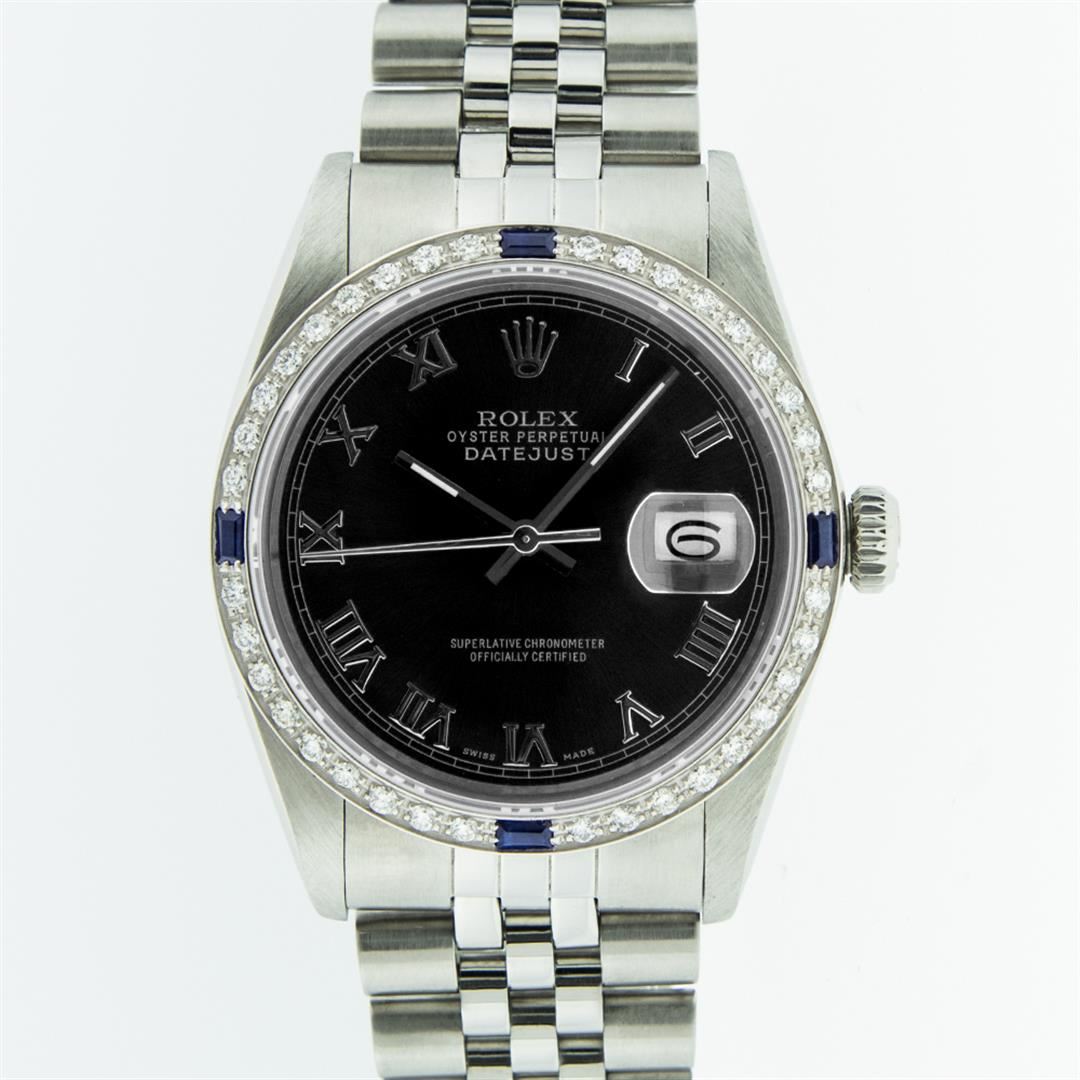 One Mens Pre Owned Stainless Steel Rolex Datejust Polished Bright with Satin Finish, This Watch Has Been Serviced & Electronically Tested, Rolex Stainless Steel Case: 36mm, Rolex Stainless Steel Crown, Custom Bezel: New 18K White Gold Sapphire Beadset Diamond Bezel, Diamond + Gem Count: 36 Diamonds + 4 Sapphires, Total Weight 1.00 Carat, Clarity: SI-VS, Color: G to H. Custom Crystal: New Scratch Resistant Synthetic Sapphire Cyclops Lens. Custom Hands: New Luminescent Hands. Rolex Movement: Automatic Winding Movement. Rolex Dial: Black Roman With Square Track. Date Window: 3 O'Clock Position Date Display, Quickset, Model: Datejust, Condition: G-6 Extra Fine. Rolex Bracelet: Stainless Steel Jubilee Band. Bracelet: 7.0 Inch Length, Adjustable. Standard Clasp, With Rolex Logo. This Watch Has Been Serviced Time Tested And Is In Excellent Condition It Is Free Of All Scratches And Dents.