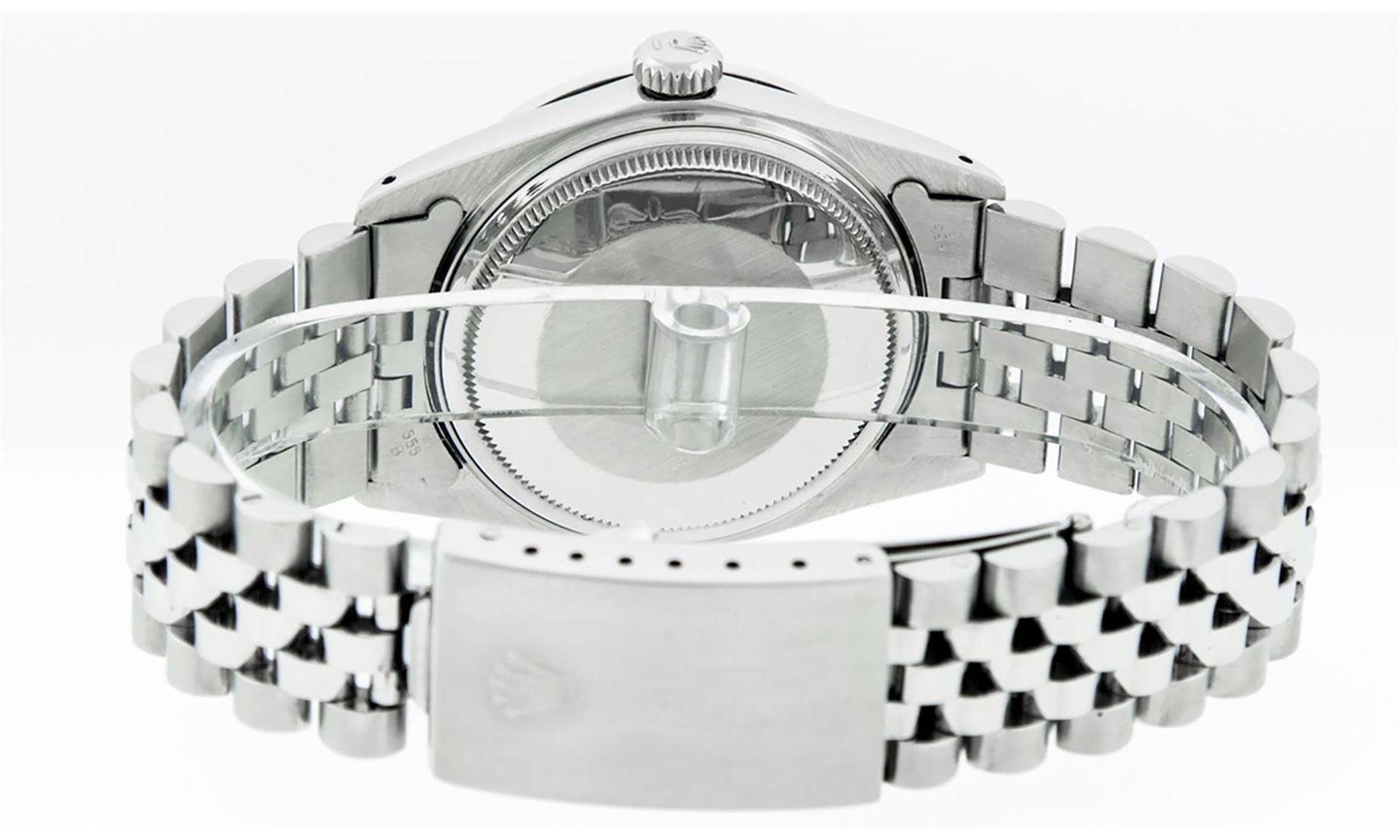 One Mens Pre Owned Stainless Steel Rolex Datejust Polished Bright with Satin Finish, This Watch Has Been Serviced & Electronically Tested, Rolex Stainless Steel Case: 36mm, Rolex Stainless Steel Crown, Custom Bezel: New 18K White Gold Sapphire Beadset Diamond Bezel, Diamond + Gem Count: 36 Diamonds + 4 Sapphires, Total Weight 1.00 Carat, Clarity: SI-VS, Color: G to H. Custom Crystal: New Scratch Resistant Synthetic Sapphire Cyclops Lens. Custom Hands: New Luminescent Hands. Rolex Movement: Automatic Winding Movement. Rolex Dial: Black Roman With Square Track. Date Window: 3 O'Clock Position Date Display, Quickset, Model: Datejust, Condition: G-6 Extra Fine. Rolex Bracelet: Stainless Steel Jubilee Band. Bracelet: 7.0 Inch Length, Adjustable. Standard Clasp, With Rolex Logo. This Watch Has Been Serviced Time Tested And Is In Excellent Condition It Is Free Of All Scratches And Dents.