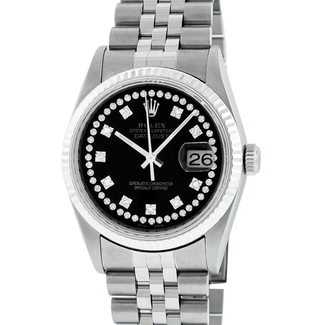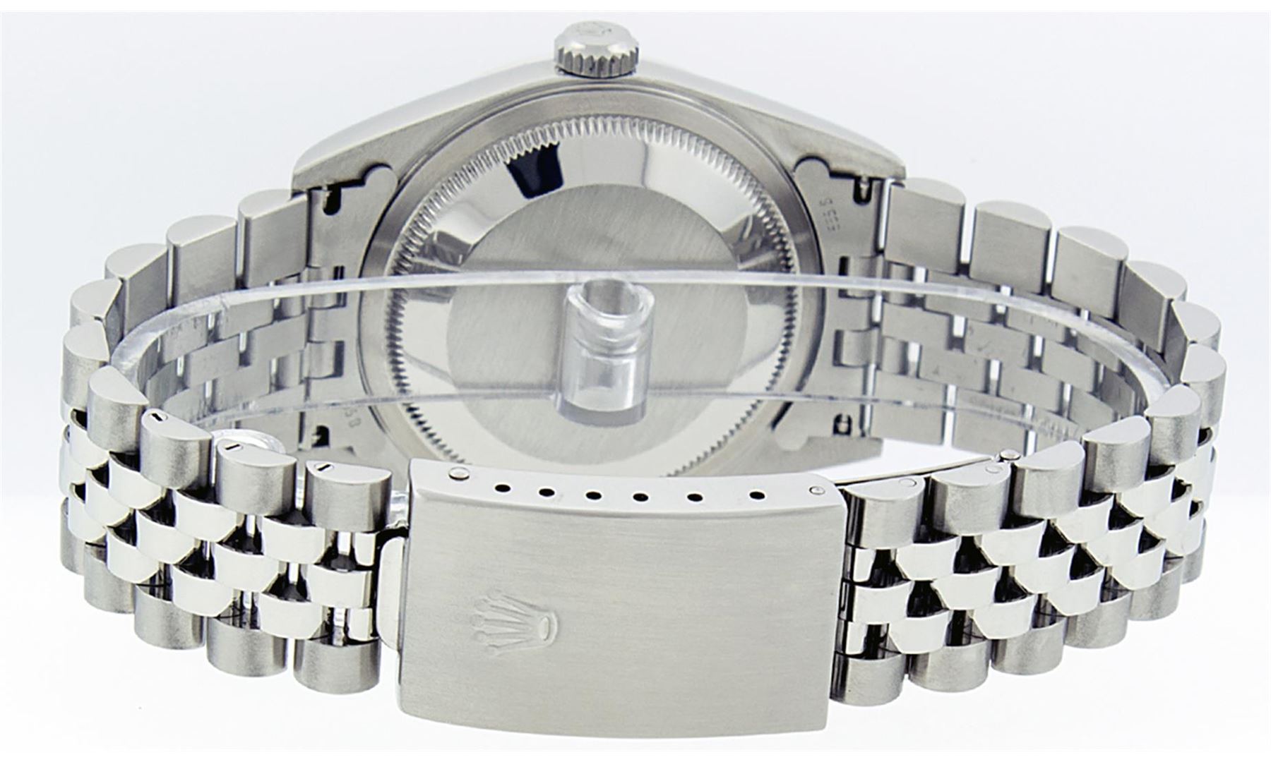 One Mens Pre Owned Stainless Steel Rolex Datejust Polished Bright with Satin Finish, This Watch Has Been Serviced & Electronically Tested, Stainless Steel Case: 36mm, Stainless Steel Crown, Original Bezel: 14K White Gold Fluted Bezel. Custom Crystal: New Sapphire With Magnified Date Window. Custom Hands: New Luminescent Hands. Rolex Movement: Automatic Winding Movement Caliber 3135. Custom Dial: Black With Custom Added Diamond Hour Markers, Diamond Count: 43 Diamonds On Dial. Date Window: 3 O'Clock Position Date Display, Quickset, Model: Datejust, Condition: G-6 Extra Fine. Rolex Bracelet: Stainless Steel Jubilee Band. Bright Polish & Satin Finish. 7.0 Inch Length, Adjustable. Standard Clasp, With Rolex Logo. This Watch Has Been Serviced Time Tested And Is In Excellent Condition It Is Free Of All Scratches And Dents.