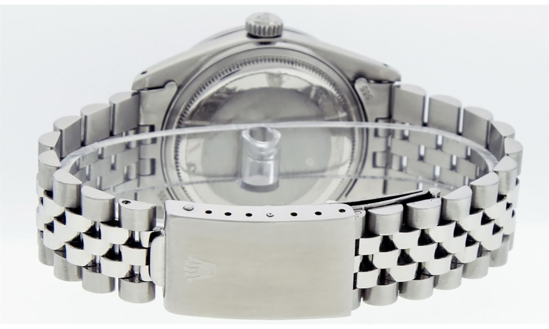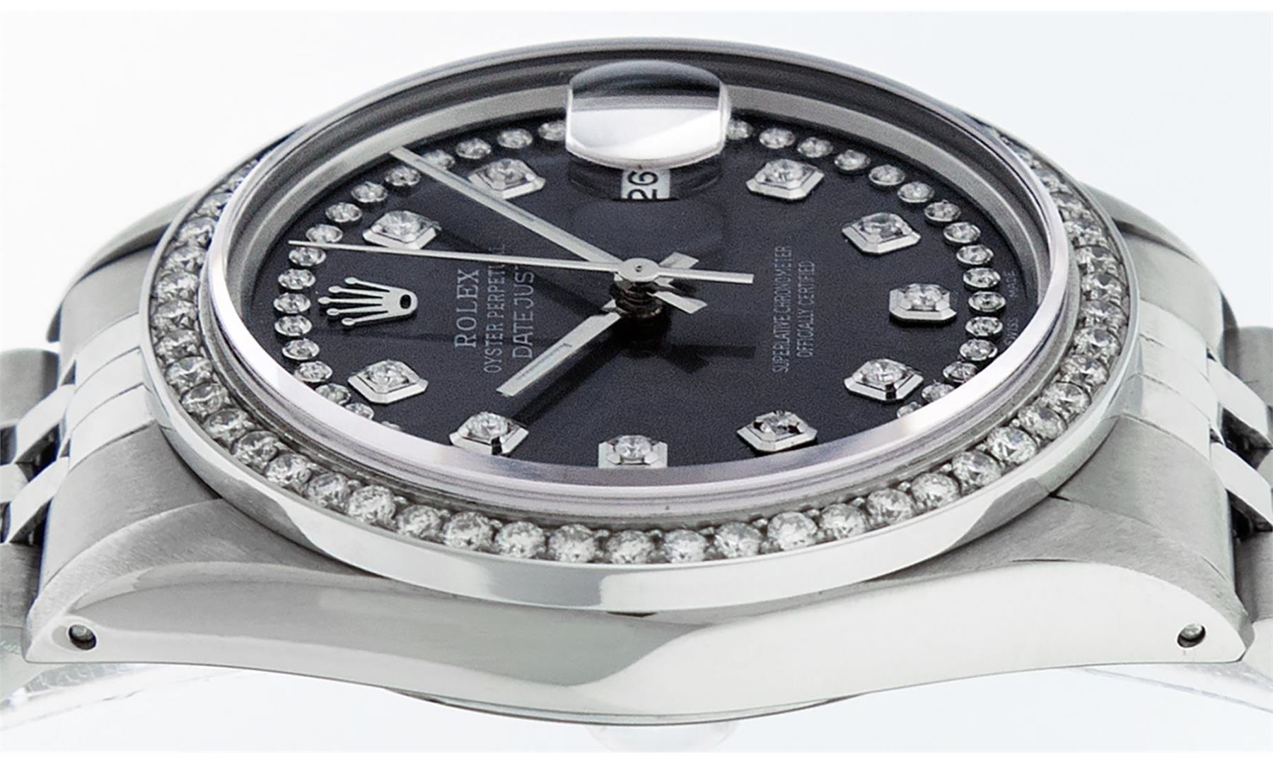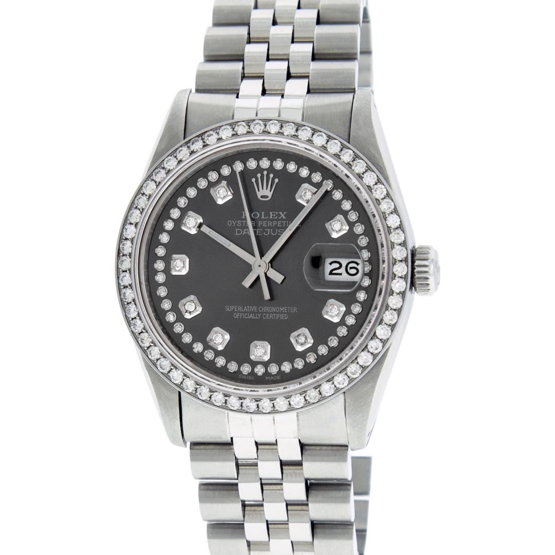One Mens Rolex Stainless Steel Datejust Polished Bright with Satin Finish, Stainless Steel Case: 36mm, Stainless Steel Crown, Custom Bezel: New Stainless Steel Beadset Diamond Bezel, Diamond Count: 54 Diamonds. Custom Crystal: New Sapphire With Magnified Date Window. Custom Hands: New Luminescent Hands. Rolex Movement: Automatic Winding Movement. Custom Dial: Custom Dark Rhodium Diamond Dial, Diamond Count: 58 Diamonds On Dial. Date Window: 3 O'Clock Position Date Display, Quickset, Model: Datejust. Condition: G-6 Extra Fine. Rolex Bracelet: Stainless Steel Jubilee Band. Bright Polish And Satin Finish. 7.0 Inch Length, Adjustable. Standard Clasp, With Rolex Logo. This Watch Has Been Serviced Time Tested And Is In Excellent Condition It Is Free Of All Scratches And Dents.