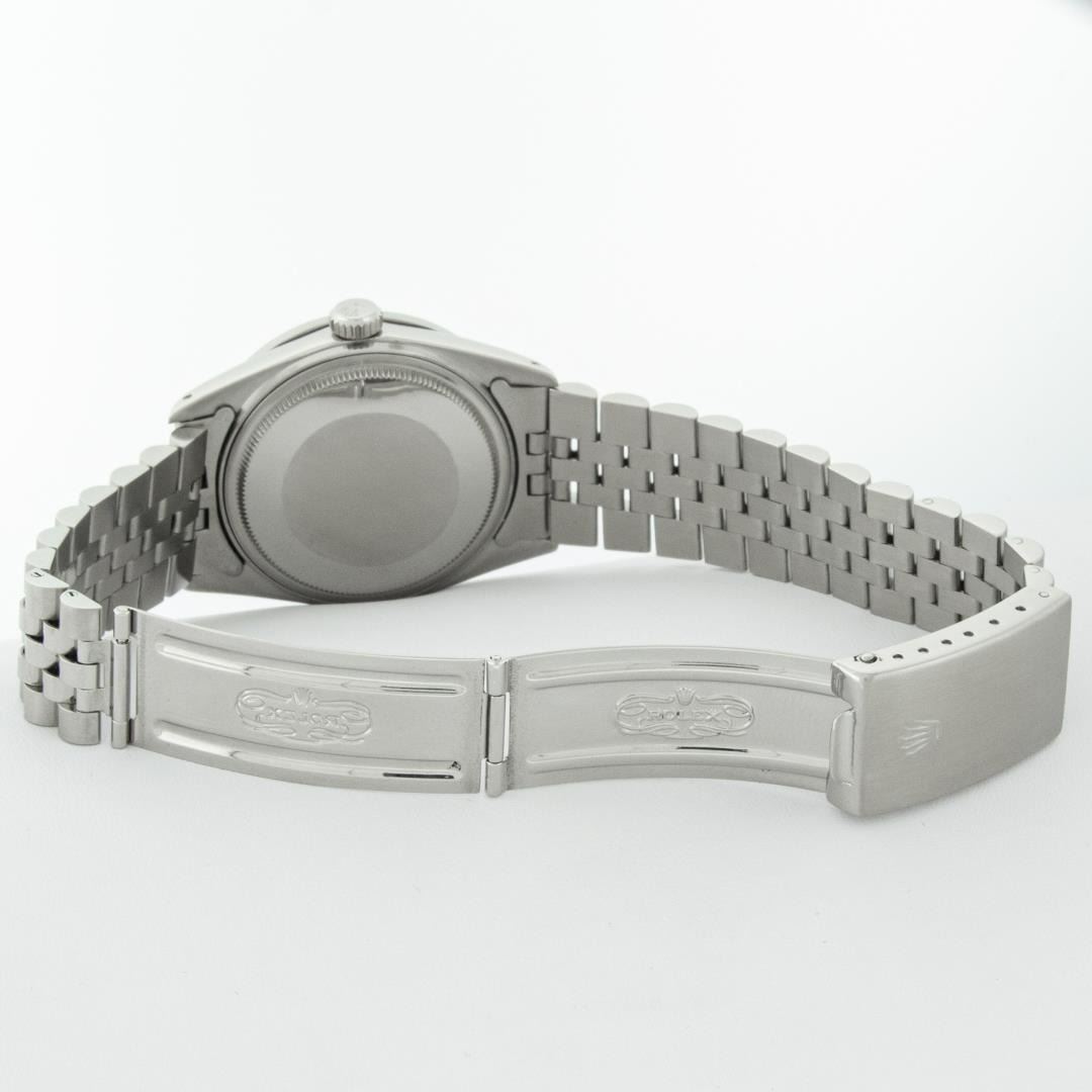 One Mens Pre Owned Rolex Stainless Steel Datejust Polished Bright with Satin Finish, Stainless Steel Case: 36mm, Stainless Steel Crown, Custom Bezel: New Stainless Steel Beadset Diamond Bezel, Diamond Count: 54 Diamonds. Custom Crystal: New Sapphire With Date Window. Custom Hands: New Luminescent Hands. Rolex Movement: Automatic Winding Movement 3035. Custom Dial: Custom Black Dial With Custom Added Diamonds, Diamond Count: 58 Diamonds In Dial. Date Window: 3 O'Clock Position Date Display, Quickset, Model: Quickset Datejust. Condition: G-6 Extra Fine. Rolex Bracelet: Stainless Steel Jubilee Band. Bright Polish And Satin Finish. 7.0 Inch Length, Adjustable. Standard Clasp, With Rolex Logo. This Watch Has Been Serviced Time Tested And Is In Excellent Condition It Is Free Of All Scratches And Dents.