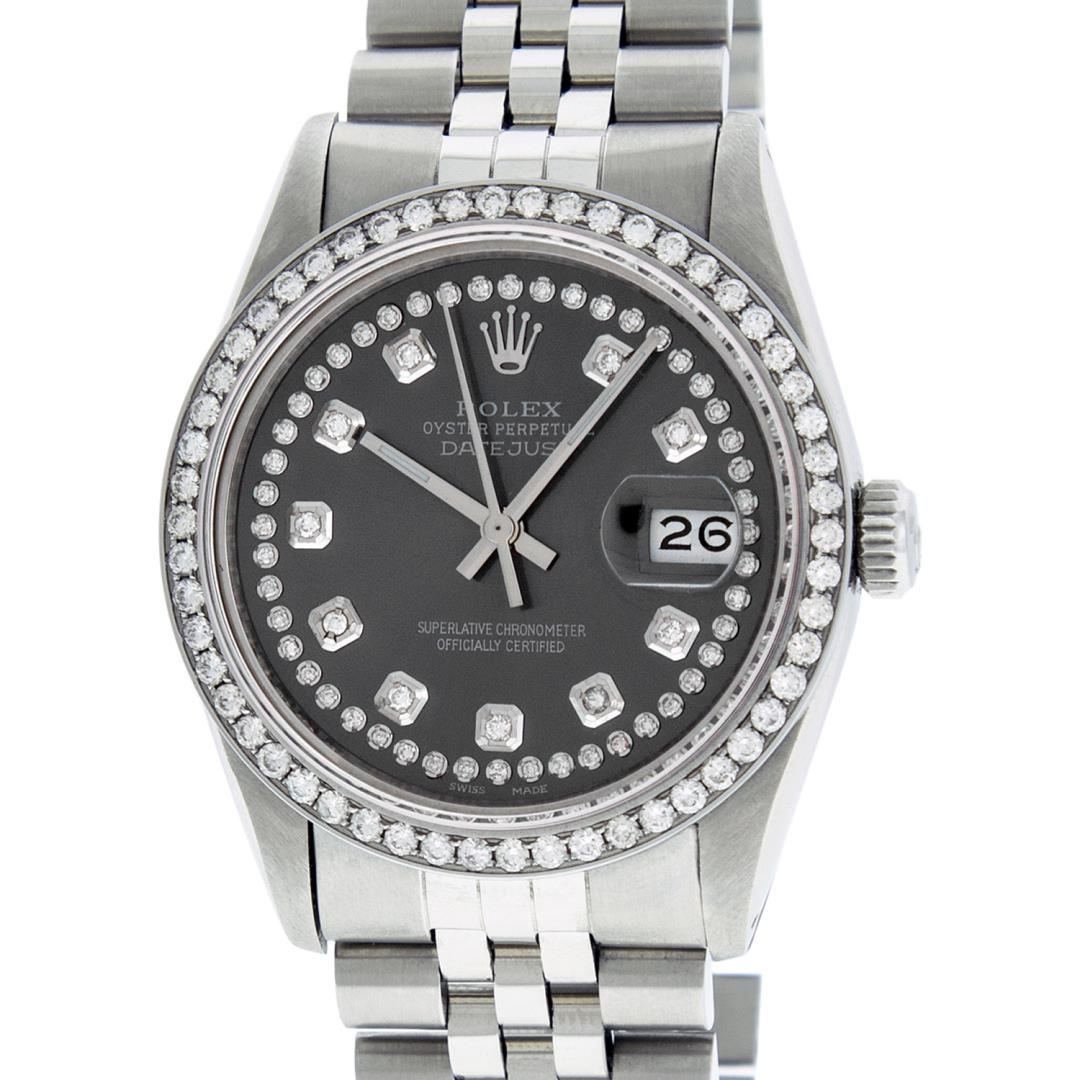 One Mens Rolex Stainless Steel Datejust Polished Bright with Satin Finish, Stainless Steel Case: 36mm, Stainless Steel Crown, Custom Bezel: New Stainless Steel Beadset Diamond Bezel, Diamond Count: 54 Diamonds. Custom Crystal: New Sapphire With Magnified Date Window. Custom Hands: New Luminescent Hands. Rolex Movement: Automatic Winding Movement. Custom Dial: Custom Dark Rhodium Diamond Dial, Diamond Count: 58 Diamonds On Dial. Date Window: 3 O'Clock Position Date Display, Quickset, Model: Datejust. Condition: G-6 Extra Fine. Rolex Bracelet: Stainless Steel Jubilee Band. Bright Polish And Satin Finish. 7.0 Inch Length, Adjustable. Standard Clasp, With Rolex Logo. This Watch Has Been Serviced Time Tested And Is In Excellent Condition It Is Free Of All Scratches And Dents.