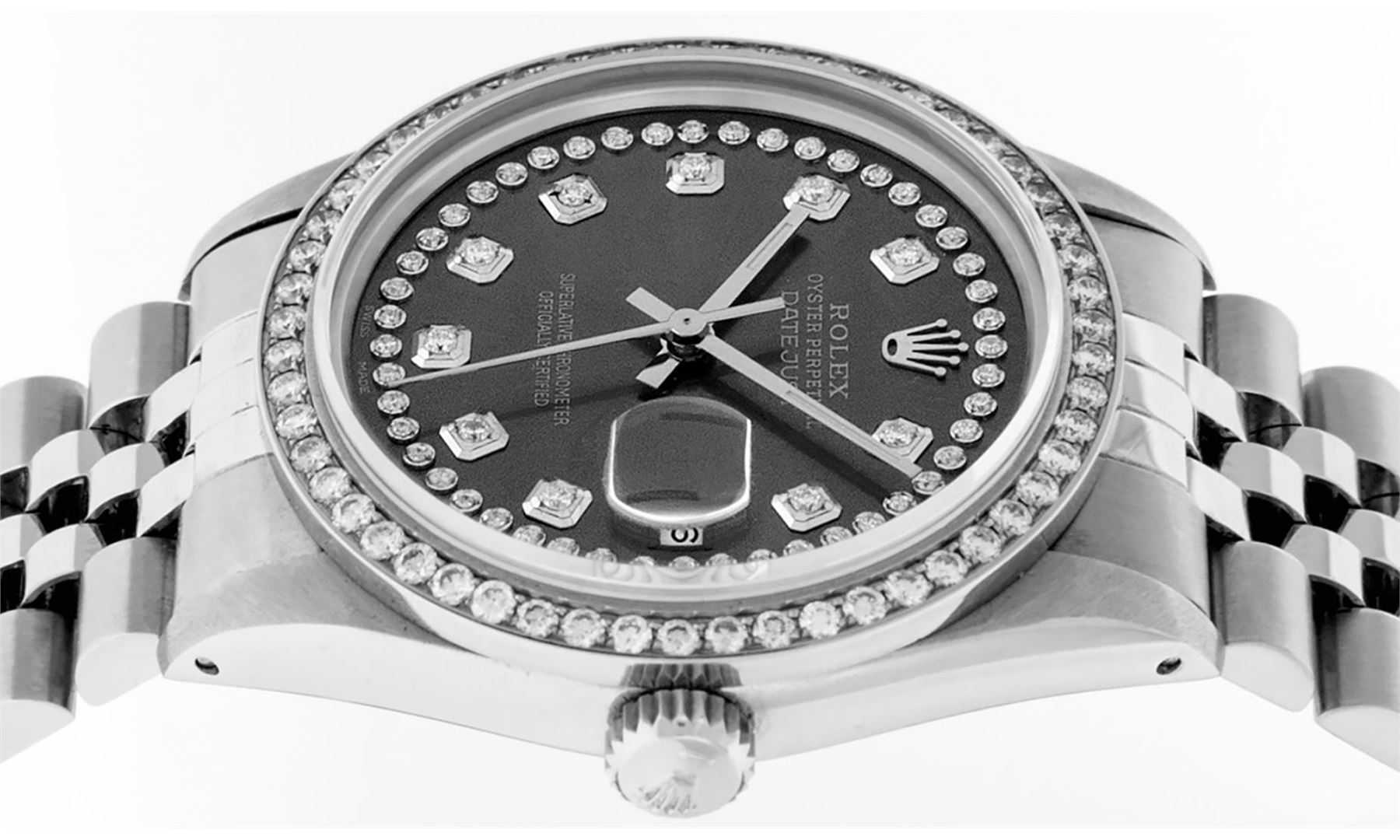 One Mens Rolex Stainless Steel Datejust Polished Bright with Satin Finish, Stainless Steel Case: 36mm, Stainless Steel Crown, Custom Bezel: New Stainless Steel Beadset Diamond Bezel, Diamond Count: 54 Diamonds. Custom Crystal: New Sapphire With Magnified Date Window. Custom Hands: New Luminescent Hands. Rolex Movement: Automatic Winding Movement. Custom Dial: Custom Dark Rhodium Diamond Dial, Diamond Count: 58 Diamonds On Dial. Date Window: 3 O'Clock Position Date Display, Quickset, Model: Datejust. Condition: G-6 Extra Fine. Rolex Bracelet: Stainless Steel Jubilee Band. Bright Polish And Satin Finish. 7.0 Inch Length, Adjustable. Standard Clasp, With Rolex Logo. This Watch Has Been Serviced Time Tested And Is In Excellent Condition It Is Free Of All Scratches And Dents.