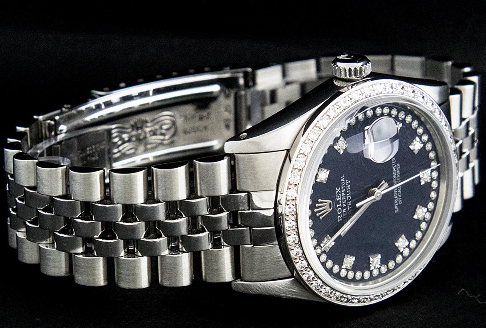 One Mens Rolex Stainless Steel Datejust Polished Bright with Satin Finish, This Watch Has Been Serviced & Electronically Tested, Stainless Steel Case: 36mm, Stainless Steel Crown, Custom Bezel: New 18K White Gold Beadset Diamond Bezel, Diamond Count: 44 Diamonds, Total Weight 1.00 Carat, Clarity: SI-VS, Color: G to H. Custom Crystal: New Scratch Resistant Synthetic Sapphire Cyclops Lens. Custom Hands: New Luminescent Hands. Movement: Automatic Winding Movement. Custom Dial: Black String Single Cut Diamond Dial, Diamond Count: 58 Diamonds In Dial, Color: G to H, Clarity: VS2. Date Window: 3 O'Clock Position Date Display, Quickset, Model: Datejust. Condition: G-6 Extra Fine. Bracelet: Stainless Steel Jubilee Band. Bright Polish & Satin Finish. 7.0 Inch Length, Adjustable. Standard Clasp, With Rolex Logo. This Watch Has Been Serviced Time Tested And Is In Excellent Condition It Is Free Of All Scratches And Dents.