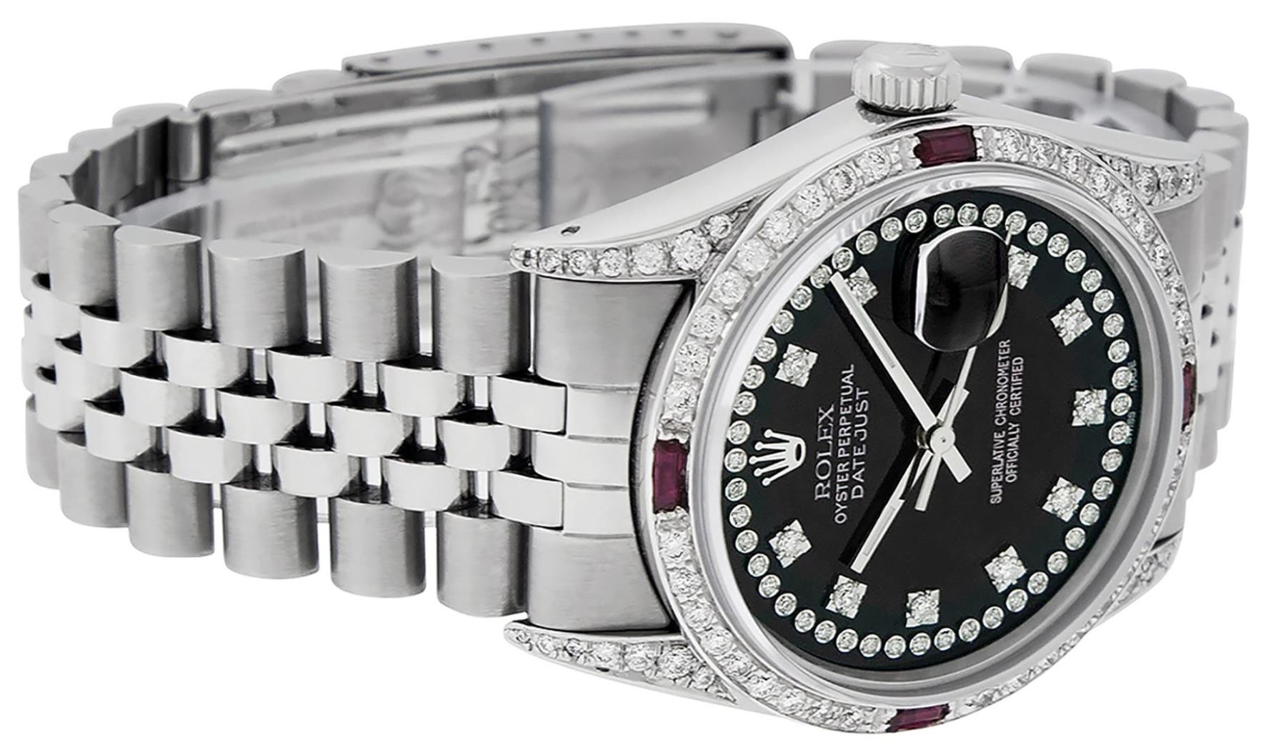 One Mens Pre Owned Rolex Datejust Polished Bright with Satin Finish, Serviced And Electronically Tested, Stainless Steel Case: 36mm, Custom Diamond Lugs: 28 Diamonds On Lugs, Stainless Steel Crown, Custom Bezel: 18K White Gold Diamond + Ruby Beadset, Diamond Count: 36 Diamonds + 4 Rubies. Custom Crystal: New Sapphire With Magnified Date Window. Custom Hands: New Luminescent Hands. Rolex Movement: Automatic Winding Movement 3035. Custom Dial:Custom Black Dial With Added Diamonds, Stone Count: 58 Diamonds In Dial. Date Window: 3 O'Clock Position Date Display, Quickset, Model: Datejust, Condition: G-6 Extra Fine. Rolex Bracelet: Stainless Steel Jubilee Band. Bright Polish And Satin Finish. 7.0 Inch Length, Adjustable. Standard Clasp, With Rolex Logo. This Watch Has Been Serviced And Polished And Its Free Of All Dents And Scratches.
