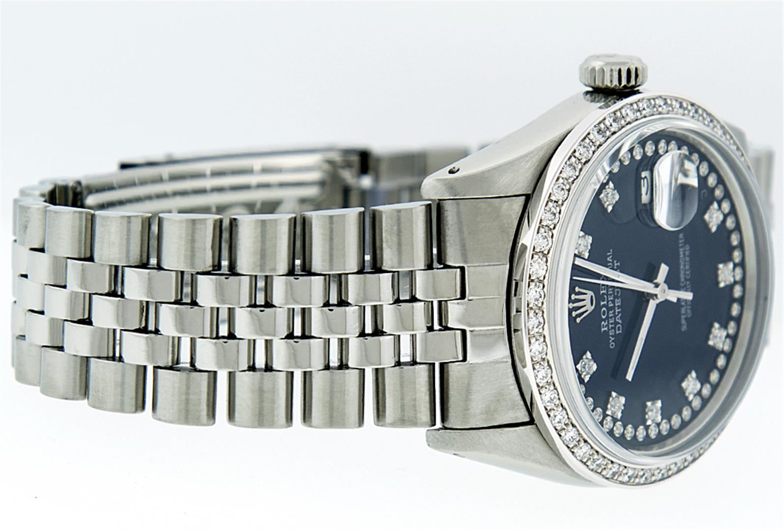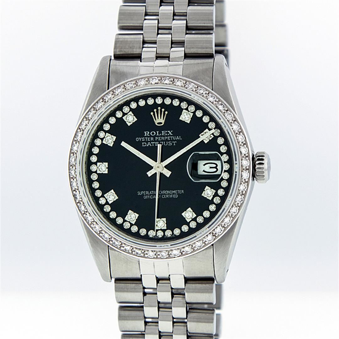 One Mens Rolex Datejust Polished, Serviced & Electronically Tested, Stainless Steel Case:36mm, Stainless Steel Crown, Custom Bezel: Stainless Steel Beadset Diamond Bezel, Diamond Count: 54 Diamonds. Total Weight .90 Carat, Clarity: SI-VS, Color: G to H. Custom Crystal: Synthetic Sapphire Cyclops Lens. Movement: Automatic Winding Movement Caliber 3035. Custom Dial: Black String Diamond Dial, Diamond Count: 58 Diamond In Dial G To H In Color, Clarity: VS. Date Window: 3 O'Clock Position Date Display, Quickset, Model: Datejust, Condition: G-6 Extra Fine. Bracelet: Stainless Steel Jubilee. Bright Polish & Satin Finish. 7.0 Inch Length, Adjustable. Standard Clasp, With Rolex Logo.