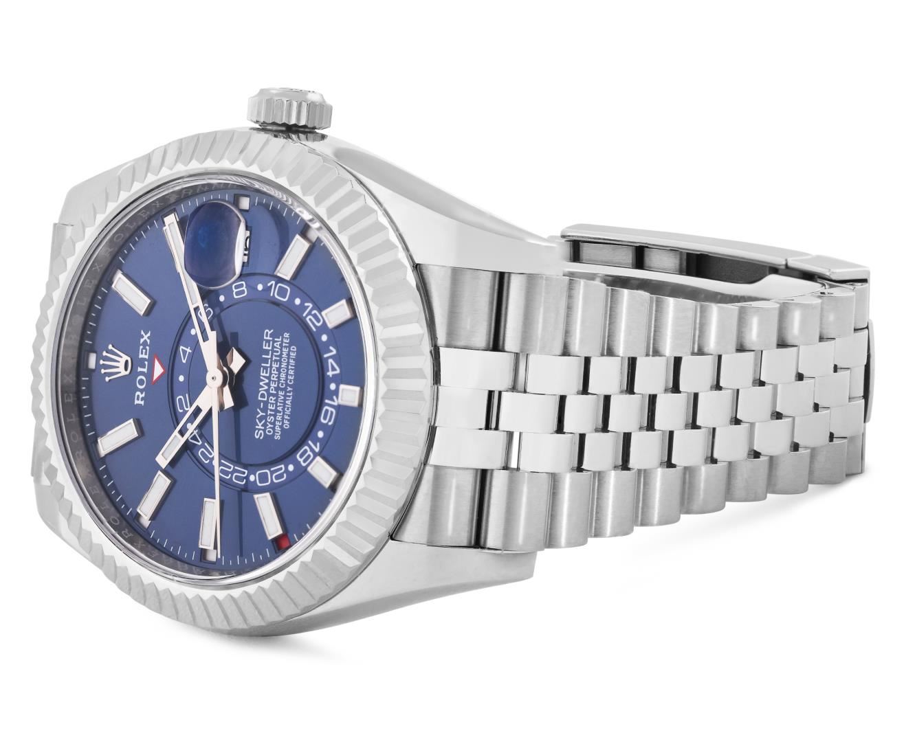 One Mens Pre Owned Stainless Steel Rolex Sky Dweller With Date Polished, Serviced And Electronically Tested, Rolex Stainless Steel Case: 42mm, Rolex Stainless Steel Crown, Rolex Bezel: 18K White Gold Rotatable Fluted Bezel. Rolex Crystal: Sapphire With Magnified Date Window. Rolex Movement: Automatic Winding Movement Caliber 9001. Rolex Dial: Rolex Blue Sky Dweller Dial with Luminous Index Hour Markers. Date Window: 3 O'Clock Position Date Display, Model: Sky Dweller, Functions: Quickset, Month Calendar Feature, Dual Time. Condition: G-6 Extra Fine. Rolex Bracelet: Stainless Steel Jubilee Band. Bright Polish And Satin Finish. 7.25 Inch Length, Adjustable. Standard Clasp, With Rolex Logo. This Watch Has Been Serviced Time Tested And Is In Excellent Condition It Is Free Of All Scratches And Dents. This Watch Comes With Rolex Box And Papers.