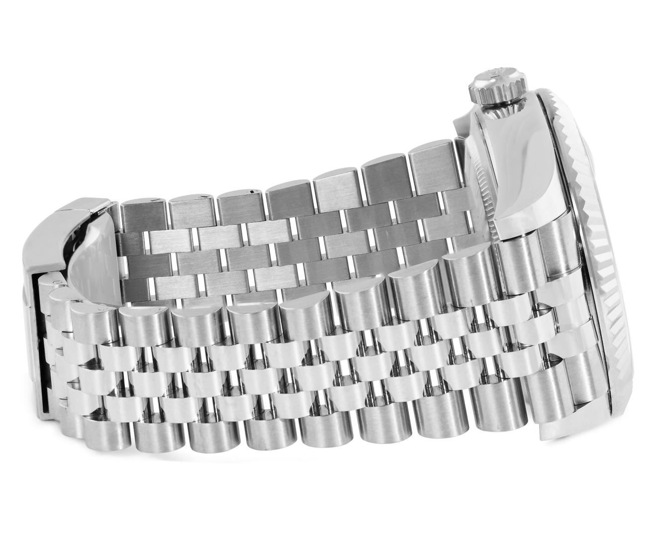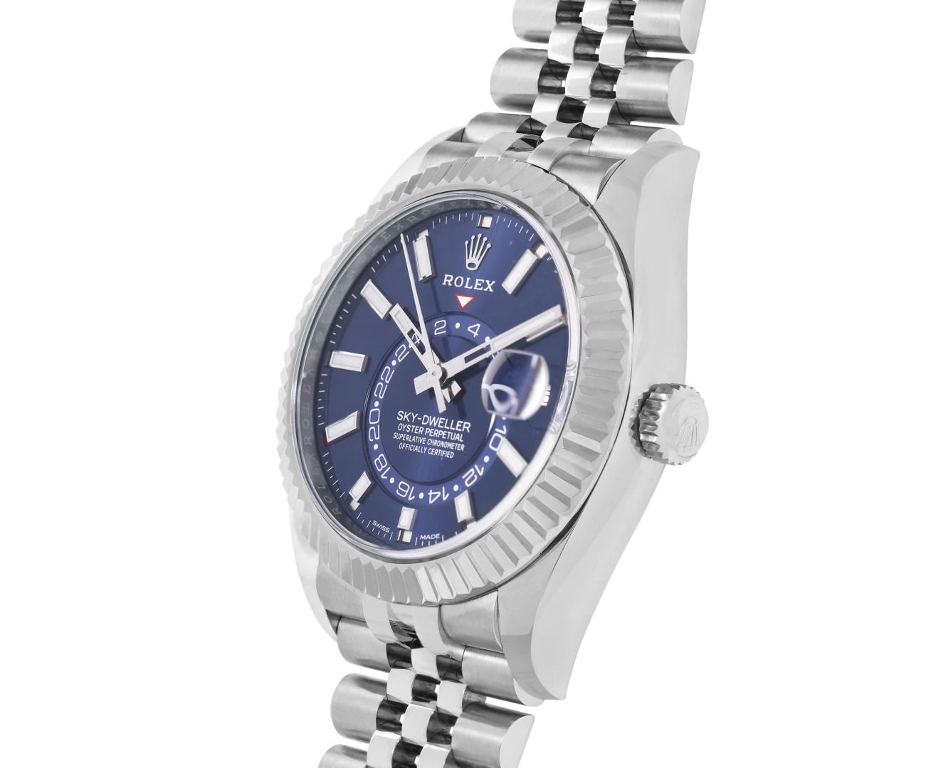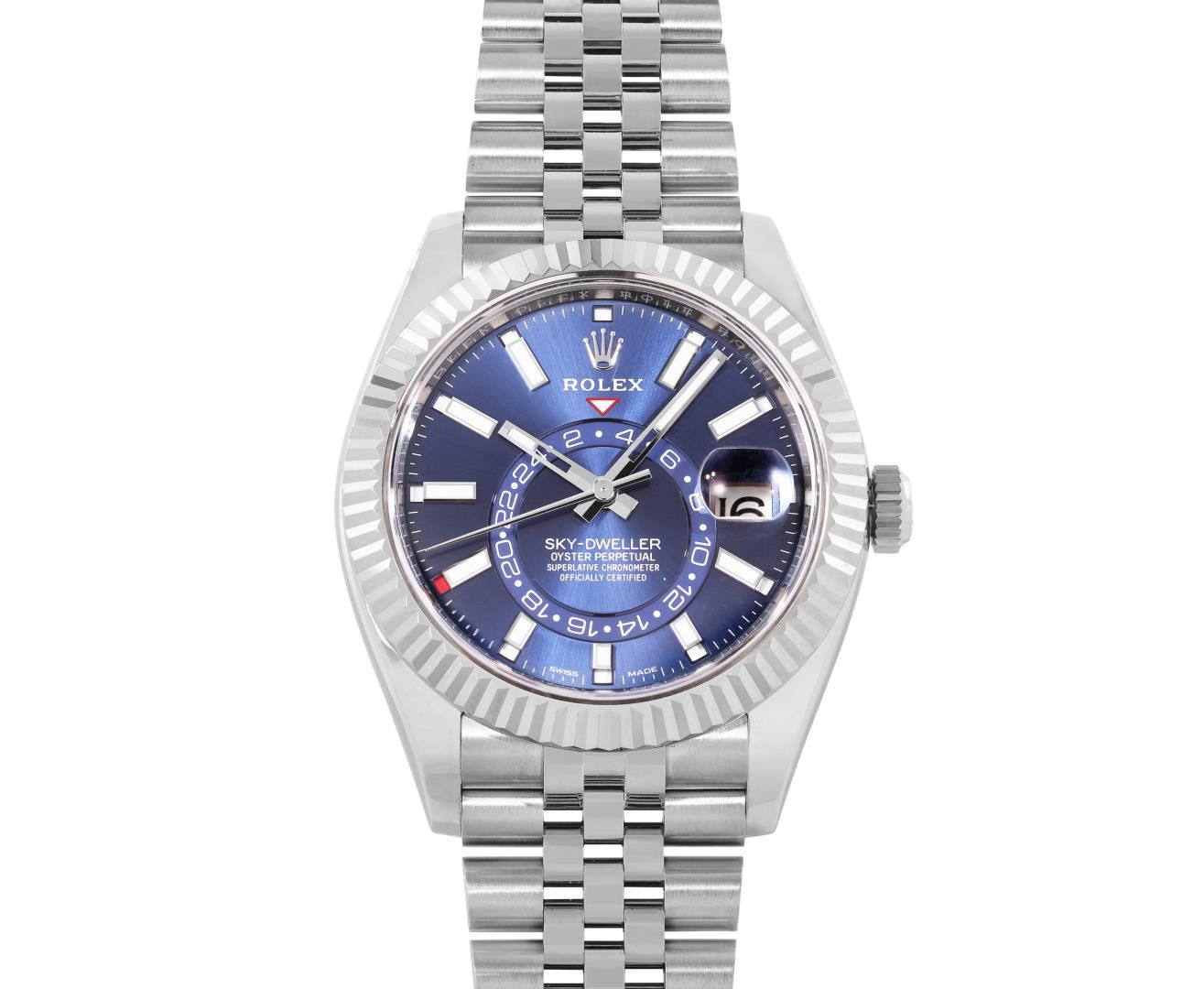 One Mens Pre Owned Stainless Steel Rolex Sky Dweller With Date Polished, Serviced And Electronically Tested, Rolex Stainless Steel Case: 42mm, Rolex Stainless Steel Crown, Rolex Bezel: 18K White Gold Rotatable Fluted Bezel. Rolex Crystal: Sapphire With Magnified Date Window. Rolex Movement: Automatic Winding Movement Caliber 9001. Rolex Dial: Rolex Blue Sky Dweller Dial with Luminous Index Hour Markers. Date Window: 3 O'Clock Position Date Display, Model: Sky Dweller, Functions: Quickset, Month Calendar Feature, Dual Time. Condition: G-6 Extra Fine. Rolex Bracelet: Stainless Steel Jubilee Band. Bright Polish And Satin Finish. 7.25 Inch Length, Adjustable. Standard Clasp, With Rolex Logo. This Watch Has Been Serviced Time Tested And Is In Excellent Condition It Is Free Of All Scratches And Dents. This Watch Comes With Rolex Box And Papers.