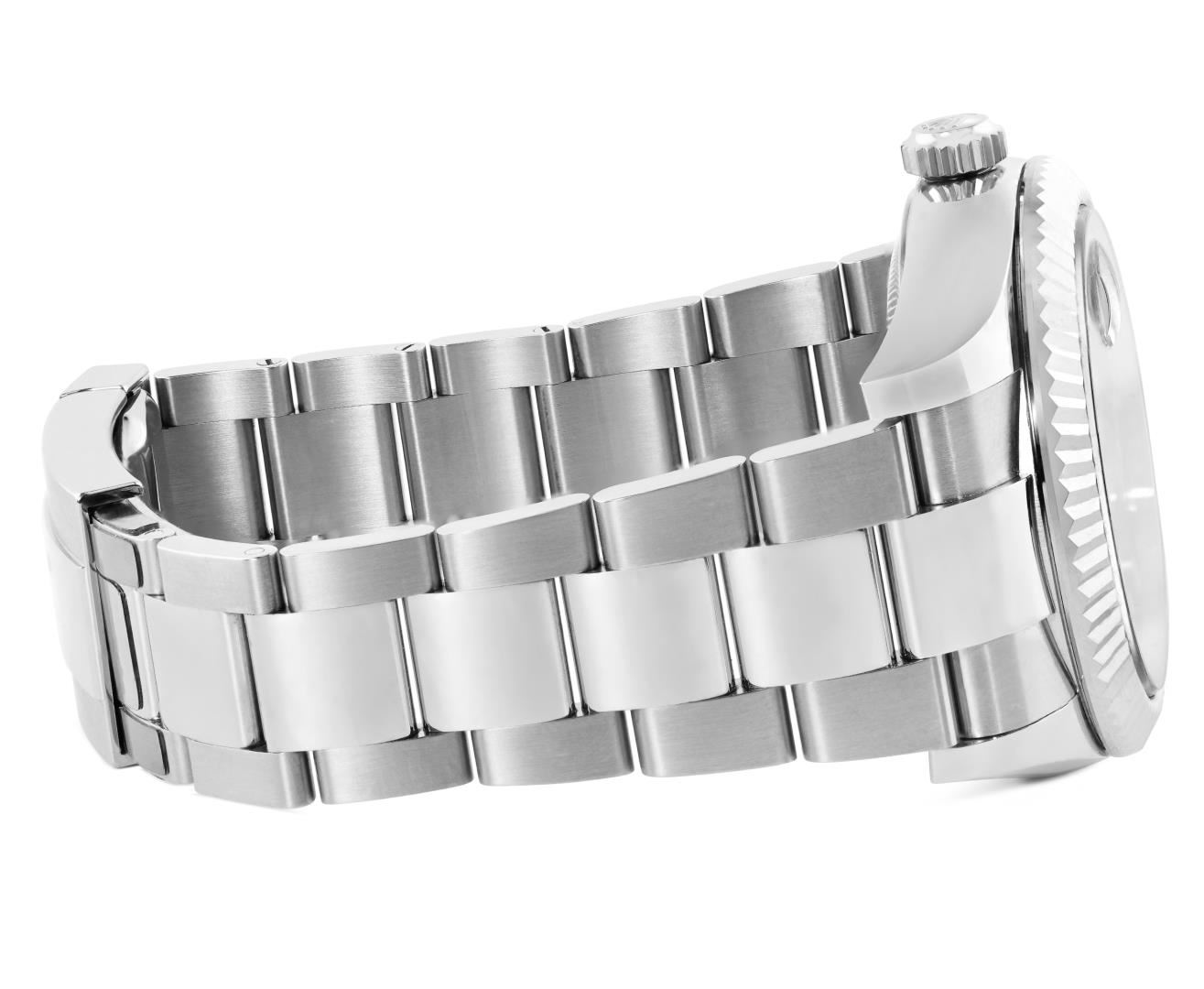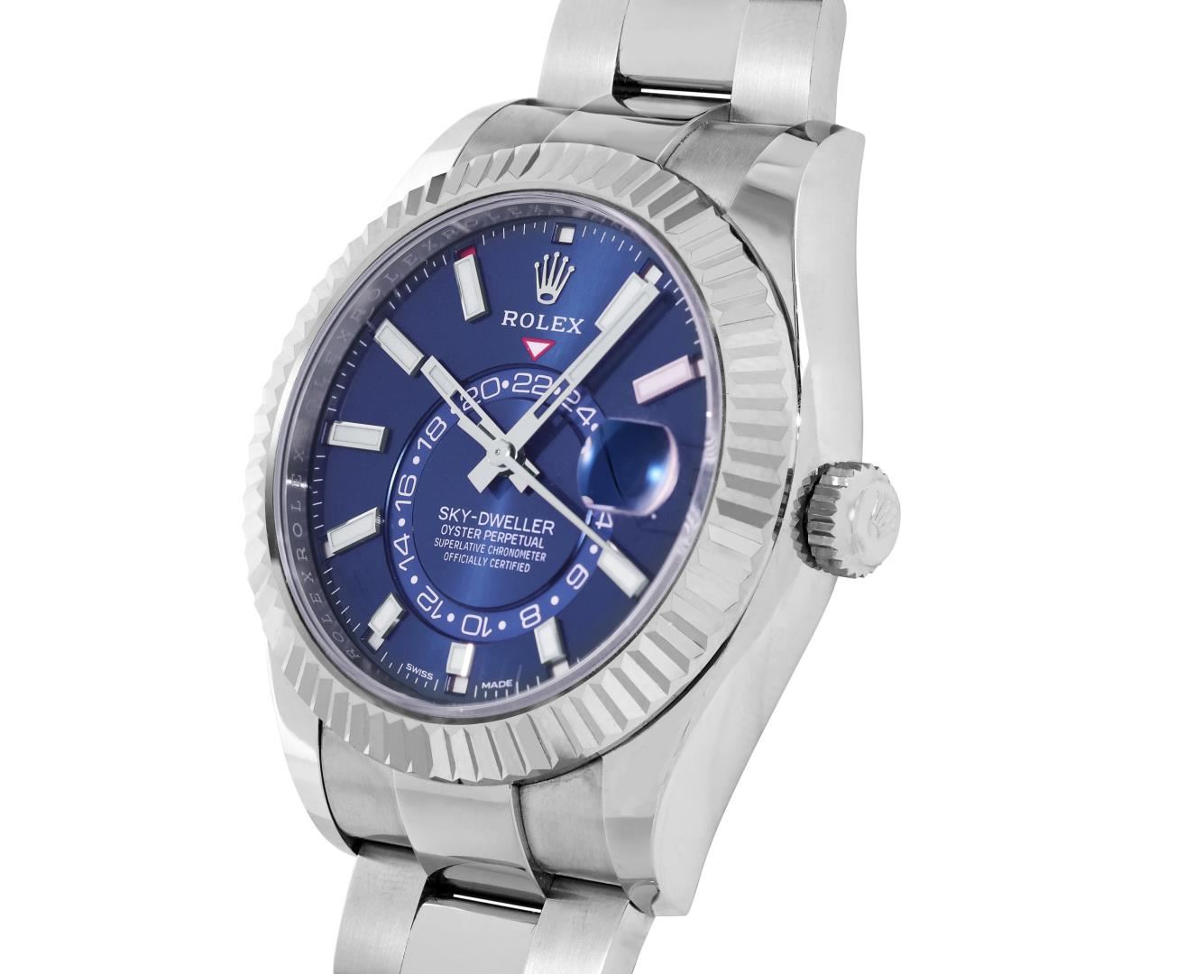 One Mens Pre Owned Stainless Steel Rolex Sky Dweller With Date Polished, Serviced And Electronically Tested, Rolex Stainless Steel Case: 42mm, Rolex Stainless Steel Crown, Rolex Bezel: 18K White Gold Rotatable Fluted Bezel. Rolex Crystal: Sapphire With Magnified Date Window. Rolex Movement: Automatic Winding Movement Caliber 9001. Rolex Dial: Rolex Blue Sky Dweller Dial with Luminous Index Hour Markers. Date Window: 3 O'Clock Position Date Display, Model: Sky Dweller, Functions: Quickset, Month Calendar Feature, Dual Time. Condition: G-6 Extra Fine. Rolex Bracelet: Stainless Steel Oyster Band. Bright Polish And Satin Finish. 7.25 Inch Length, Adjustable. Standard Clasp, With Rolex Logo. This Watch Has Been Serviced Time Tested And Is In Excellent Condition It Is Free Of All Scratches And Dents. This Watch Comes With Rolex Box And Papers.