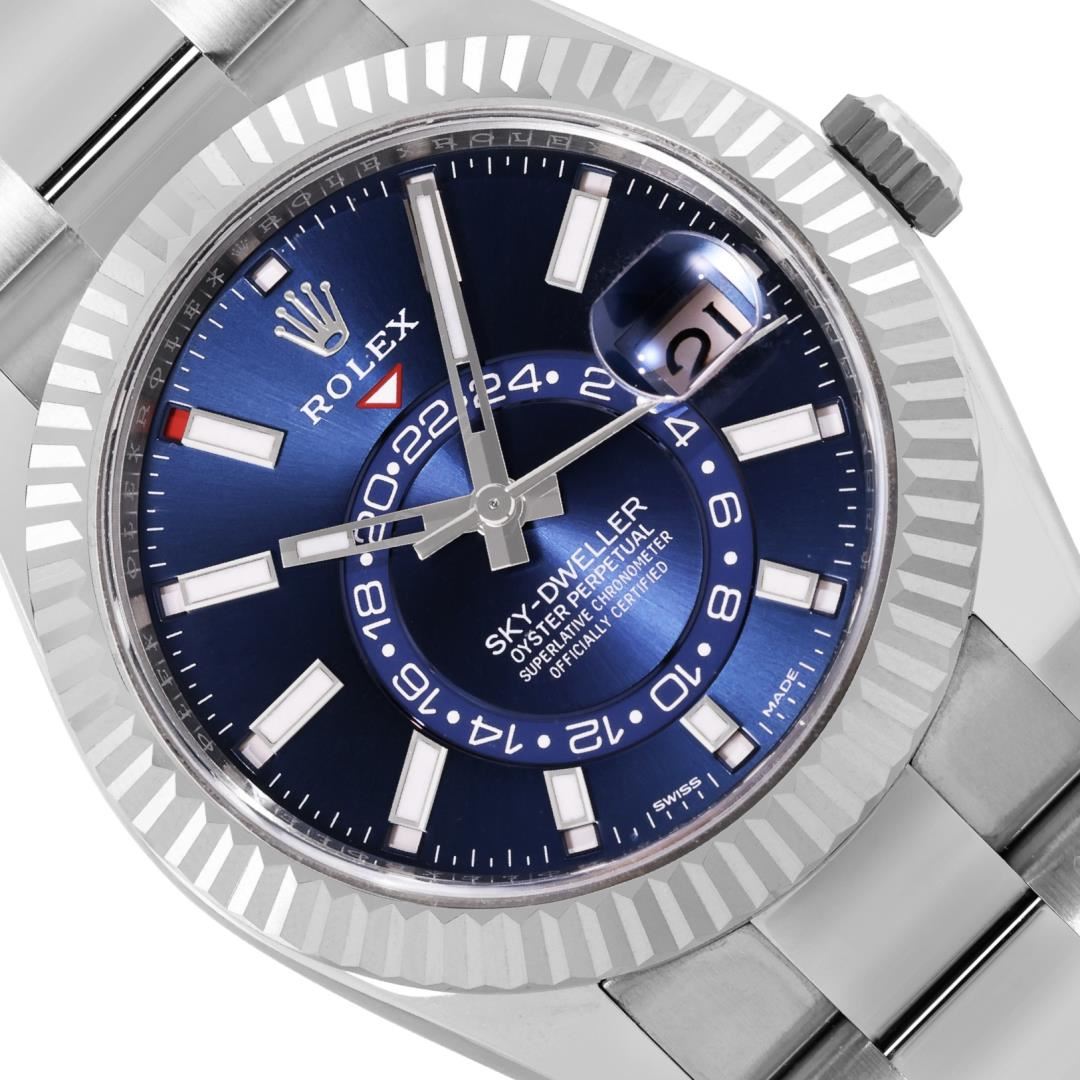 One Mens Pre Owned Stainless Steel Rolex Sky Dweller With Date Polished, Serviced And Electronically Tested, Rolex Stainless Steel Case: 42mm, Rolex Stainless Steel Crown, Rolex Bezel: 18K White Gold Rotatable Fluted Bezel. Rolex Crystal: Sapphire With Magnified Date Window. Rolex Movement: Automatic Winding Movement Caliber 9001. Rolex Dial: Rolex Blue Sky Dweller Dial with Luminous Index Hour Markers. Date Window: 3 O'Clock Position Date Display, Model: Sky Dweller, Functions: Quickset, Month Calendar Feature, Dual Time. Condition: G-6 Extra Fine. Rolex Bracelet: Stainless Steel Oyster Band. Bright Polish And Satin Finish. 7.25 Inch Length, Adjustable. Standard Clasp, With Rolex Logo. This Watch Has Been Serviced Time Tested And Is In Excellent Condition It Is Free Of All Scratches And Dents. This Watch Comes With Rolex Box And Papers.