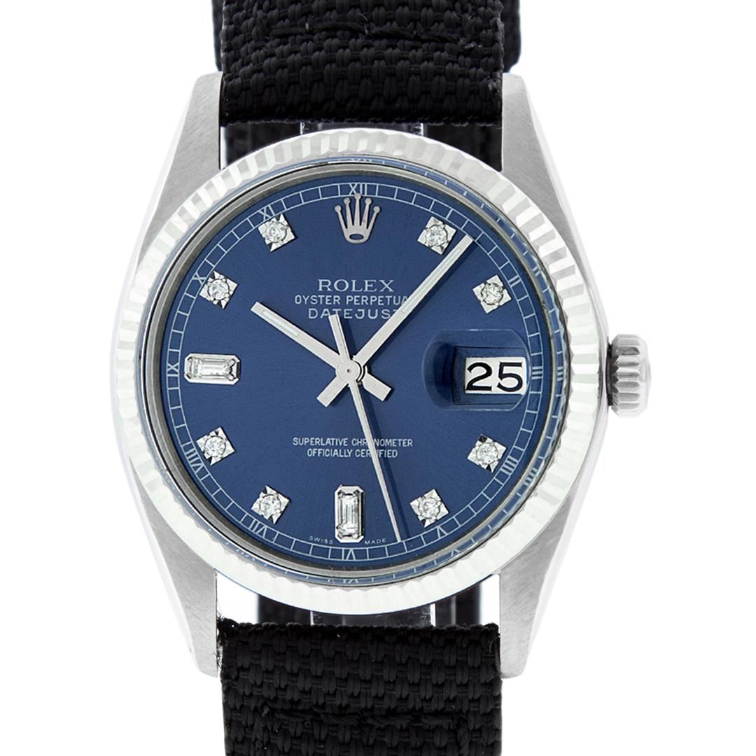 One Mens Pre Owned Stainless Steel Rolex Datejust Polished Bright with Satin Finish, This Watch Has Been Serviced & Electronically Tested, Rolex Stainless Rolex Steel Case: 36mm, Rolex Stainless Steel Crown, Rolex Bezel: 14K White Gold Fluted Bezel. Custom Crystal: New Acrylic Magnified Lens. Custom Hands: New Luminescent Hands. Rolex Movement: Automatic Winding Movement. Custom Dial: Refinished Blue With Custom Added Diamonds, Diamond Count: 8 Diamonds + 2 Diamond Baguettes in Dial, G To H In Color, SI-VS Clarity. Date Window: 3 O'Clock Position Date Display, Quickset, Model: Datejust, Condition: G-6 Extra Fine. Custom Band: New Black Nylon Strap. 7.5 Inch Length. This Watch Has Been Serviced Time Tested And Is In Excellent Condition It Is Free Of All Scratches And Dents.