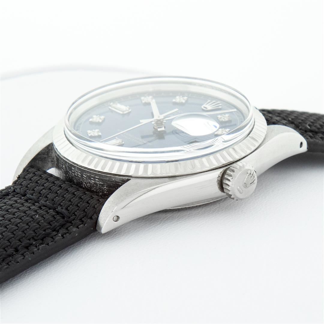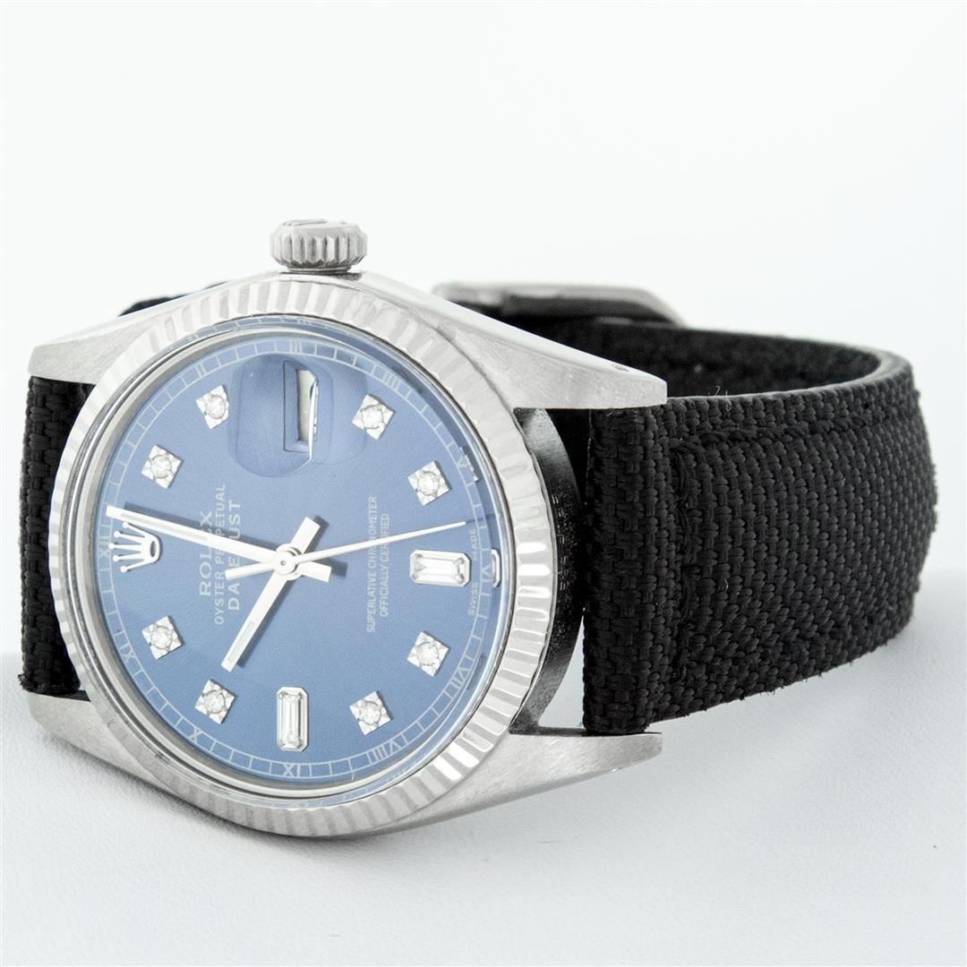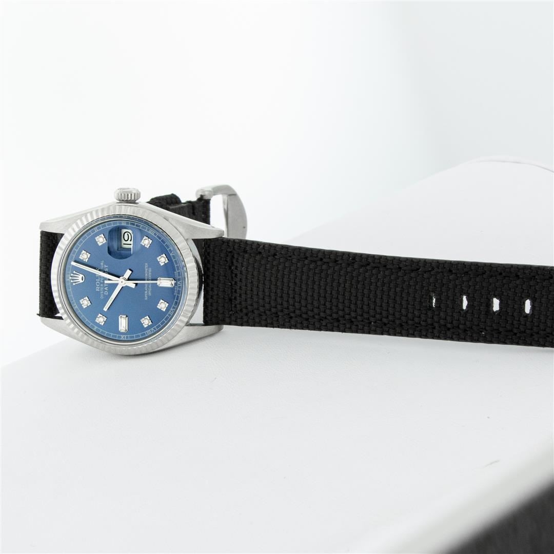 One Mens Pre Owned Stainless Steel Rolex Datejust Polished Bright with Satin Finish, This Watch Has Been Serviced & Electronically Tested, Rolex Stainless Rolex Steel Case: 36mm, Rolex Stainless Steel Crown, Rolex Bezel: 14K White Gold Fluted Bezel. Custom Crystal: New Acrylic Magnified Lens. Custom Hands: New Luminescent Hands. Rolex Movement: Automatic Winding Movement. Custom Dial: Refinished Blue With Custom Added Diamonds, Diamond Count: 8 Diamonds + 2 Diamond Baguettes in Dial, G To H In Color, SI-VS Clarity. Date Window: 3 O'clock Position Date Display, Quickset, Model: Datejust, Condition: G-6 Extra Fine. Custom Band: New Black Nylon Strap. 7.5 Inch Length. This Watch Has Been Serviced Time Tested And Is In Excellent Condition It Is Free Of All Scratches And Dents.