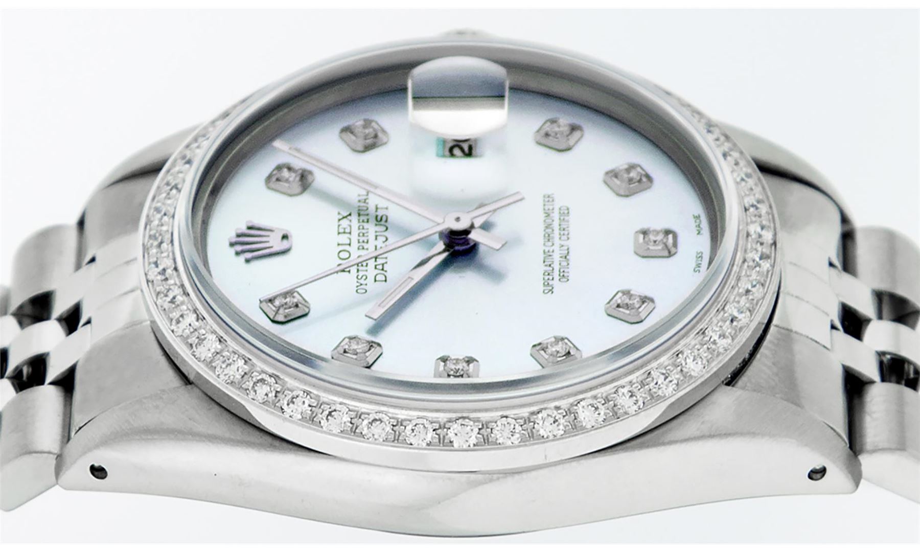 One Mens Pre Owned Stainless Steel Rolex Datejust Polished, Serviced & Electronically Tested, Rolex Stainless Steel Case: 36mm, Rolex Stainless Steel Crown, Custom Bezel: New 18K White Gold Bead set Diamond Bezel, Diamond Count: 44 Diamonds In Bezel, Clar