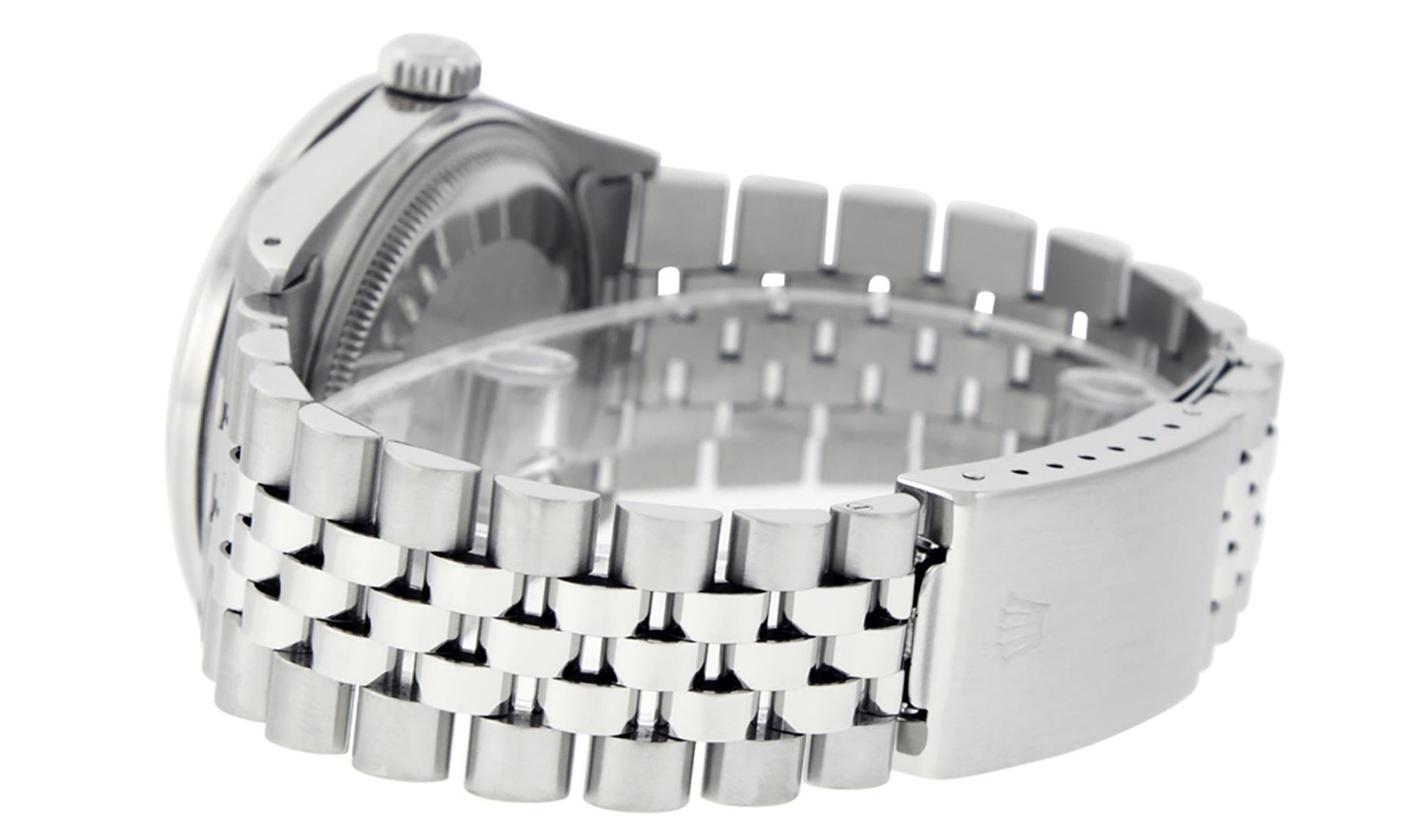 One Mens Pre Owned Stainless Steel Rolex Datejust Polished, Serviced & Electronically Tested, Rolex Stainless Steel Case: 36mm, Stainless Steel Crown, Custom Bezel: New 18K White Gold Beadset Diamond Bezel, Diamond Count: 44 Diamonds, Clarity: SI-VS, Color: G to H. Custom Crystal: New Sapphire With Magnified Date Window. Custom Hands: New Luminescent Hands. Rolex Movement: Automatic Winding Movement. Custom Dial: Refinished Blue With Custom Added Diamonds, Diamond Count: 8 Diamonds + 28 Diamonds On 6 & 9 Hour Markers, G To H In Color, Clarity: SI-VS. Date Window: 3 O'Clock Position Date Display, Quickset, Model: Datejust. Condition: G-6 Extra Fine. Rolex Bracelet: Stainless Steel Jubilee Band. Bright Polish & Satin Finish. 7.0 Inch Length, Adjustable. Standard Clasp, With Rolex Logo. This Watch Has Been Serviced Time Tested And Is In Excellent Condition It Is Free Of All Scratches And Dents.