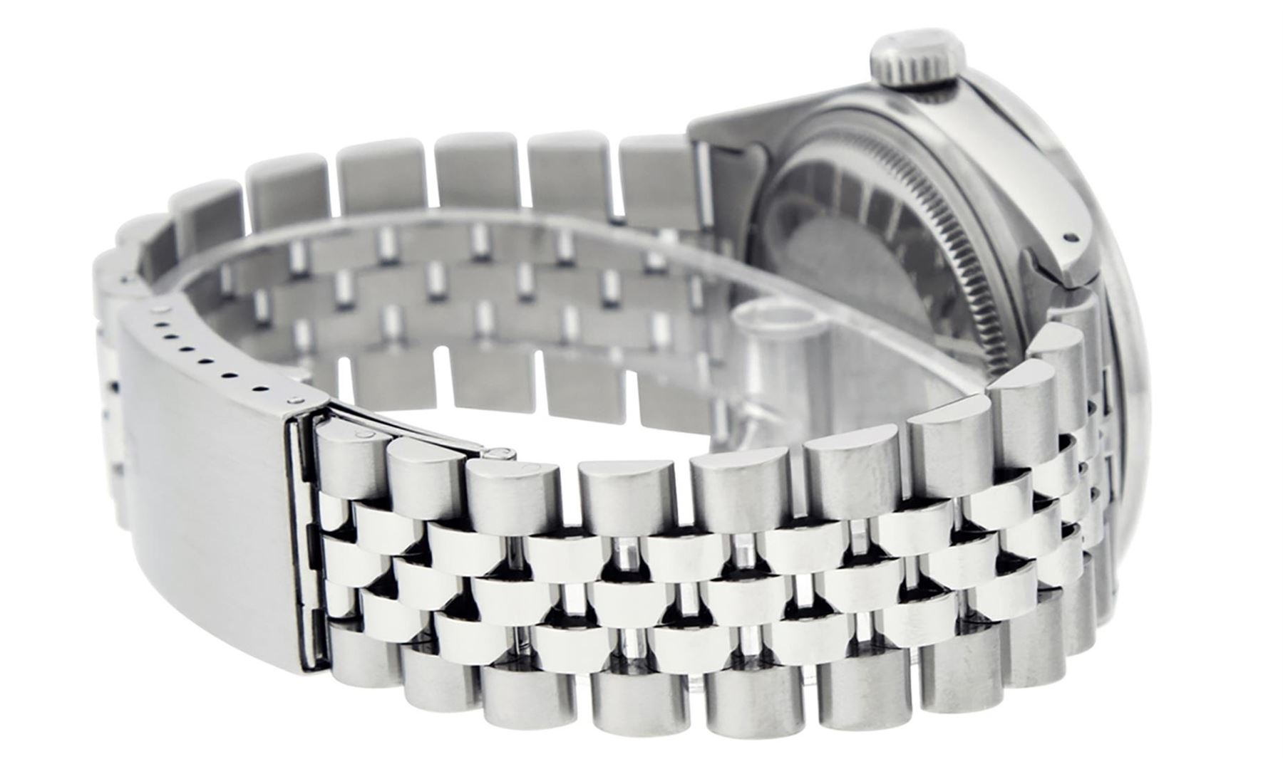 One Mens Pre Owned Stainless Steel Rolex Datejust Polished, Serviced & Electronically Tested, Rolex Stainless Steel Case: 36mm, Stainless Steel Crown, Custom Bezel: New 18K White Gold Beadset Diamond Bezel, Diamond Count: 44 Diamonds, Clarity: SI-VS, Color: G to H. Custom Crystal: New Sapphire With Magnified Date Window. Custom Hands: New Luminescent Hands. Rolex Movement: Automatic Winding Movement. Custom Dial: Refinished Blue With Custom Added Diamonds, Diamond Count: 8 Diamonds + 28 Diamonds On 6 & 9 Hour Markers, G To H In Color, Clarity: SI-VS. Date Window: 3 O'Clock Position Date Display, Quickset, Model: Datejust. Condition: G-6 Extra Fine. Rolex Bracelet: Stainless Steel Jubilee Band. Bright Polish & Satin Finish. 7.0 Inch Length, Adjustable. Standard Clasp, With Rolex Logo. This Watch Has Been Serviced Time Tested And Is In Excellent Condition It Is Free Of All Scratches And Dents.