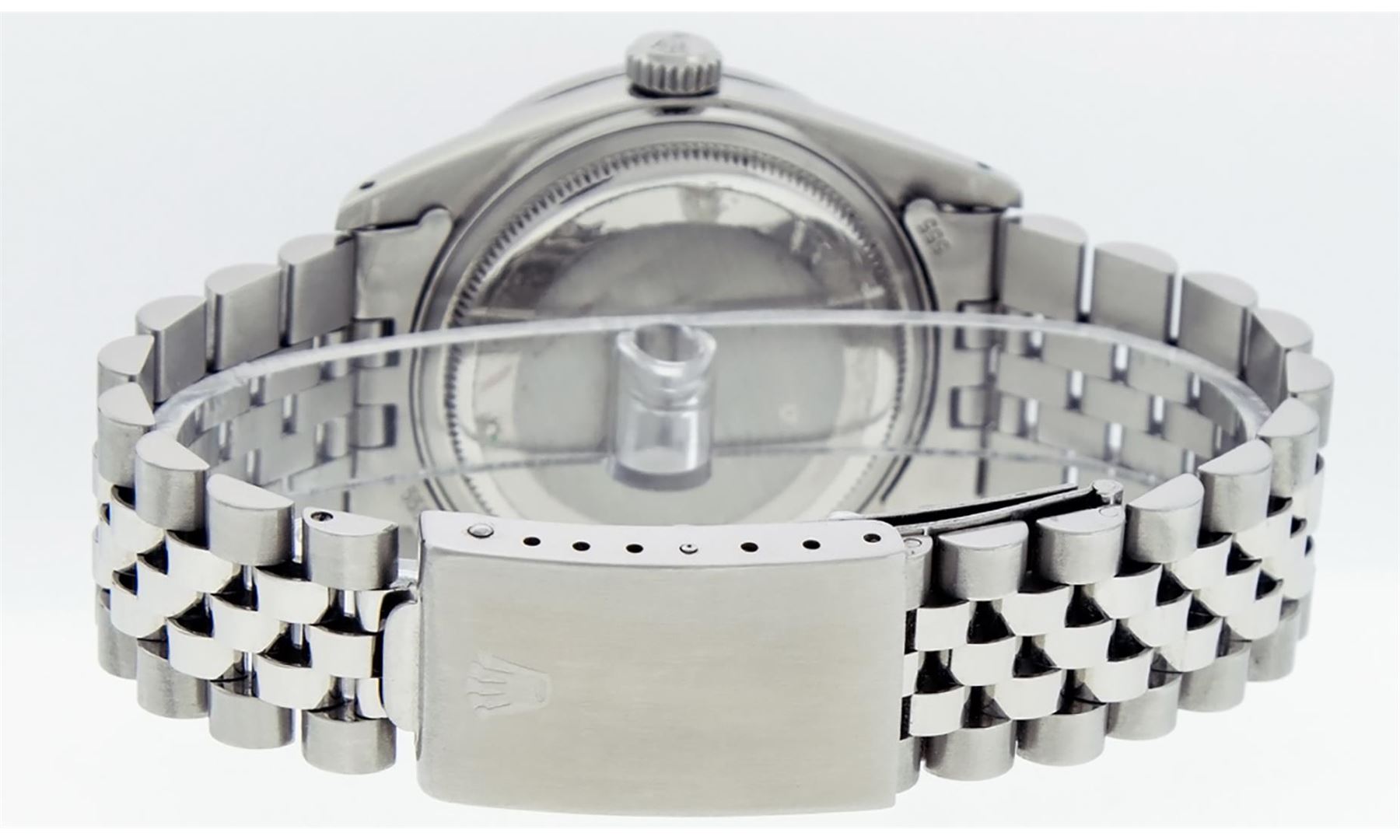 One Mens Pre Owned Rolex Stainless Steel Datejust Polished Bright with Satin Finish, This Watch Has Been Serviced And Electronically Tested, Stainless Steel Case: 36mm, Rolex Stainless Steel Crown, Custom Bezel: New Stainless Steel Beadset Diamond Bezel, Diamond Count: 54 Diamonds. Custom Crystal: New Sapphire With Magnified Date Window. Custom Hands: New Luminescent Hands. Rolex Movement: Automatic Winding Movement 3035. Custom Dial: Custom Blue Dial With Added String Diamonds, Diamond Count: 58 Diamonds In Dial. Date Window: 3 O'Clock Position Date Display, Quickset, Model: Quickset Datejust. Condition: G-6 Extra Fine. Rolex Bracelet: Stainless Steel Jubilee Band. Bright Polish And Satin Finish. 7.0 Inch Length, Adjustable. Standard Clasp, With Rolex Logo. This Watch Has Been Serviced Time Tested And Is In Excellent Condition It Is Free Of All Scratches And Dents.