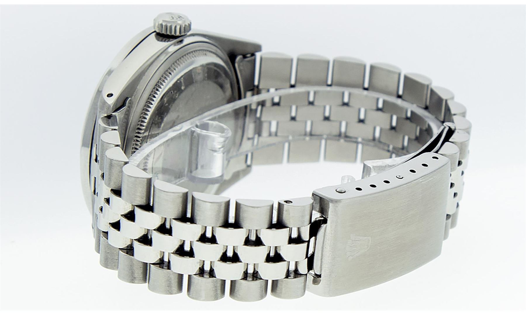 One Mens Pre Owned Rolex Stainless Steel Datejust Polished Bright with Satin Finish, This Watch Has Been Serviced And Electronically Tested, Stainless Steel Case: 36mm, Rolex Stainless Steel Crown, Custom Bezel: New Stainless Steel Beadset Diamond Bezel, Diamond Count: 54 Diamonds. Custom Crystal: New Sapphire With Magnified Date Window. Custom Hands: New Luminescent Hands. Rolex Movement: Automatic Winding Movement 3035. Custom Dial: Custom Blue Dial With Added String Diamonds, Diamond Count: 58 Diamonds In Dial. Date Window: 3 O'Clock Position Date Display, Quickset, Model: Quickset Datejust. Condition: G-6 Extra Fine. Rolex Bracelet: Stainless Steel Jubilee Band. Bright Polish And Satin Finish. 7.0 Inch Length, Adjustable. Standard Clasp, With Rolex Logo. This Watch Has Been Serviced Time Tested And Is In Excellent Condition It Is Free Of All Scratches And Dents.
