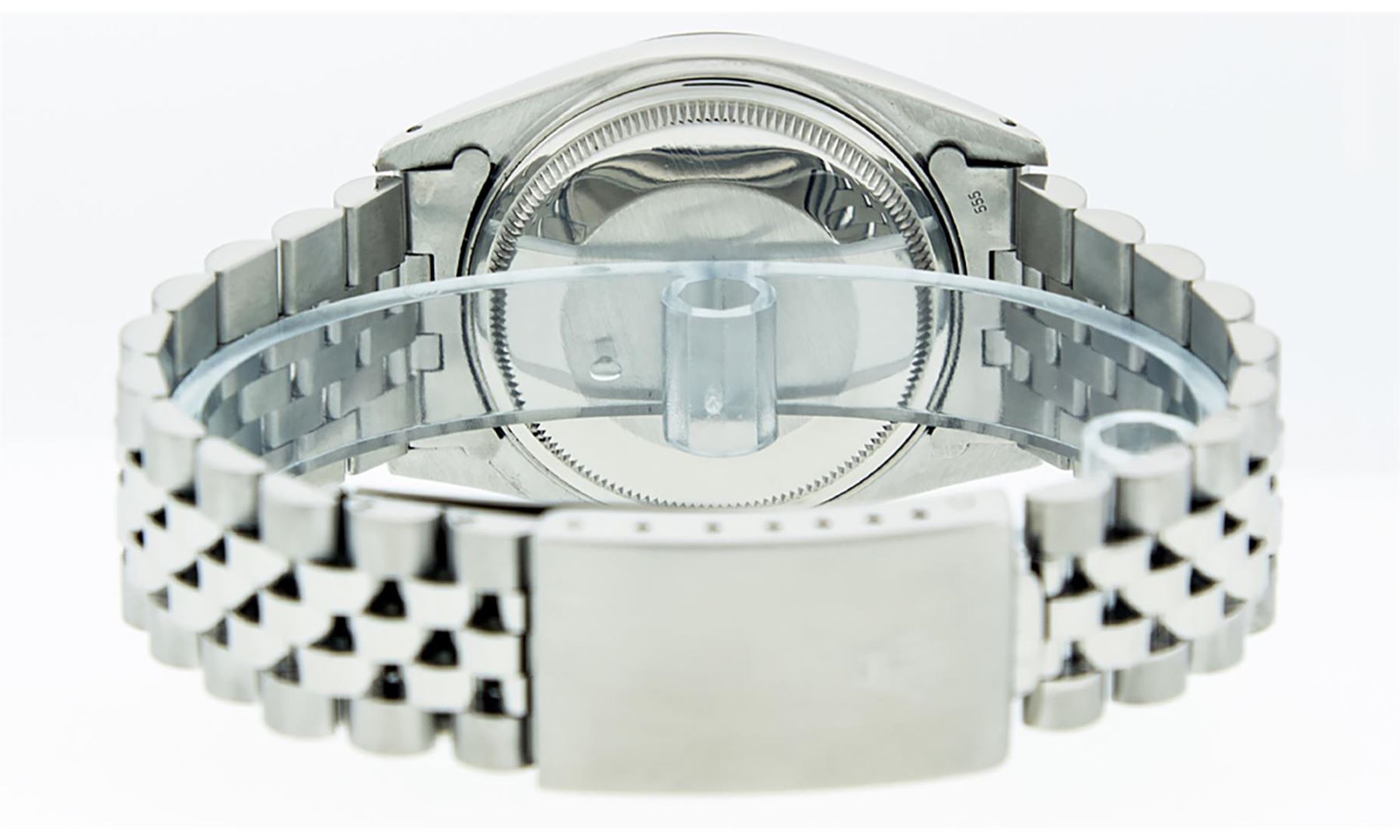 One Mens Pre Owned Stainless Steel Rolex Datejust Polished Bright with Satin Finish, This Watch Has Been Serviced And Electronically Tested, Stainless Steel Case: 36mm, Stainless Steel Crown, Rolex Bezel: White Gold Fluted Bezel. Custom Crystal: New Acrylic With Magnified Date Window. Custom Hands: New Luminescent Hands. Rolex Movement: Automatic Winding Movement 3035. Custom Dial: Custom Blue Dial With Added Diamond Hour Markers, Diamond Count: 10 Diamonds On Dial. Date Window: 3 O'Clock Position Date Display, Quickset, Model: Datejust, Condition: G-6 Extra Fine. Rolex Bracelet: Stainless Steel Jubilee Band. Bright Polish And Satin Finish. 7.0 Inch Length, Adjustable. Standard Clasp, With Rolex Logo. This Watch Has Been Serviced Time Tested And Is In Excellent Condition It Is Free Of All Scratches And Dents.