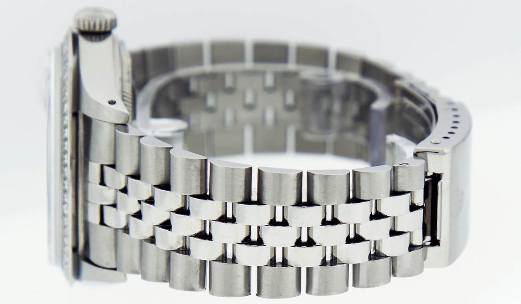 One Mens Pre Owned Rolex Stainless Steel Datejust Polished Bright with Satin Finish, This Watch Has Been Serviced And Electronically Tested, Stainless Steel Case: 36mm, Rolex Stainless Steel Crown, Custom Bezel: New Stainless Steel Beadset Diamond Bezel, Diamond Count: 54 Diamonds. Custom Crystal: New Sapphire With Magnified Date Window. Custom Hands: New Luminescent Hands. Rolex Movement: Automatic Winding Movement 3035. Custom Dial: Custom Blue Dial With Added String Diamonds, Diamond Count: 58 Diamonds In Dial. Date Window: 3 O'Clock Position Date Display, Quickset, Model: Quickset Datejust. Condition: G-6 Extra Fine. Rolex Bracelet: Stainless Steel Jubilee Band. Bright Polish And Satin Finish. 7.0 Inch Length, Adjustable. Standard Clasp, With Rolex Logo. This Watch Has Been Serviced Time Tested And Is In Excellent Condition It Is Free Of All Scratches And Dents.