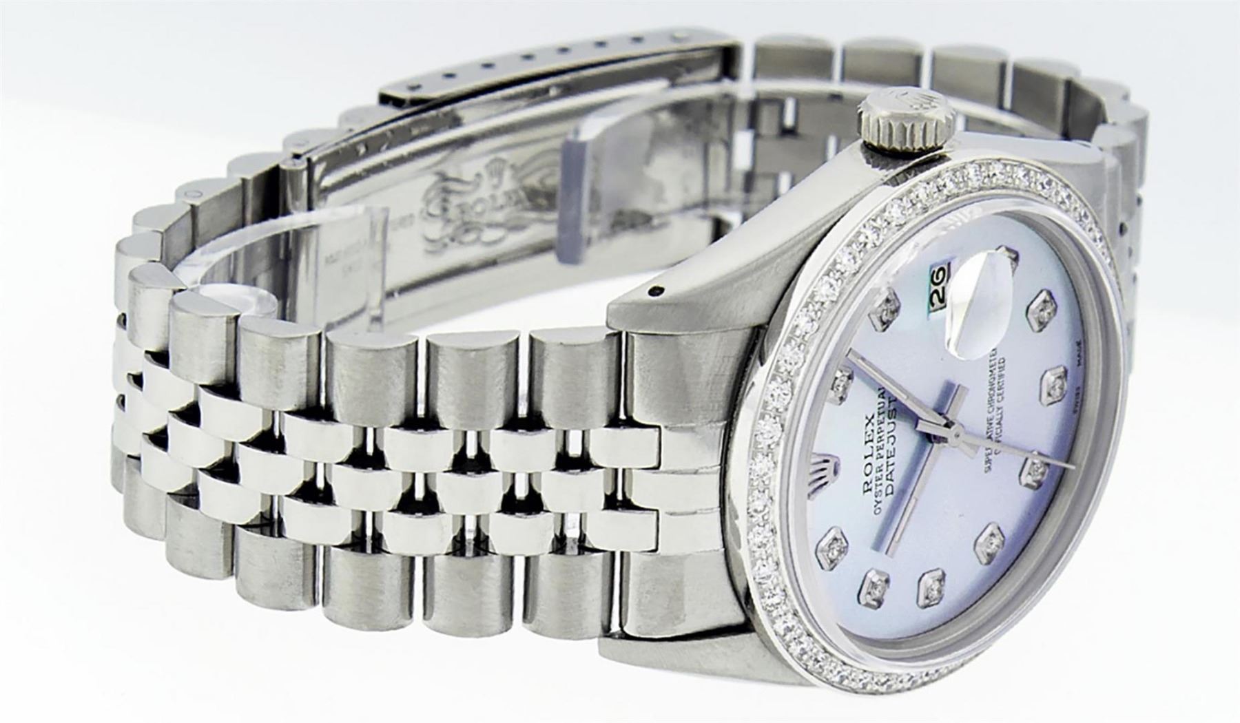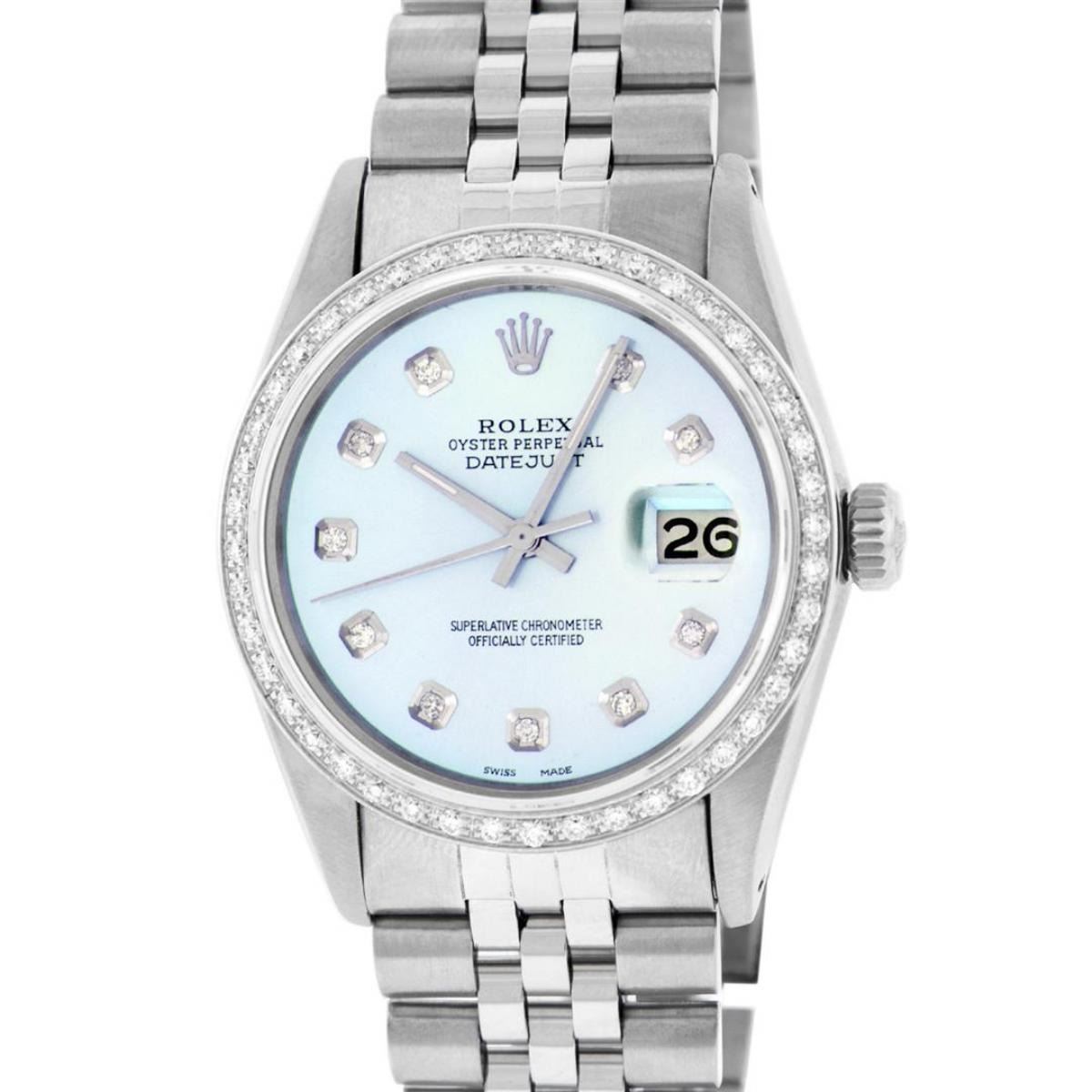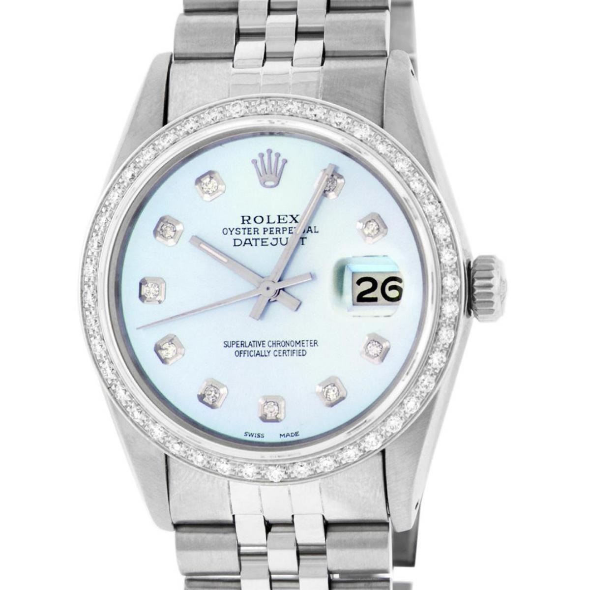 One Mens Stainless Steel Rolex Datejust Polished, Serviced & Electronically Tested, Stainless Steel Case: 36mm, Stainless Steel Crown, Custom Bezel: New 18K White Gold Beadset Diamond Bezel, Diamond Count: 44 Diamonds In Bezel, Total Weight 1.00 Carat, Clarity: SI-VS, Color: G to H. Custom Crystal: New Scratch Resistant Synthetic Sapphire Cyclops Lens. Custom Hands: New Luminescent Hands. Movement: Automatic Winding Movement. Custom Dial: Blue Diamond Dial, Diamond Count: 10 Diamonds in Dial, G To H In Color, Clarity: SI-VS. Date Window: 3 O'Clock Position Date Display, Quickset, Model: Datejust. Condition: G-6 Extra Fine. Bracelet: Stainless Steel Jubilee Band. Bright Polish & Satin Finish. 7.0 Inch Length, Adjustable. Standard Clasp, With Rolex Logo. This Watch Has Been Serviced Time Tested And Is In Excellent Condition It Is Free Of All Scratches And Dents.