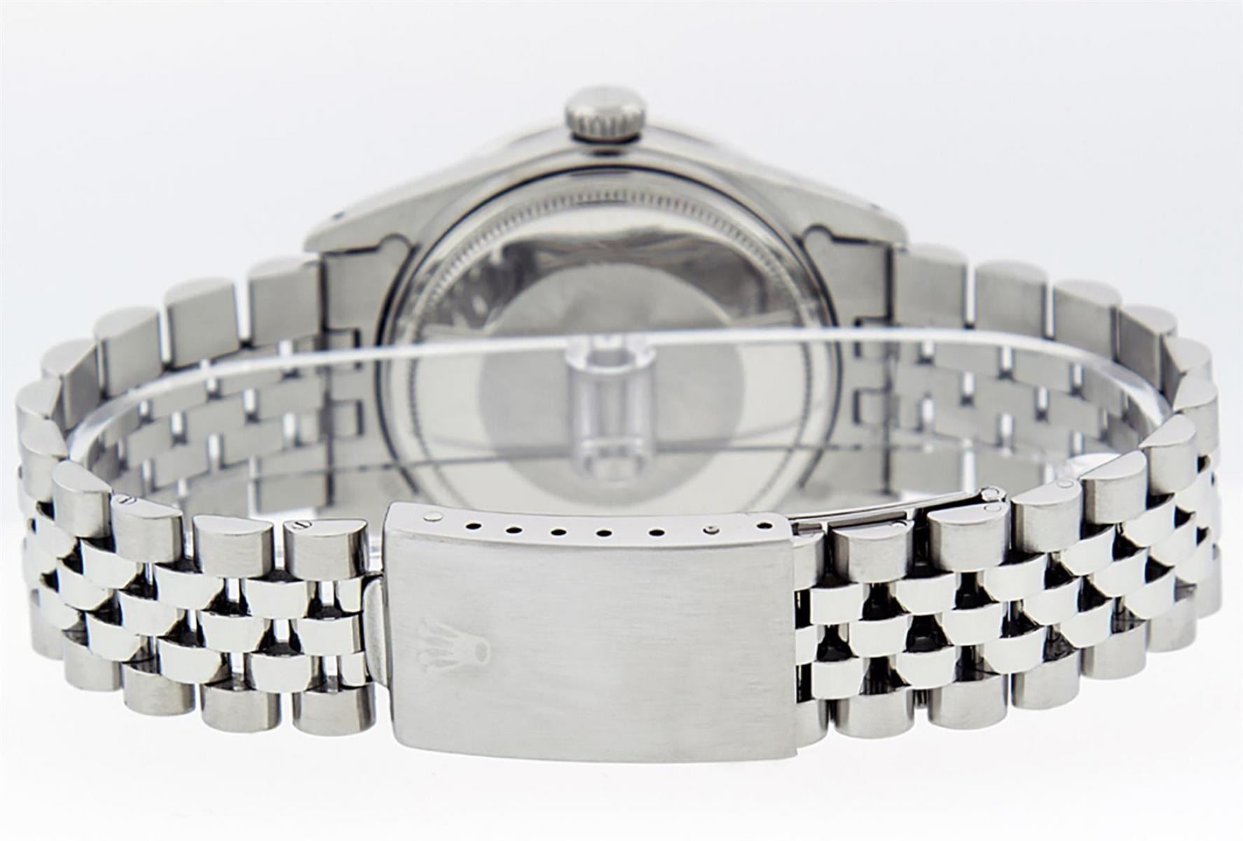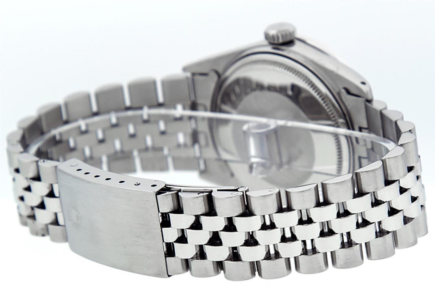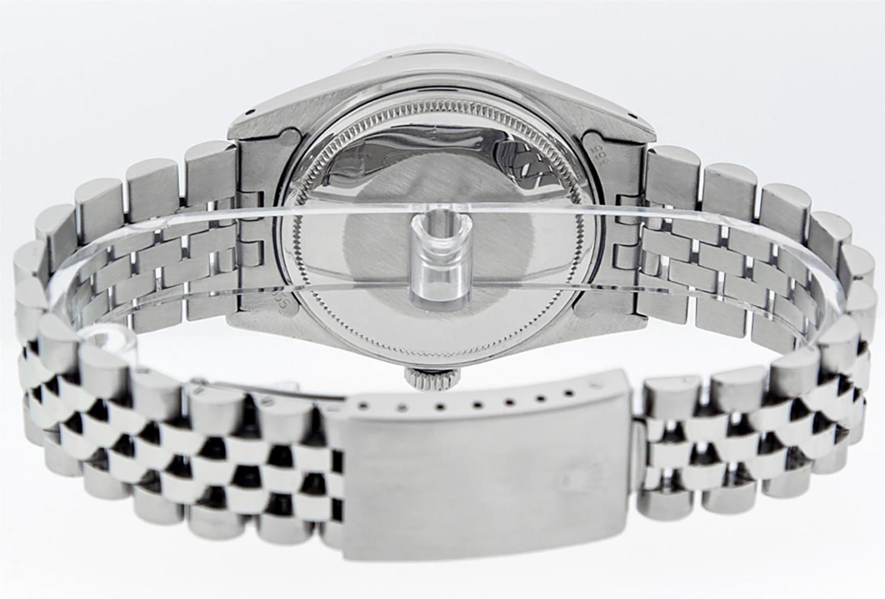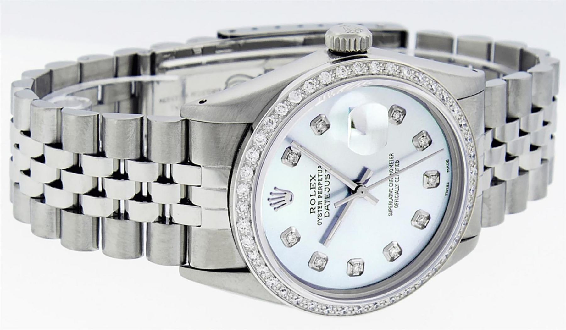 One Mens Stainless Steel Rolex Datejust Polished, Serviced & Electronically Tested, Stainless Steel Case: 36mm, Stainless Steel Crown, Custom Bezel: New 18K White Gold Beadset Diamond Bezel, Diamond Count: 44 Diamonds In Bezel, Total Weight 1.00 Carat, Clarity: SI-VS, Color: G to H. Custom Crystal: New Scratch Resistant Synthetic Sapphire Cyclops Lens. Custom Hands: New Luminescent Hands. Movement: Automatic Winding Movement. Custom Dial: Blue Diamond Dial, Diamond Count: 10 Diamonds in Dial, G To H In Color, Clarity: SI-VS. Date Window: 3 O'Clock Position Date Display, Quickset, Model: Datejust. Condition: G-6 Extra Fine. Bracelet: Stainless Steel Jubilee Band. Bright Polish & Satin Finish. 7.0 Inch Length, Adjustable. Standard Clasp, With Rolex Logo. This Watch Has Been Serviced Time Tested And Is In Excellent Condition It Is Free Of All Scratches And Dents.