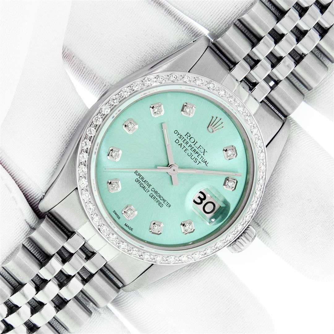 One Mens Stainless Steel Rolex Datejust Polished, Serviced & Electronically Tested, Stainless Steel Case: 36mm, Stainless Steel Crown, Custom Bezel: New 18K White Gold Beadset Diamond Bezel, Diamond Count: 44 Diamonds In Bezel, Total Weight 1.00 Carat, Clarity: SI-VS, Color: G to H. Custom Crystal: New Scratch Resistant Synthetic Sapphire Cyclops Lens. Custom Hands: New Luminescent Hands. Movement: Automatic Winding Movement. Custom Dial: Blue Diamond Dial, Diamond Count: 10 Diamonds in Dial, G To H In Color, Clarity: SI-VS. Date Window: 3 O'Clock Position Date Display, Quickset, Model: Datejust. Condition: G-6 Extra Fine. Bracelet: Stainless Steel Jubilee Band. Bright Polish & Satin Finish. 7.0 Inch Length, Adjustable. Standard Clasp, With Rolex Logo. This Watch Has Been Serviced Time Tested And Is In Excellent Condition It Is Free Of All Scratches And Dents. This Watch Comes With A Rolex Box.