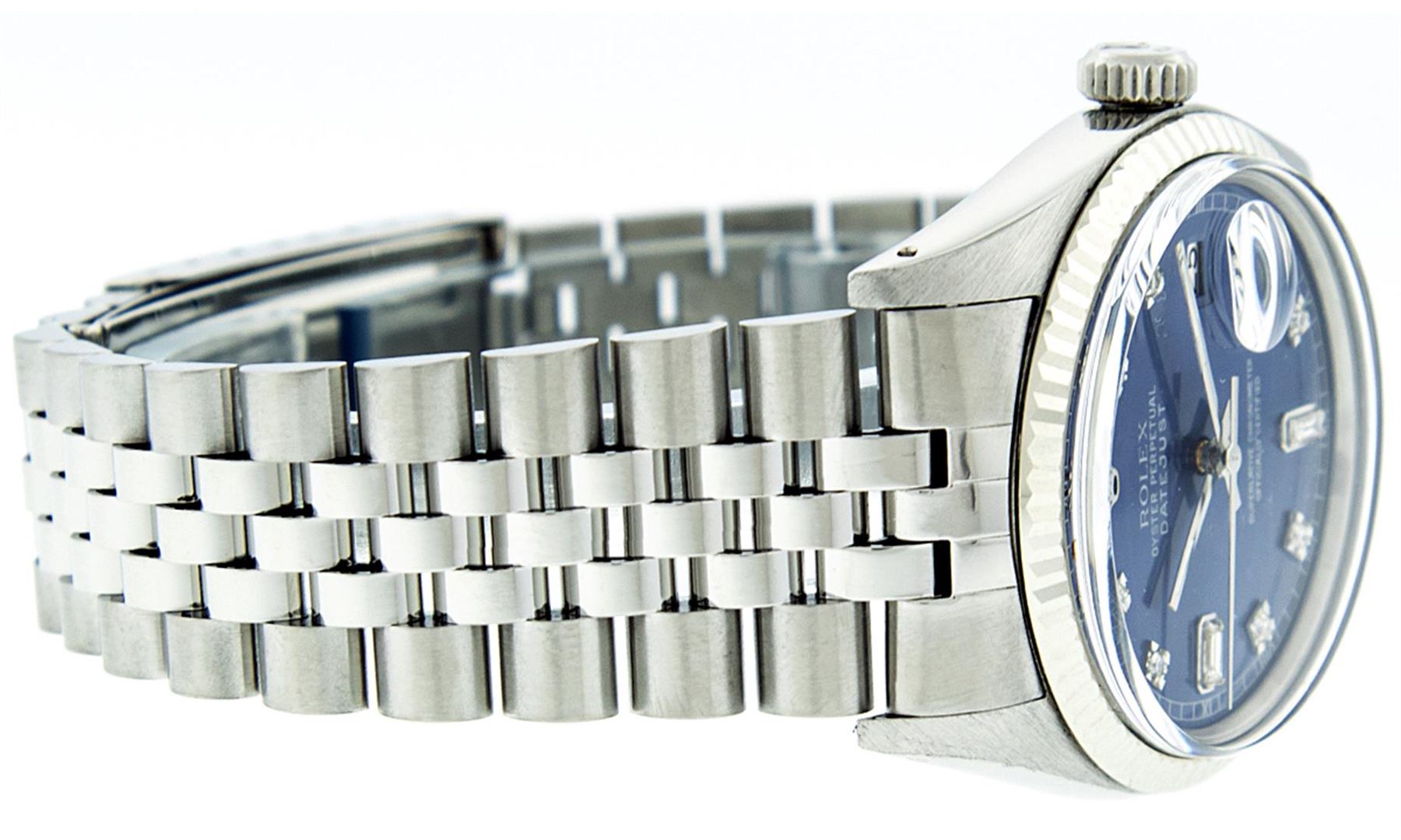 One Mens Rolex Datejust Polished, Serviced & Electronically Tested, Stainless Steel Case:36mm, Stainless Steel Crown, Bezel: 18K White Gold Fluted Bezel. Custom Crystal: Sapphire Cyclops Lens. Movement: Automatic Winding Movement Caliber 3135. Custom Dial: Blue With Diamond Hour Markers Square Setting, Diamond Count: 8 Diamonds + 2 Baguettes, Clarity: SI-VS, Color: G to H. Date Window: 3 O'Clock Position Date Display, Quickset, Model: 16234 Sapphire Datejust. Condition: G-6 Extra Fine. Bracelet: Stainless Steel Jubilee. Bright Polish & Satin Finish. 7.0 Inch Length, Adjustable. Standard Clasp, With Rolex Logo.