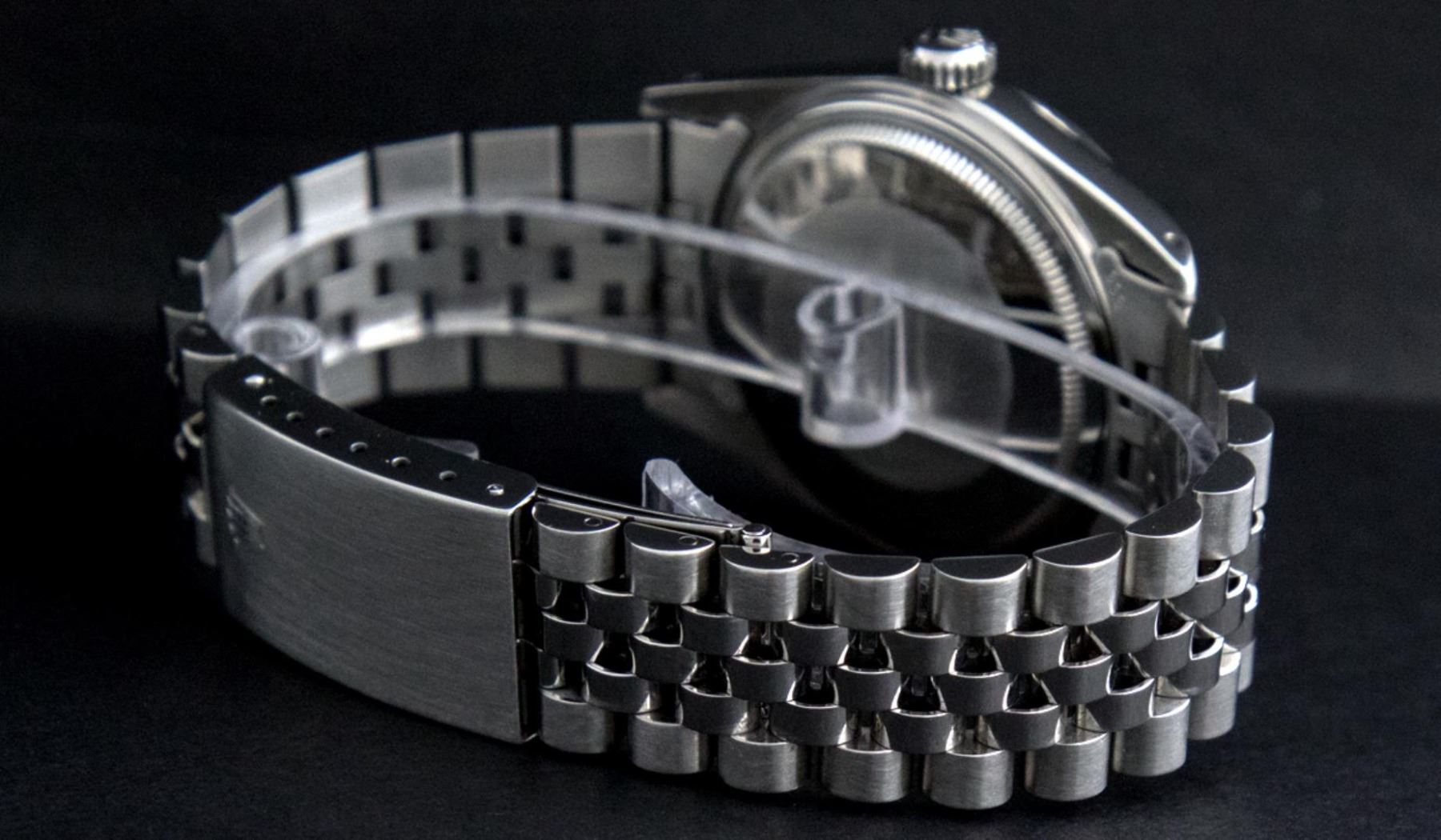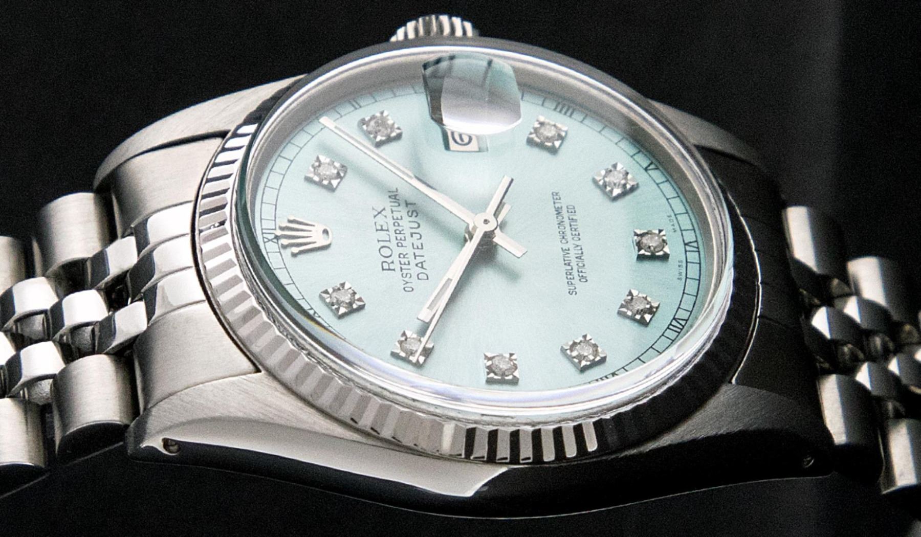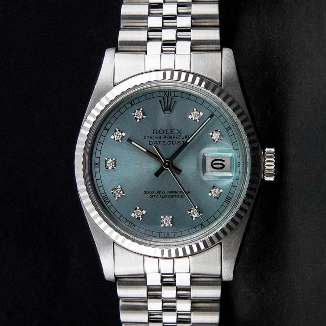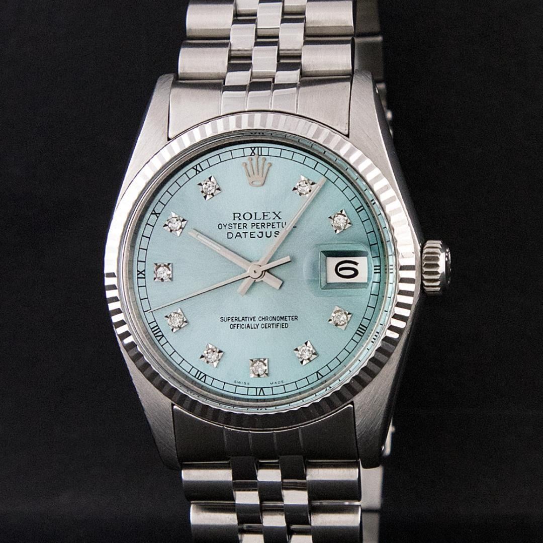 One Mens Pre Owned Stainless Steel Rolex Datejust Polished Bright with Satin Finish, This Watch Has Been Serviced And Electronically Tested, Rolex Stainless Steel Case: 36mm, Rolex Stainless Steel Crown, Rolex Bezel: 14K White Gold Fluted Bezel. Custom Crystal: New Acrylic With Magnified Date Window. Custom Hands: New Luminescent Hands. Rolex Movement: Automatic Winding Movement 3035. Custom Dial: Custom Blue Dial With Added Diamond Hour Markers, 10 Diamonds On Dial. Date Window: 3 O'Clock Position Date Display, Quickset, Model: Quickset Datejust, Condition: G-6 Extra Fine. Rolex Bracelet: Stainless Steel Jubilee Band. Bright Polish And Satin Finish. 7.0 Inch Length, Adjustable. Standard Clasp, With Rolex Logo. This Watch Has Been Serviced Time Tested And Is In Excellent Condition It Is Free Of All Scratches And Dents.