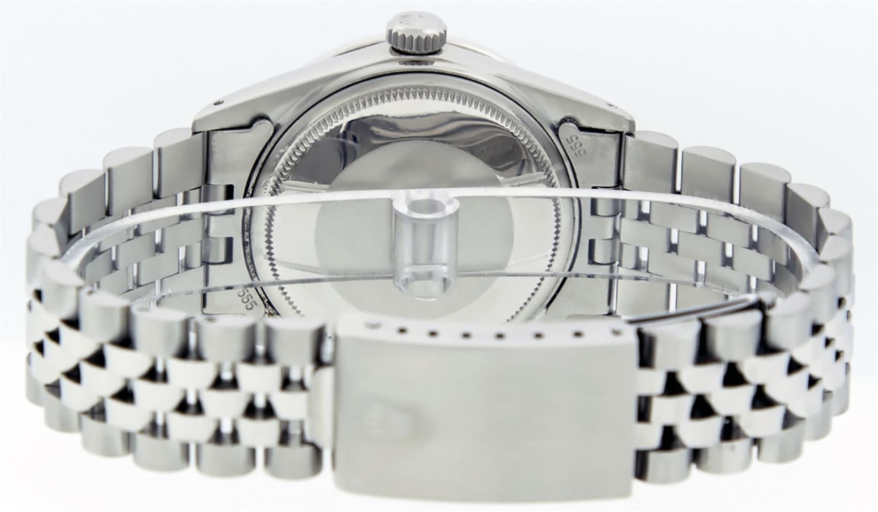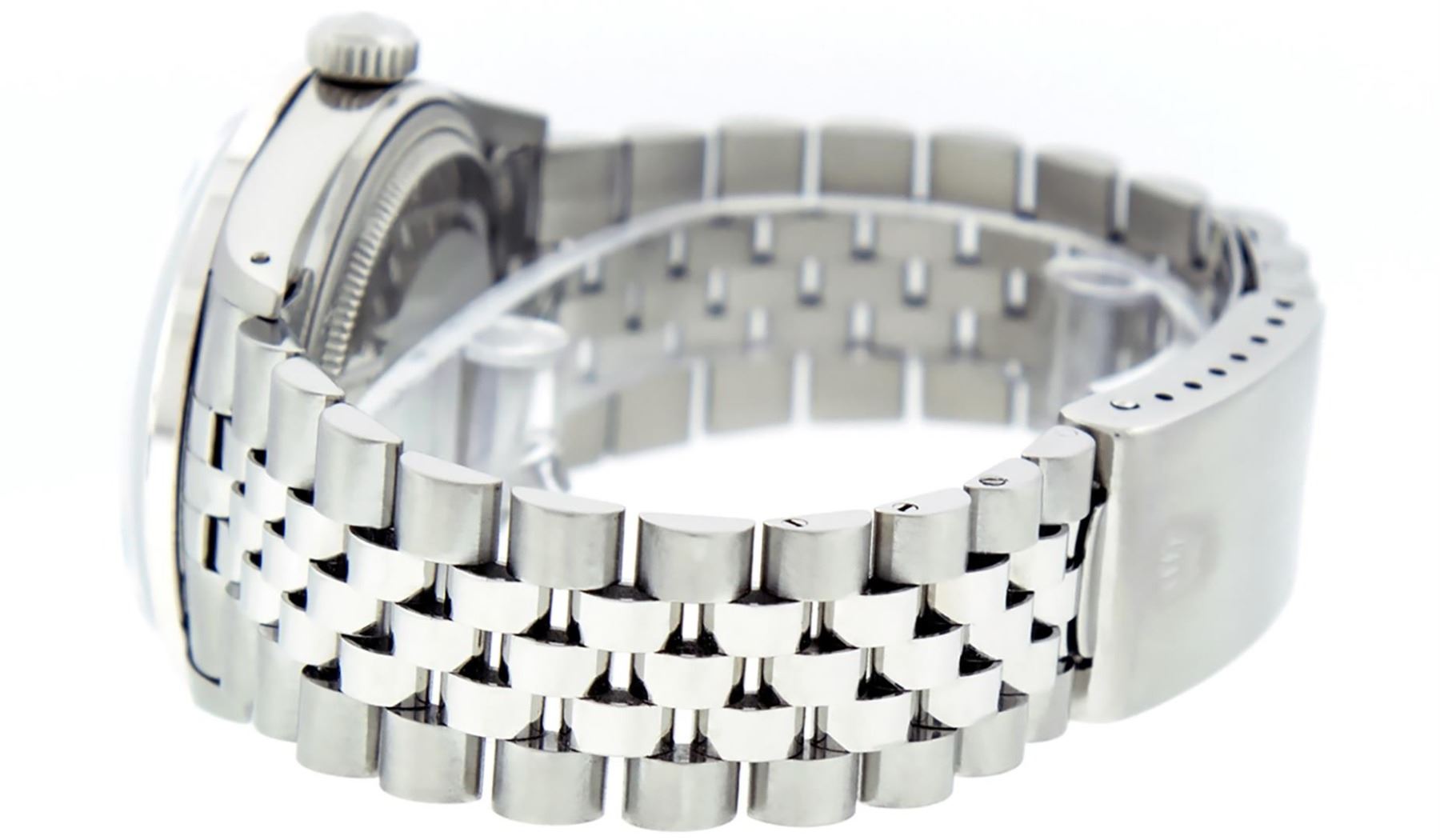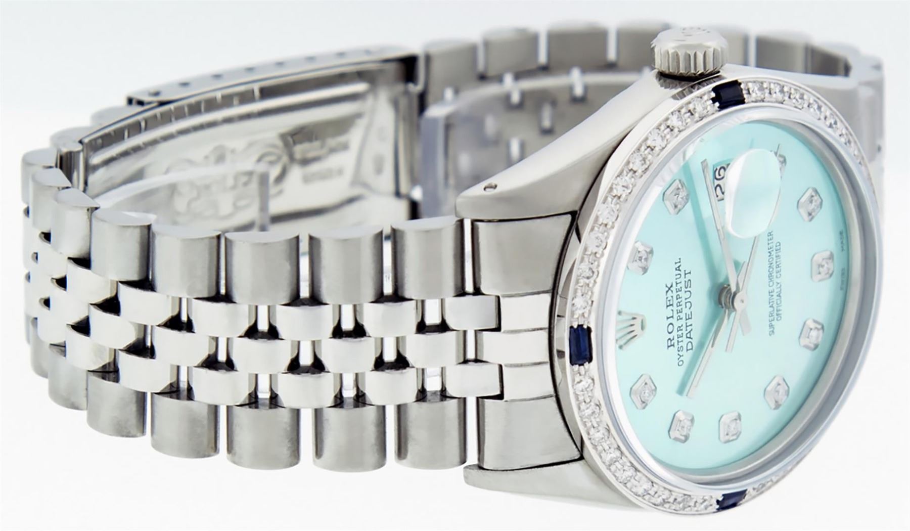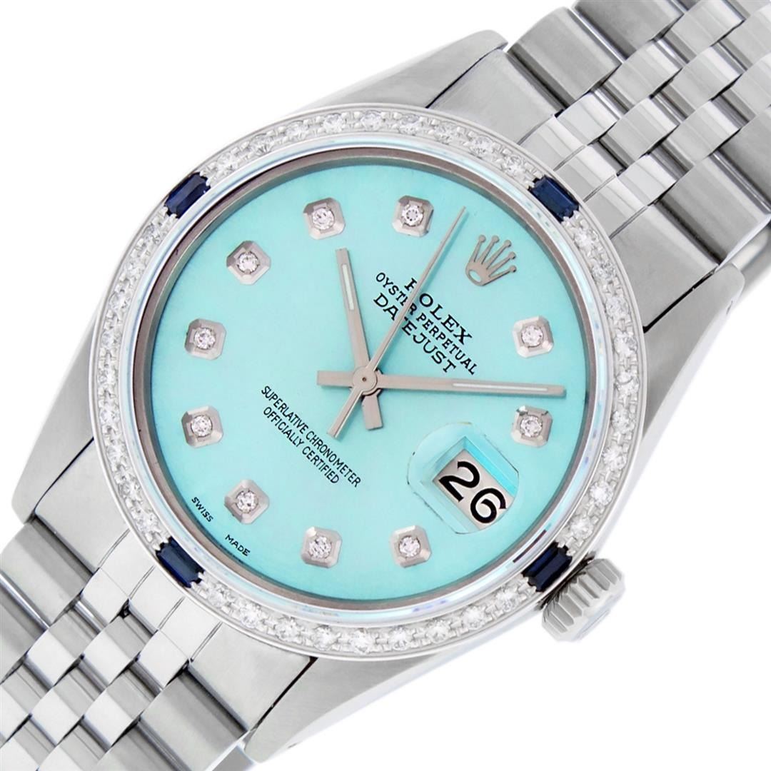 One Mens Pre Owned Stainless Steel Rolex Datejust Polished, Serviced & Electronically Tested, Rolex Stainless Steel Case: 36mm, Rolex Stainless Steel Crown, Custom Bezel: New 18K White Gold Sapphire Beadset Diamond Bezel, Diamond + Gem Count: 36 Diamonds + 4 Sapphires, Clarity: SI-VS, Color: G to H. Custom Crystal: New Sapphire With Magnified Date Window. Custom Hands: New Luminescent Hands. Rolex Movement: Automatic Winding Movement. Custom Dial: Refinished To Blue With Custom Added Diamond Hour Markers, 10 Diamond Dial, G To H In Color, Clarity: SI-VS. Date Window: 3 O'Clock Position Date Display, Quickset, Model: Datejust. Condition: G-6 Extra Fine. Rolex Bracelet: Stainless Steel Jubilee Band. Bright Polish & Satin Finish. 7.0 Inch Length, Adjustable. Standard Clasp, With Rolex Logo. This Pre Owned Watch Has Been Serviced Time Tested And Is In Excellent Condition It Is Free Of All Scratches And Dents
