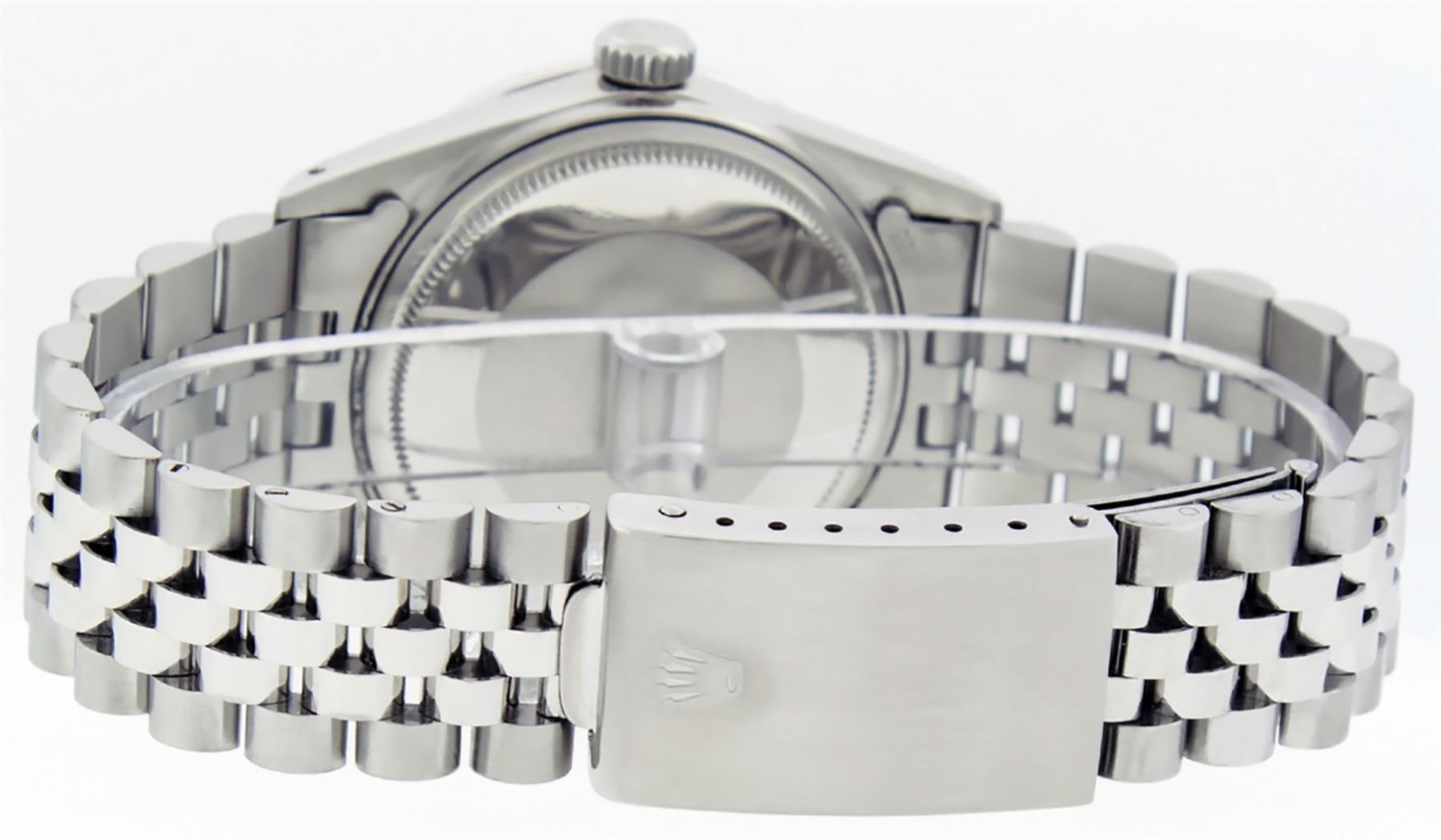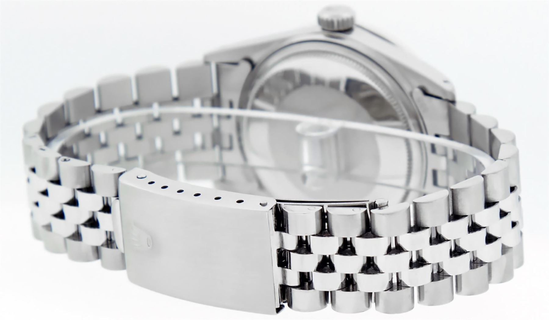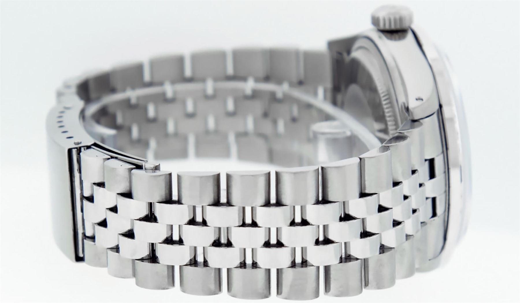 One Mens Pre Owned Stainless Steel Rolex Datejust Polished, Serviced & Electronically Tested, Rolex Stainless Steel Case: 36mm, Rolex Stainless Steel Crown, Custom Bezel: New 18K White Gold Sapphire Beadset Diamond Bezel, Diamond + Gem Count: 36 Diamonds + 4 Sapphires, Clarity: SI-VS, Color: G to H. Custom Crystal: New Sapphire With Magnified Date Window. Custom Hands: New Luminescent Hands. Rolex Movement: Automatic Winding Movement. Custom Dial: Refinished To Blue With Custom Added Diamond Hour Markers, 10 Diamond Dial, G To H In Color, Clarity: SI-VS. Date Window: 3 O'Clock Position Date Display, Quickset, Model: Datejust. Condition: G-6 Extra Fine. Rolex Bracelet: Stainless Steel Jubilee Band. Bright Polish & Satin Finish. 7.0 Inch Length, Adjustable. Standard Clasp, With Rolex Logo. This Pre Owned Watch Has Been Serviced Time Tested And Is In Excellent Condition It Is Free Of All Scratches And Dents