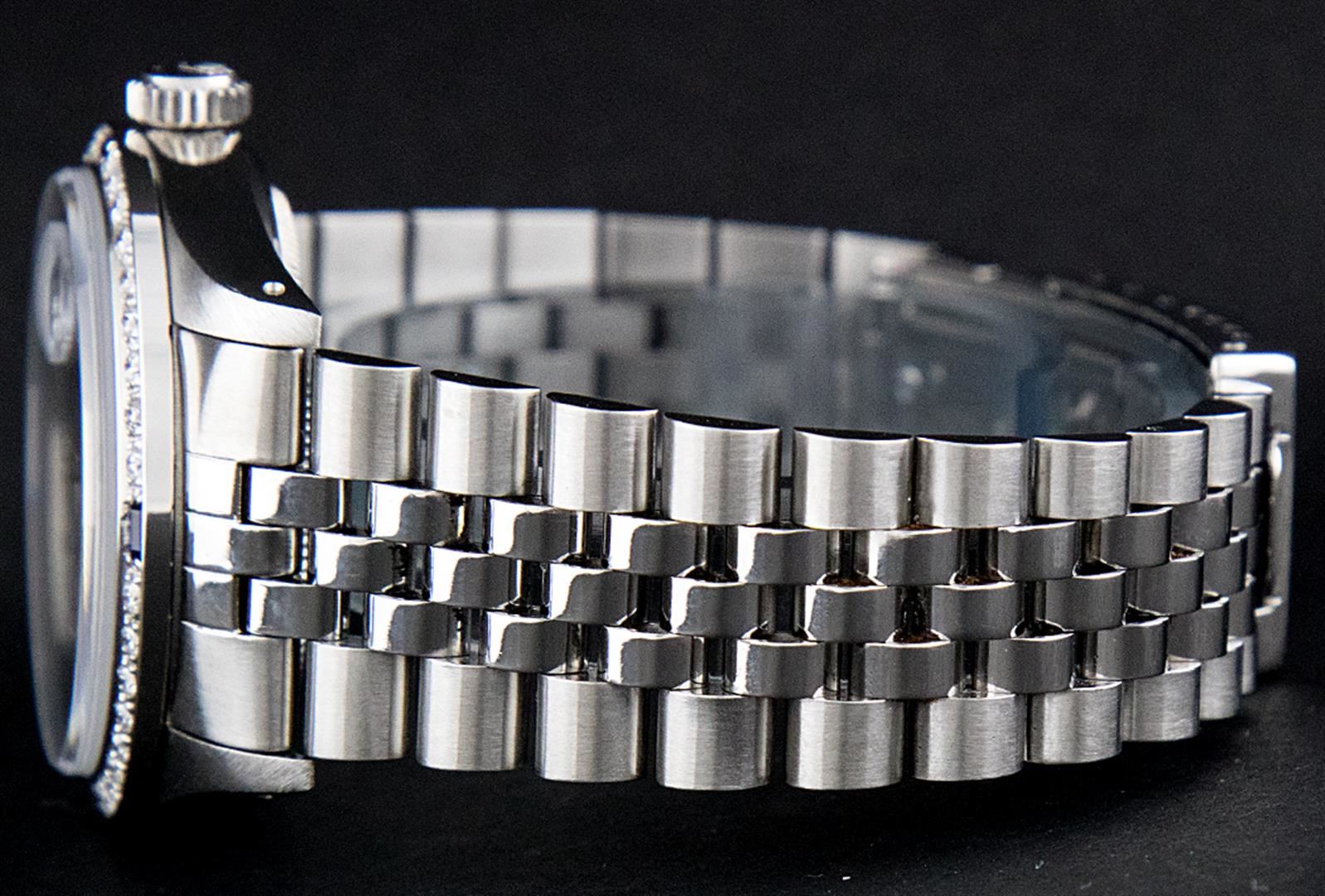 One Mens Pre Owned Stainless Steel Rolex Datejust Polished, Serviced & Electronically Tested, Stainless Steel Case: 36mm, Rolex Stainless Steel Crown, Custom Bezel: New 18K White Gold Sapphire Bead set Diamond Bezel, Diamond + Gem Count: 36 Diamonds + 4 Sapphires, Clarity: SI-VS, Color: G to H. Custom Crystal: New Sapphire With Magnified Date. Custom Hands: New Luminescent Hands. Rolex Movement: Automatic Winding Movement. Custom Dial: Refinished To Blue With Custom Added Diamond Hour Markers & Dash Track, 10 Diamonds in Dial, G To H In Color, Clarity: SI-VS. Date Window: 3 O'clock Position Date Display, Quickset, Model: Datejust. Condition: G-6 Extra Fine. Rolex Bracelet: Stainless Steel Jubilee Band. Bright Polish & Satin Finish. 7.0 Inch Length, Adjustable. Standard Clasp, With Rolex Logo. This Watch Has Been Serviced Time Tested And Is In Excellent Condition It Is Free Of All Scratches And Dents.