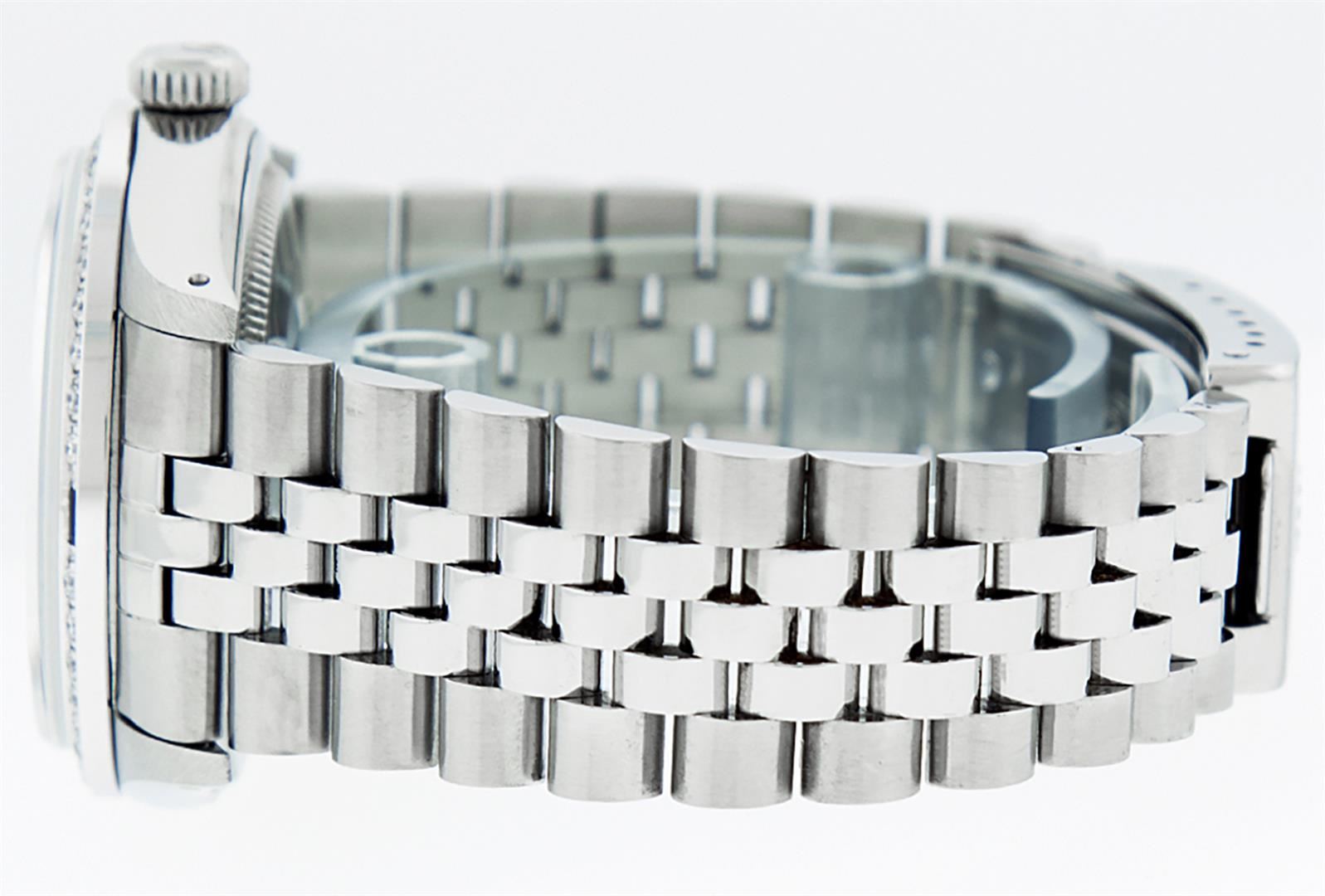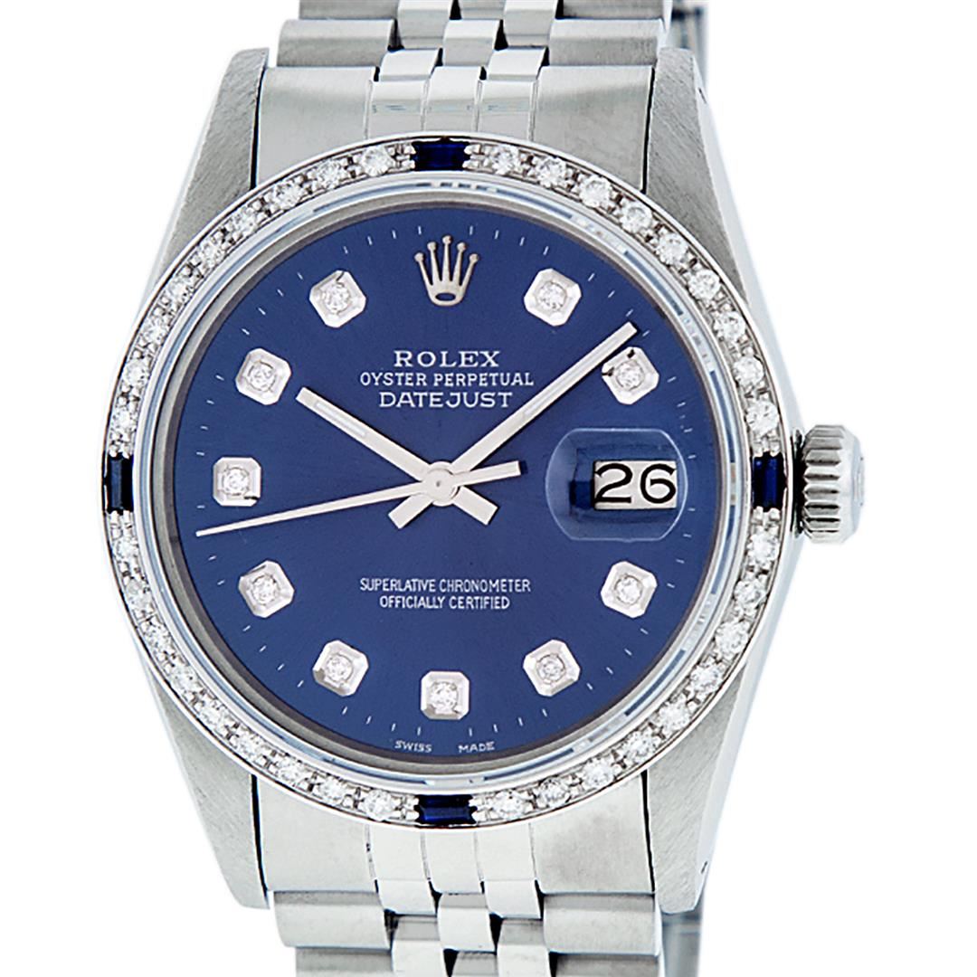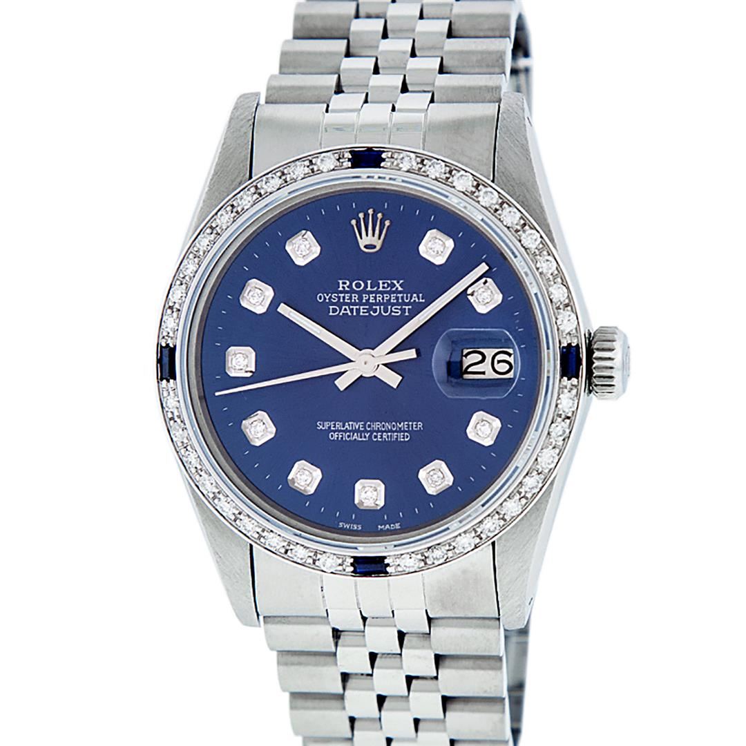 One Mens Pre Owned Stainless Steel Rolex Datejust Polished, Serviced & Electronically Tested, Stainless Steel Case: 36mm, Rolex Stainless Steel Crown, Custom Bezel: New 18K White Gold Sapphire Beadset Diamond Bezel, Diamond + Gem Count: 36 Diamonds + 4 Sapphires, Clarity: SI-VS, Color: G to H. Custom Crystal: New Sapphire With Magnified Date. Custom Hands: New Luminescent Hands. Rolex Movement: Automatic Winding Movement. Custom Dial: Refinished To Blue With Custom Added Diamond Hour Markers & Dash Track, 10 Diamonds in Dial, G To H In Color, Clarity: SI-VS. Date Window: 3 O'Clock Position Date Display, Quickset, Model: Datejust. Condition: G-6 Extra Fine. Rolex Bracelet: Stainless Steel Jubilee Band. Bright Polish & Satin Finish. 7.0 Inch Length, Adjustable. Standard Clasp, With Rolex Logo. This Watch Has Been Serviced Time Tested And Is In Excellent Condition It Is Free Of All Scratches And Dents.