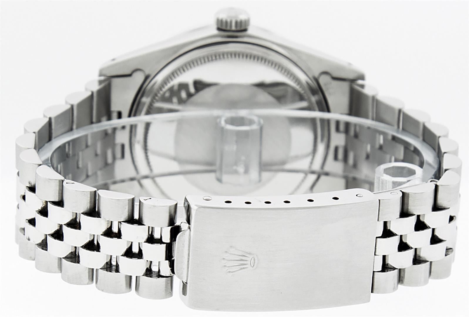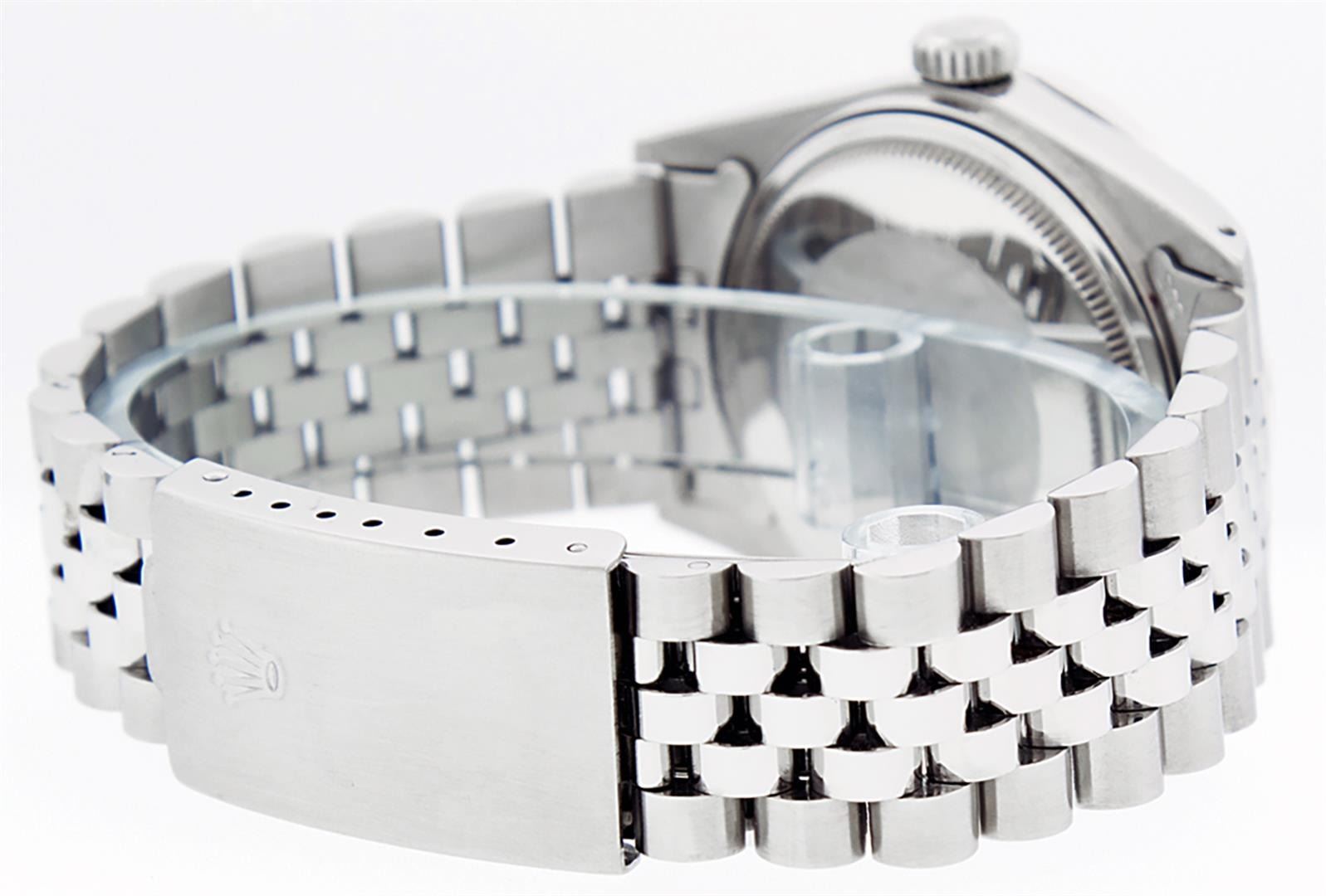 One Mens Pre Owned Stainless Steel Rolex Datejust Polished, Serviced & Electronically Tested, Stainless Steel Case: 36mm, Rolex Stainless Steel Crown, Custom Bezel: New 18K White Gold Sapphire Beadset Diamond Bezel, Diamond + Gem Count: 36 Diamonds + 4 Sapphires, Clarity: SI-VS, Color: G to H. Custom Crystal: New Sapphire With Magnified Date. Custom Hands: New Luminescent Hands. Rolex Movement: Automatic Winding Movement. Custom Dial: Refinished To Blue With Custom Added Diamond Hour Markers & Dash Track, 10 Diamonds in Dial, G To H In Color, Clarity: SI-VS. Date Window: 3 O'Clock Position Date Display, Quickset, Model: Datejust. Condition: G-6 Extra Fine. Rolex Bracelet: Stainless Steel Jubilee Band. Bright Polish & Satin Finish. 7.0 Inch Length, Adjustable. Standard Clasp, With Rolex Logo. This Watch Has Been Serviced Time Tested And Is In Excellent Condition It Is Free Of All Scratches And Dents.