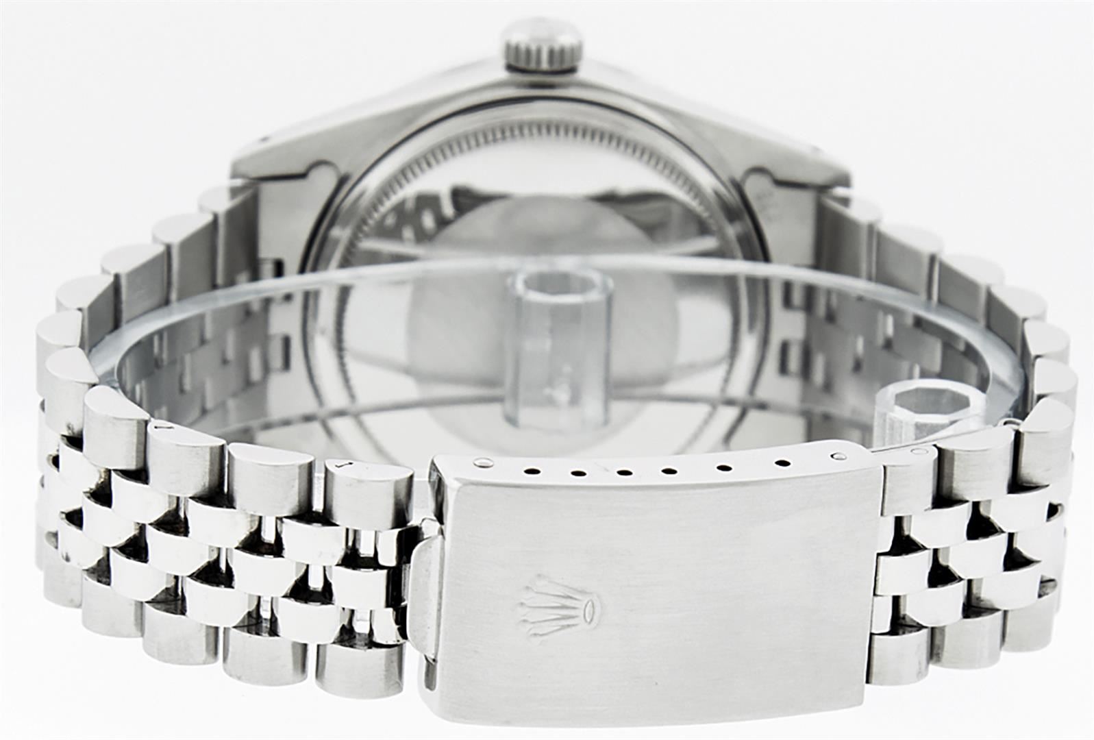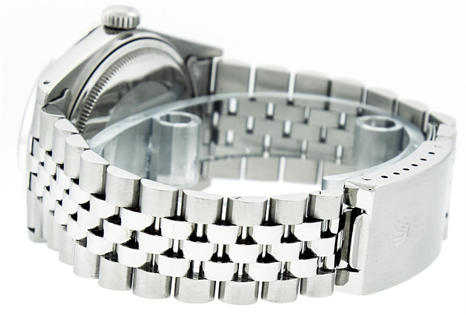 One Mens Pre Owned Stainless Steel Rolex Datejust Polished, Serviced & Electronically Tested, Stainless Steel Case: 36mm, Rolex Stainless Steel Crown, Custom Bezel: New 18K White Gold Sapphire Beadset Diamond Bezel, Diamond + Gem Count: 36 Diamonds + 4 Sapphires, Clarity: SI-VS, Color: G to H. Custom Crystal: New Sapphire With Magnified Date. Custom Hands: New Luminescent Hands. Rolex Movement: Automatic Winding Movement. Custom Dial: Refinished To Blue With Custom Added Diamond Hour Markers & Dash Track, 10 Diamonds in Dial, G To H In Color, Clarity: SI-VS. Date Window: 3 O'Clock Position Date Display, Quickset, Model: Datejust. Condition: G-6 Extra Fine. Rolex Bracelet: Stainless Steel Jubilee Band. Bright Polish & Satin Finish. 7.0 Inch Length, Adjustable. Standard Clasp, With Rolex Logo. This Watch Has Been Serviced Time Tested And Is In Excellent Condition It Is Free Of All Scratches And Dents.