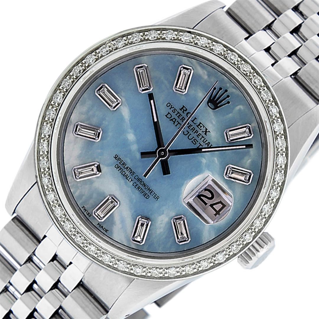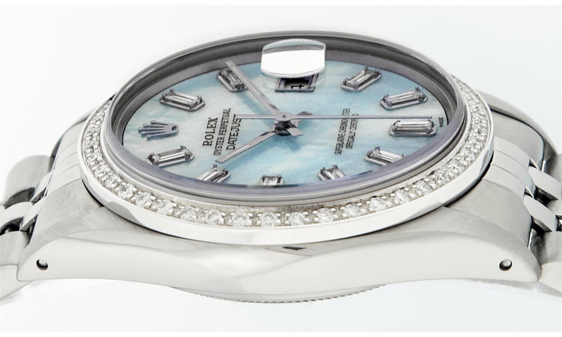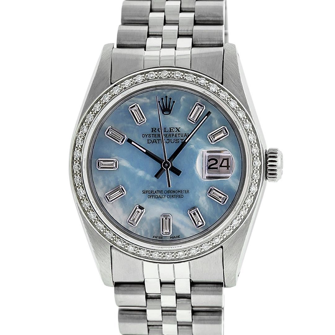 One Mens Pre Owned Rolex Stainless Steel Datejust Polished Bright with Satin Finish, This Watch Has Been Serviced & Electronically Tested, Rolex Stainless Steel Case: 36mm, Rolex Stainless Steel Crown, Custom Bezel: New 18K White Gold Bead set Diamond Bezel, Diamond Count: 44 Diamonds In Bezel, Clarity: SI-VS, Color: G to H. Custom Crystal: New Sapphire With Magnified Date. Custom Hands: New Luminescent Hands. Rolex Movement: Automatic Winding Movement. Custom Dial: Blue Mother Of Pearl With Custom Added Diamonds, Diamond Count: 10 Baguette Diamonds On Dial, Color: G to H, Clarity: VS2-SI1. Date Window: 3 O'clock Position Date Display, Quickset, Model: Datejust. Condition: G-6 Extra Fine. Rolex Bracelet: Stainless Steel Jubilee Band. Bright Polish & Satin Finish. 7.0 Inch Length, Adjustable. Standard Clasp, With Rolex Logo. This Watch Has Been Serviced Time Tested And Is In Excellent Condition It Is Free Of All Scratches And Dents.