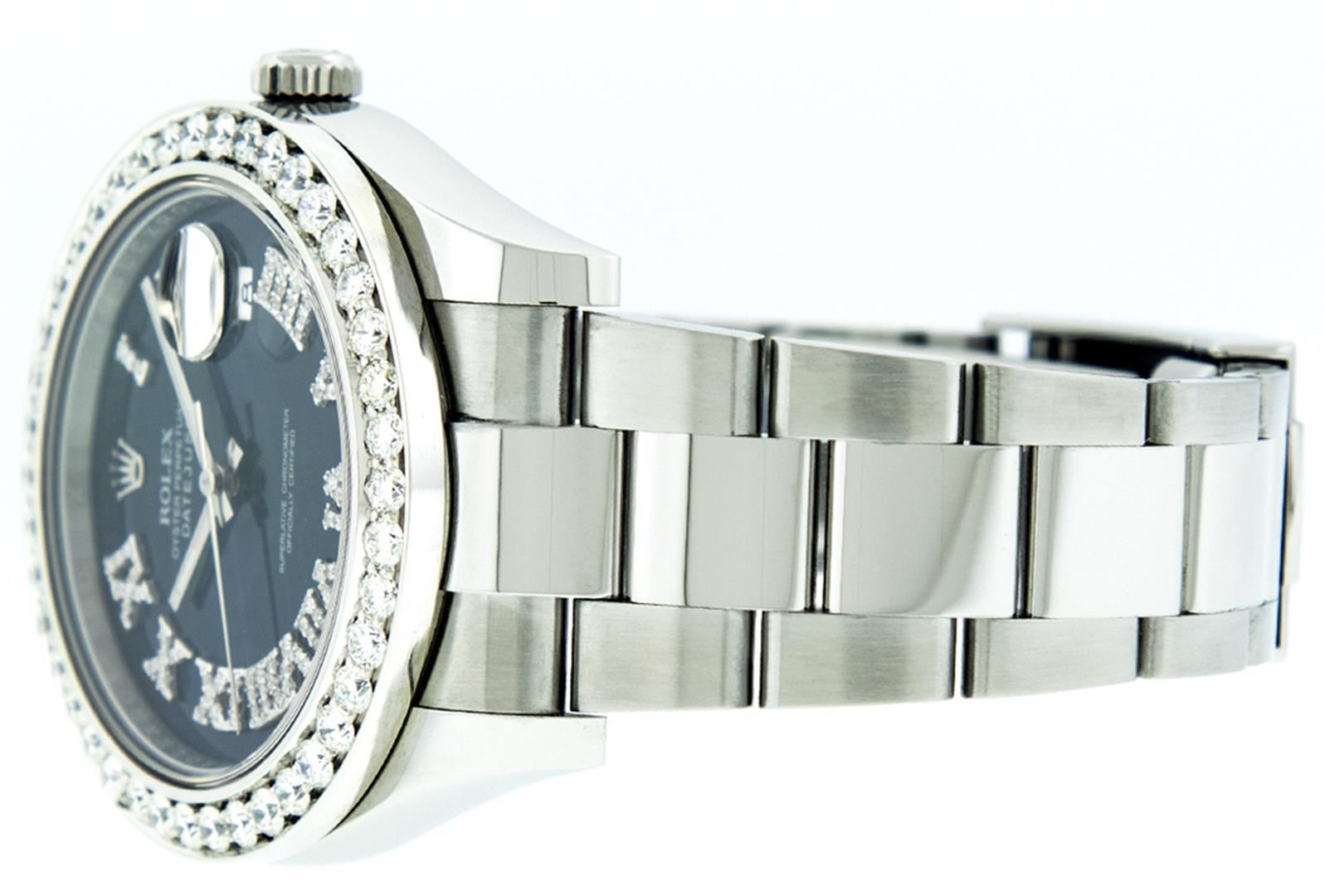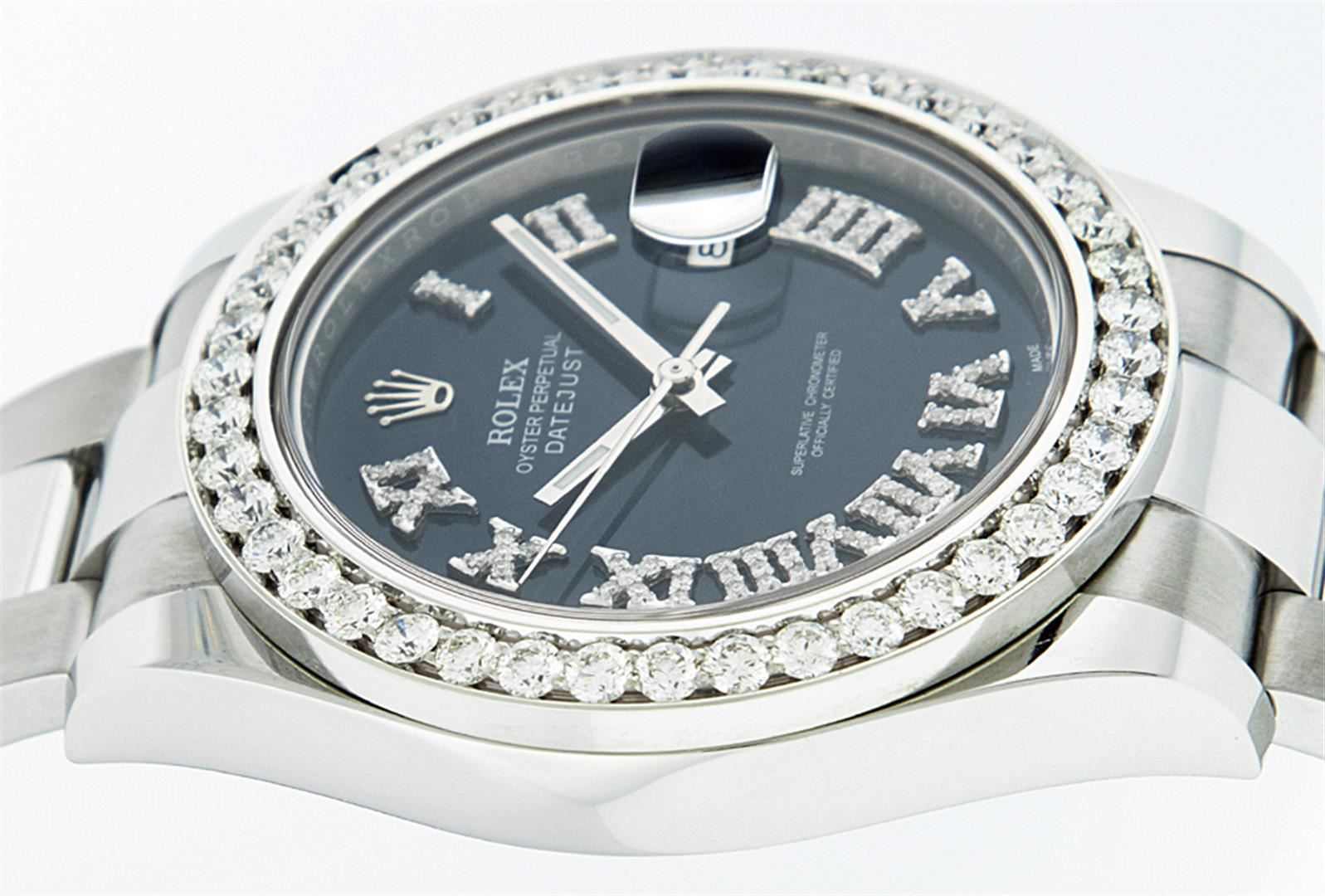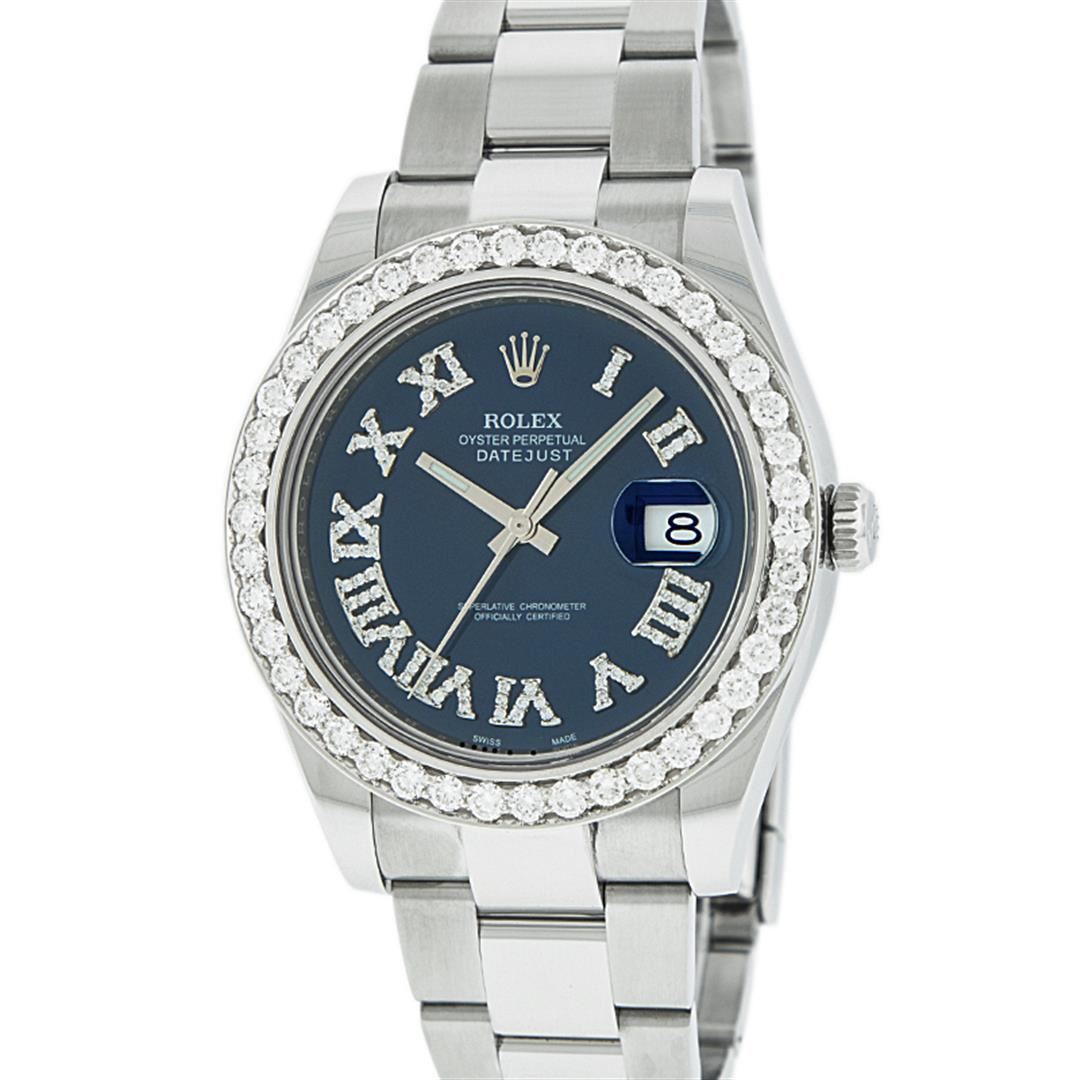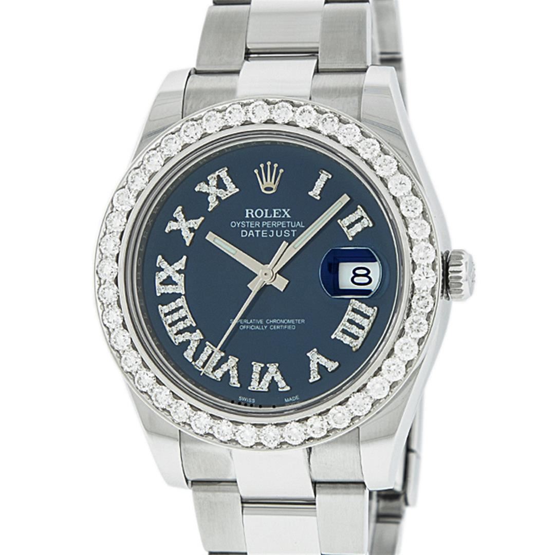 One Mens Pre Owned Rolex Datejust 2 Polished Bright with Shiny Finish, Serviced & Electronically Tested, Stainless Steel Case: 41mm, Stainless Steel Crown, Custom Bezel: New Stainless Steel Beadset Diamond Bezel, Diamond Count: 42 Diamonds On Bezel. Crystal: Sapphire With Magnified Date Window. Rolex Movement: Automatic Winding Movement. Custom Dial: Blue With Custom Added Diamond Roman Hour Markers. Date Window: 3 O'Clock Position Date Display, Quickset, Model: Datejust 2. Condition: G-6 Extra Fine. Rolex Bracelet: Stainless Steel Oyster Band. Bright Polish & Satin Finish. 7.5 Inch Length, Adjustable. Standard Clasp, With Rolex Logo. This Watch Has Been Serviced Time Tested And Is In Excellent Condition It Is Free Of All Scratches And Dents.