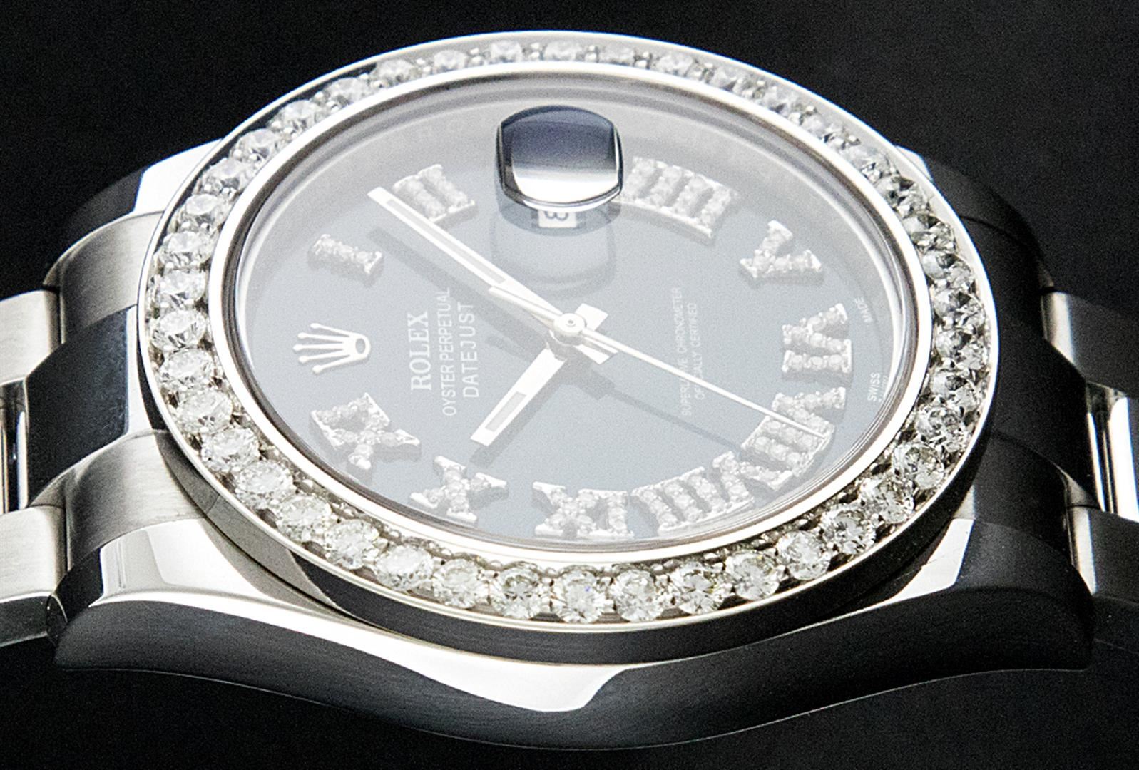 One Mens Pre Owned Rolex Datejust 2 Polished Bright with Shiny Finish, Serviced & Electronically Tested, Stainless Steel Case: 41mm, Stainless Steel Crown, Custom Bezel: New Stainless Steel Beadset Diamond Bezel, Diamond Count: 42 Diamonds On Bezel. Crystal: Sapphire With Magnified Date Window. Rolex Movement: Automatic Winding Movement. Custom Dial: Blue With Custom Added Diamond Roman Hour Markers. Date Window: 3 O'Clock Position Date Display, Quickset, Model: Datejust 2. Condition: G-6 Extra Fine. Rolex Bracelet: Stainless Steel Oyster Band. Bright Polish & Satin Finish. 7.5 Inch Length, Adjustable. Standard Clasp, With Rolex Logo. This Watch Has Been Serviced Time Tested And Is In Excellent Condition It Is Free Of All Scratches And Dents.