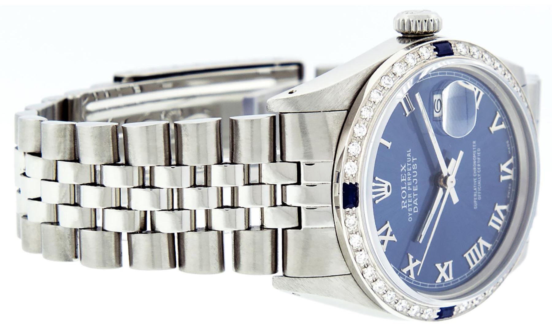 One Mens Stainless Steel Rolex Datejust Polished Bright with Satin Finish, This Watch Has Been Serviced & Electronically Tested, Stainless Steel Case: 36mm, Stainless Steel Crown, Custom Bezel: New 18K White Gold Sapphire Beadset Diamond Bezel, Diamond + Gem Count: 36 Diamonds + 4 Sapphires. Custom Crystal: New Sapphire With Magnified Date Window. Custom Hands: New Luminescent Hands. Rolex Movement: Automatic Winding Movement 3035. Custom Dial: Blue Roman With Square Track. Date Window: 3 O'Clock Position Date Display, Quickset, Model: Quickset Datejust, Condition: G-6 Extra Fine. Bracelet: Stainless Steel Jubilee Band. Bracelet: 7.0 Inch Length, Adjustable. Standard Clasp, With Rolex Logo. This Watch Has Been Serviced Time Tested And Is In Excellent Condition It Is Free Of All Scratches And Dents.