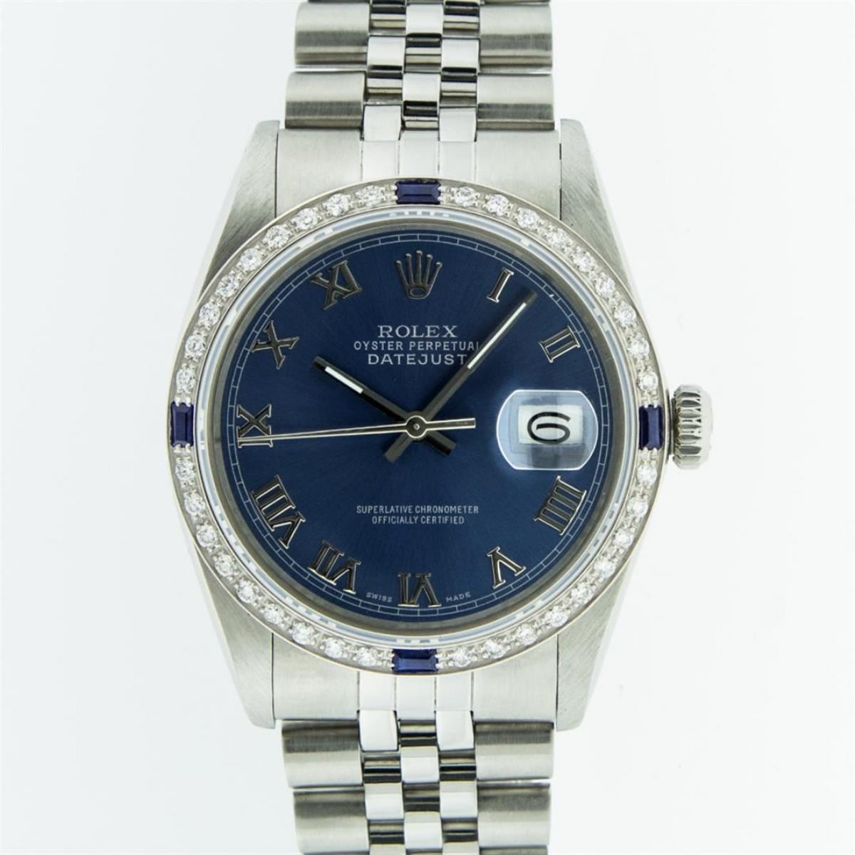One Mens Stainless Steel Rolex Datejust Polished Bright with Satin Finish, This Watch Has Been Serviced & Electronically Tested, Stainless Steel Case: 36mm, Stainless Steel Crown, Custom Bezel: New 18K White Gold Sapphire Beadset Diamond Bezel, Diamond + Gem Count: 36 Diamonds + 4 Sapphires, Total Weight 1.00 Carat, Clarity: SI-VS, Color: G to H. Custom Crystal: New Scratch Resistant Synthetic Sapphire Cyclops Lens. Custom Hands: New Luminescent Hands. Movement: Automatic Winding Movement. Custom Dial: Blue Roman With Square Track. Date Window: 3 O'Clock Position Date Display, Quickset, Model: Datejust, Condition: G-6 Extra Fine. Bracelet: Stainless Steel Jubilee Band. Bracelet: 7.0 Inch Length, Adjustable. Standard Clasp, With Rolex Logo. This Watch Has Been Serviced Time Tested And Is In Excellent Condition It Is Free Of All Scratches And Dents.