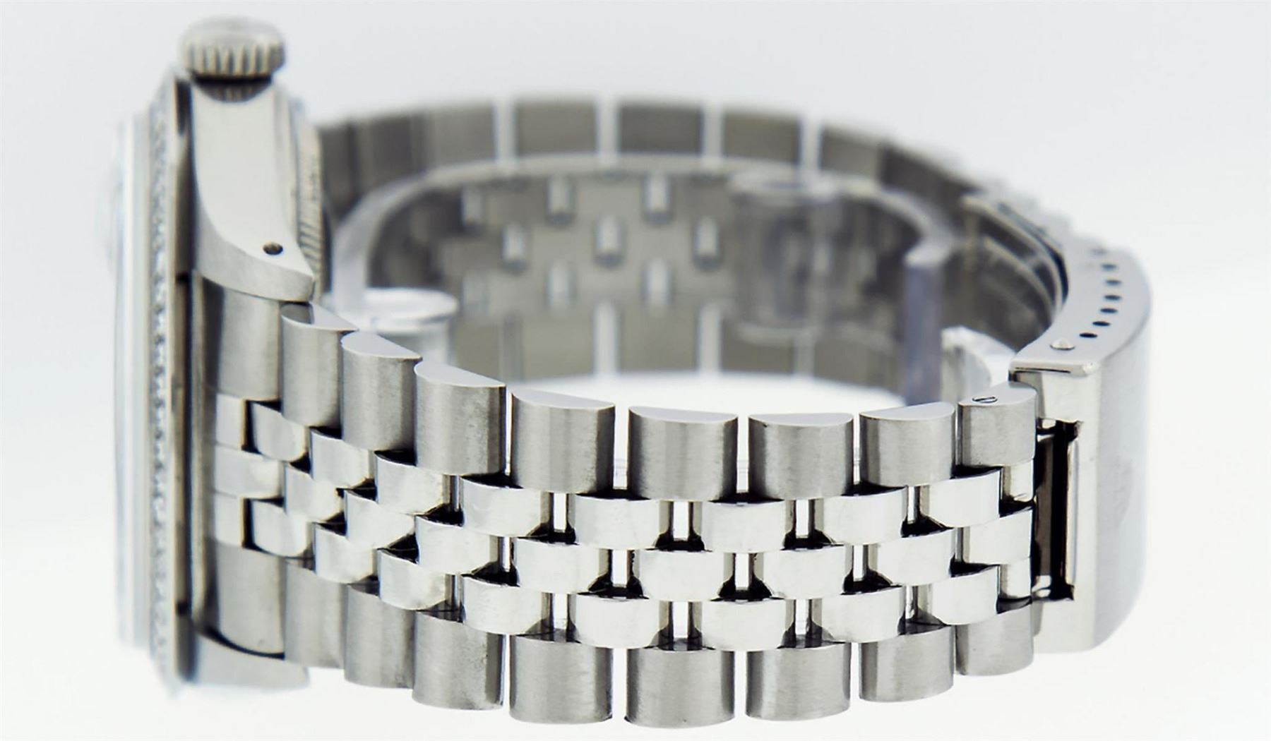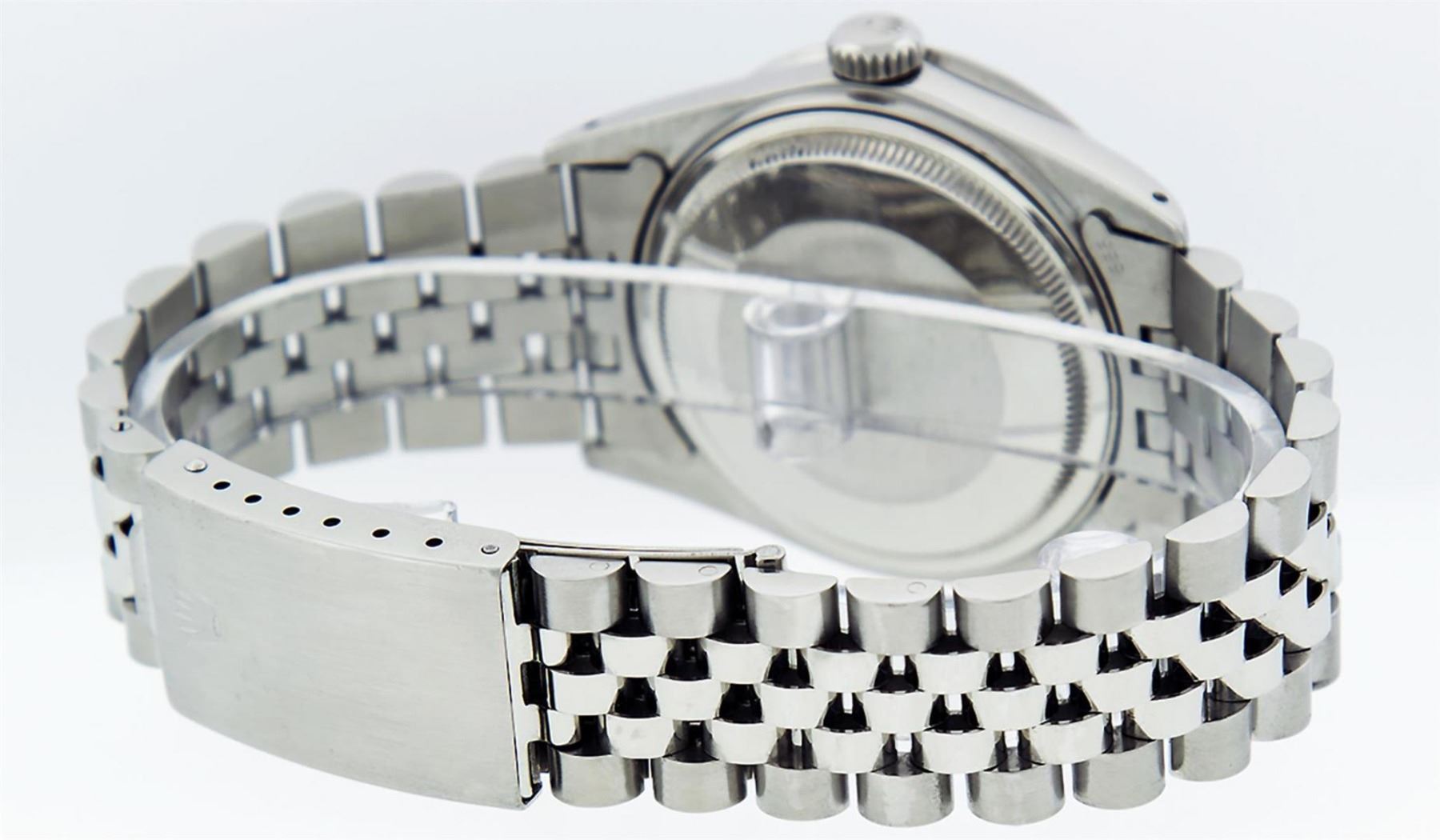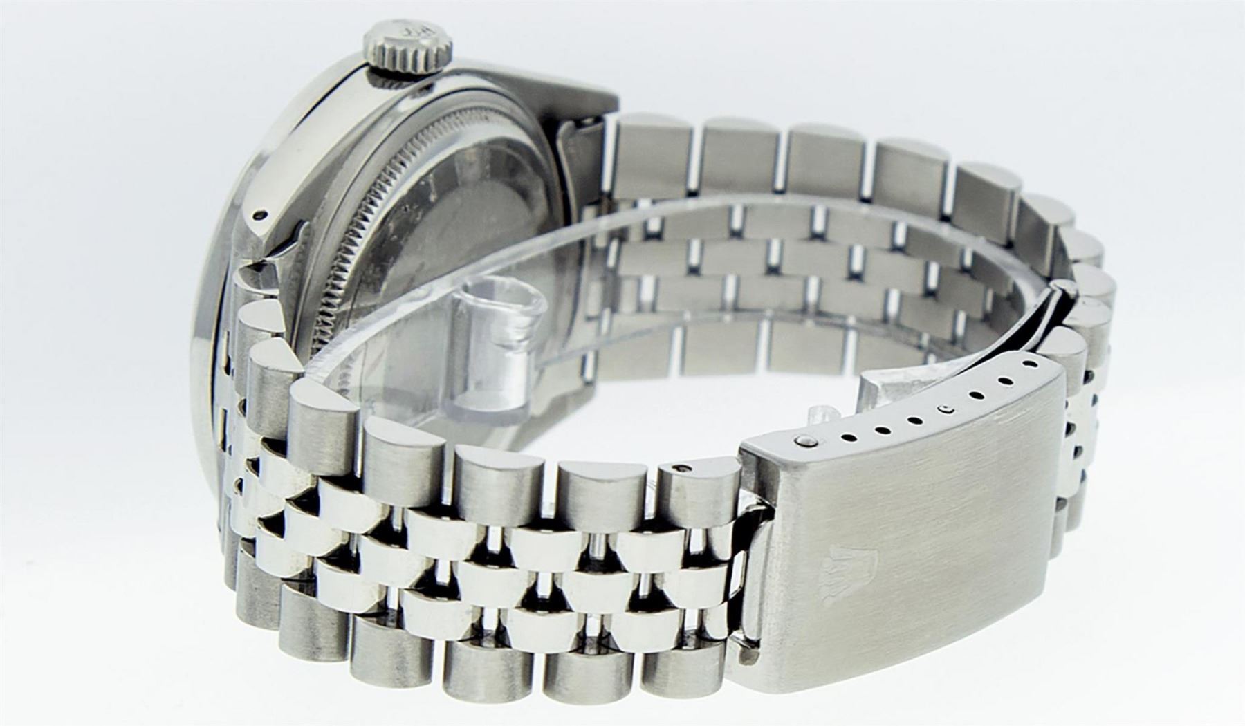 One Mens Rolex Stainless Steel Datejust Polished Bright with Satin Finish, This Watch Has Been Serviced & Electronically Tested, Stainless Steel Case: 36mm, Stainless Steel Crown, Custom Bezel: Stainless Steel Beadset Diamond Bezel, Diamond Count: 54 Diamonds, Total Weight 1.00 Carat, Clarity: SI-VS, Color: G to H. Custom Crystal: New Synthetic Sapphire Cyclops Lens. Custom Hands: New Luminescent Hands. Movement: Automatic Winding Movement. Custom Dial: Blue String Diamond Dial, Diamond Count: 58 Diamonds In Dial, Color: G to H, Clarity: VS2-SI1. Date Window: 3 O'Clock Position Date Display, Quickset, Model: Datejust. Condition: G-6 Extra Fine. Bracelet: Stainless Steel Jubilee Band. Bright Polish & Satin Finish. 7.0 Inch Length, Adjustable. Standard Clasp, With Rolex Logo. This Watch Has Been Serviced Time Tested And Is In Excellent Condition It Is Free Of All Scratches And Dents.