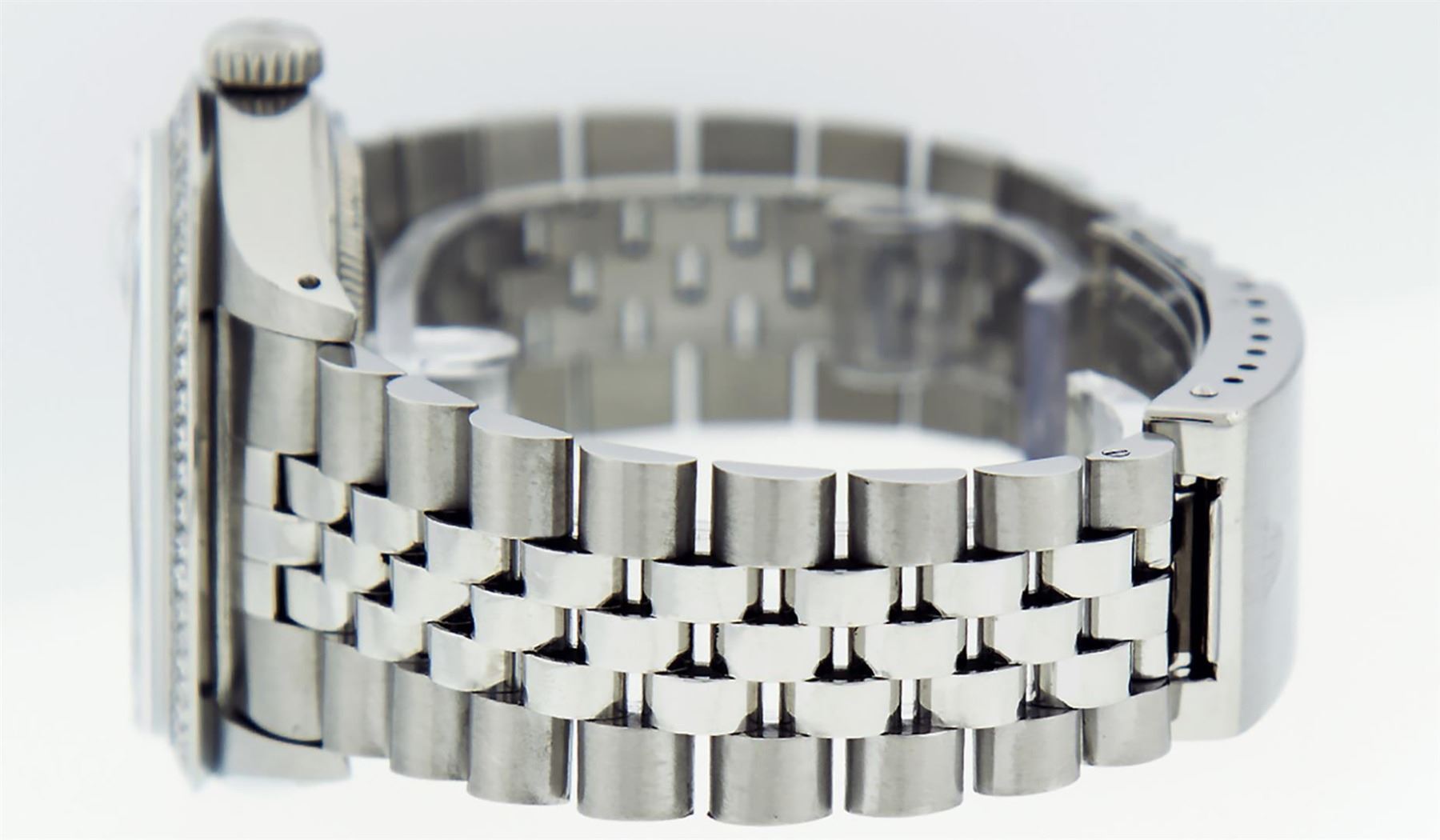 One Mens Rolex Stainless Steel Datejust Polished Bright with Satin Finish, This Watch Has Been Serviced & Electronically Tested, Stainless Steel Case: 36mm, Stainless Steel Crown, Custom Bezel: New Stainless Steel Beadset Diamond Bezel, Diamond Count: 54 Diamonds, Total Weight 1.00 Carat, Clarity: SI-VS, Color: G to H. Custom Crystal: New Synthetic Sapphire Cyclops Lens. Custom Hands: New Luminescent Hands. Movement: Automatic Winding Movement. Custom Dial: Blue String Diamond Dial, Diamond Count: 58 Diamonds In Dial, Color: G to H, Clarity: VS2-SI1. Date Window: 3 O'Clock Position Date Display, Quickset, Model: Datejust. Condition: G-6 Extra Fine. Bracelet: Stainless Steel Jubilee Band. Bright Polish & Satin Finish. 7.0 Inch Length, Adjustable. Standard Clasp, With Rolex Logo. This Watch Has Been Serviced Time Tested And Is In Excellent Condition It Is Free Of All Scratches And Dents.